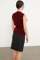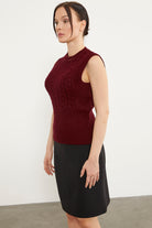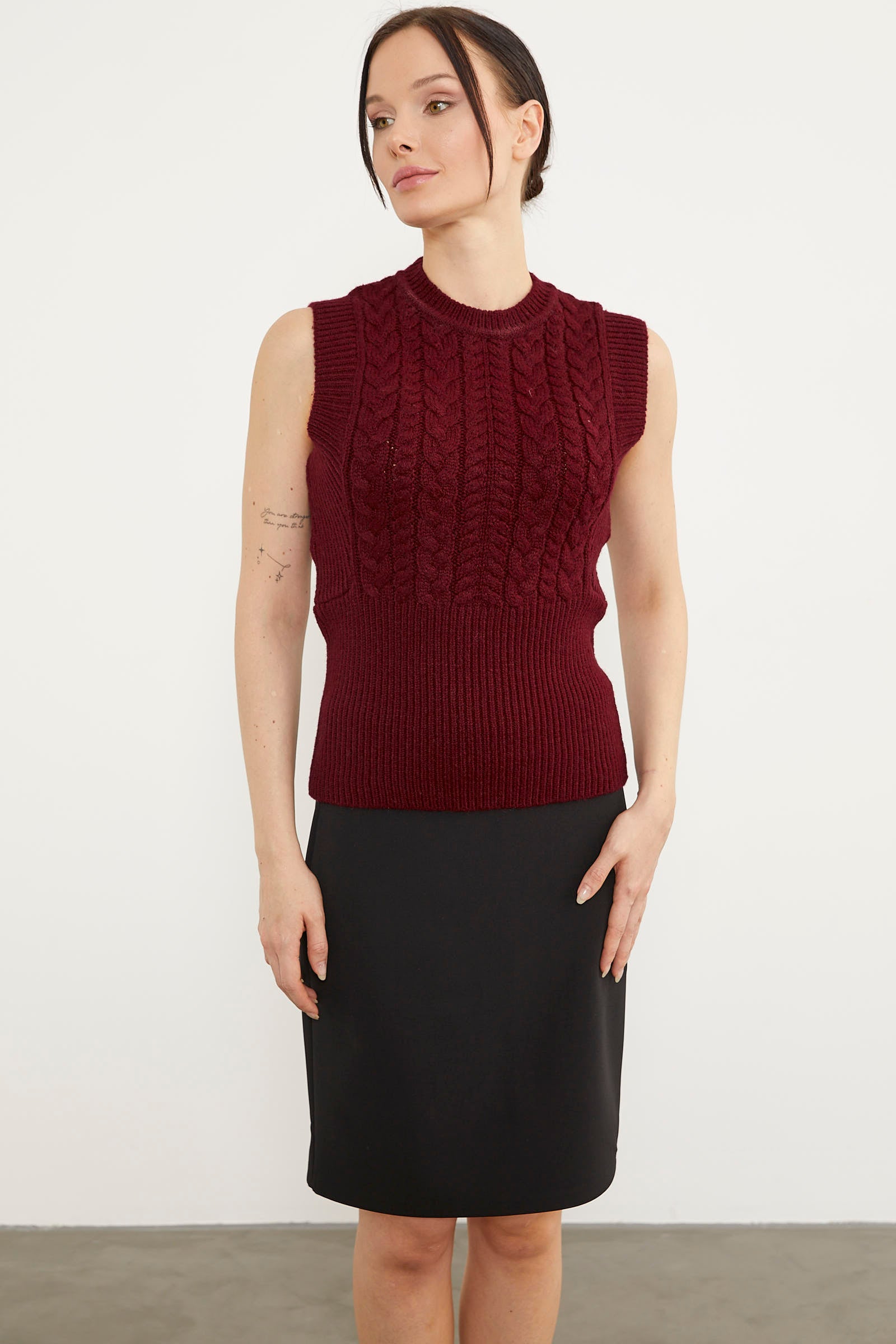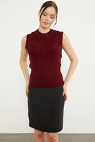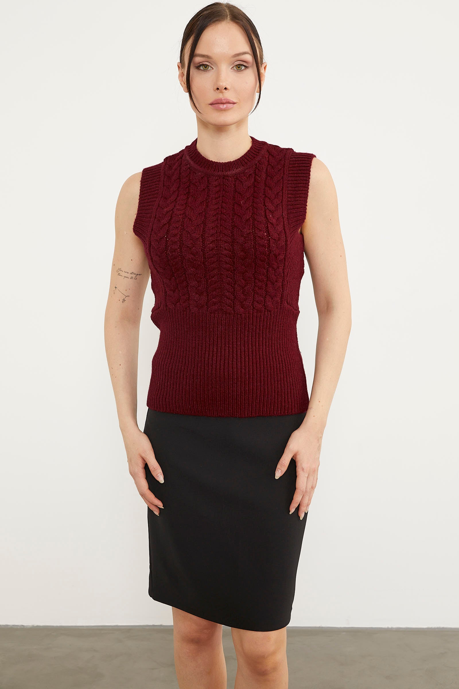 Bele Oturmalı Saç Örgü Triko Süveter - Bordo