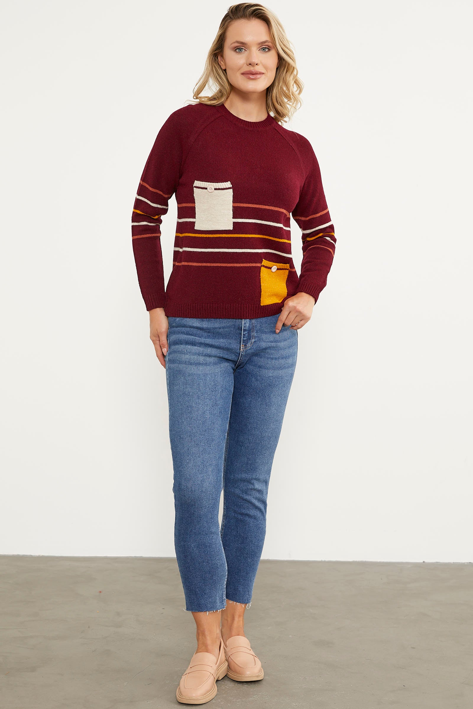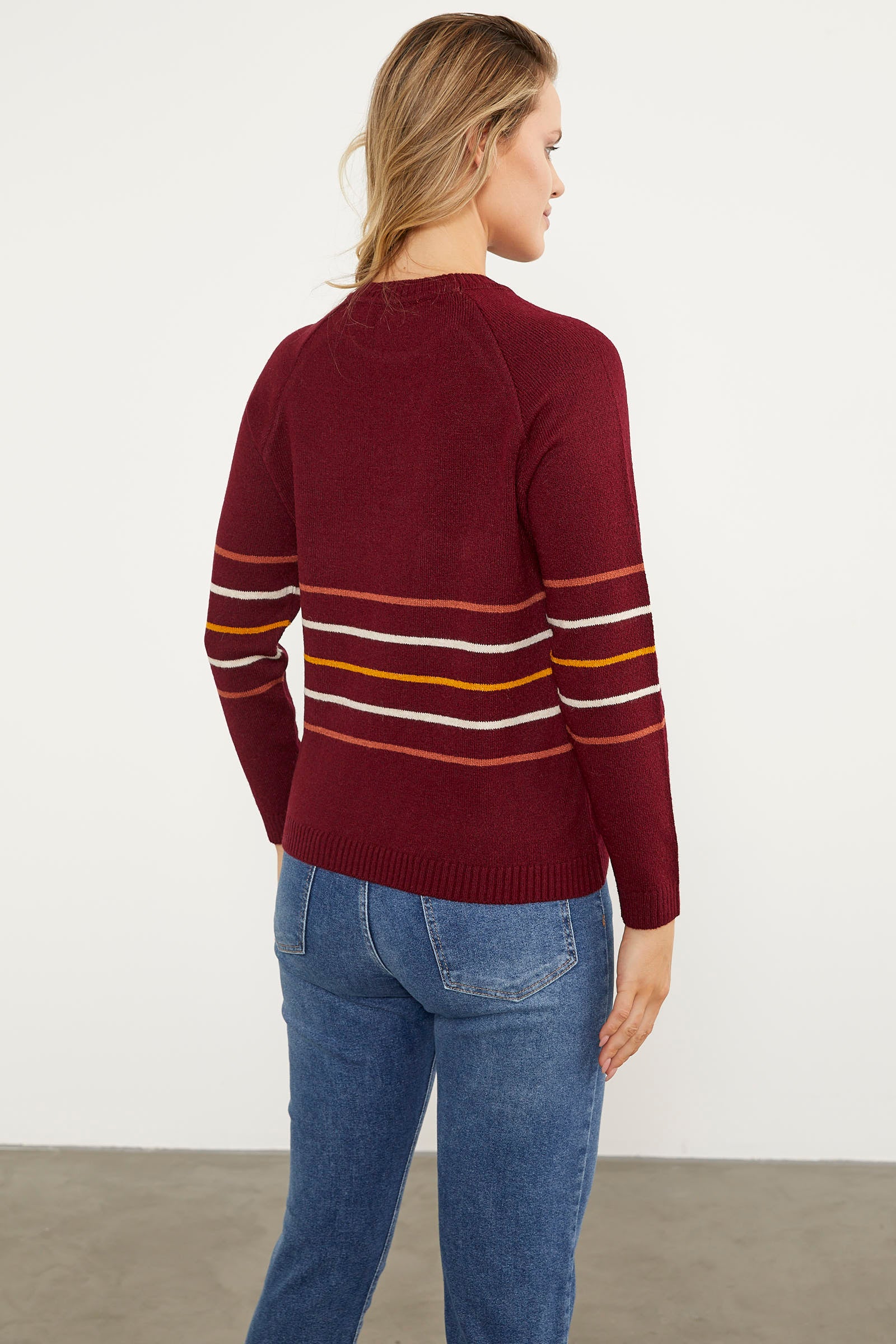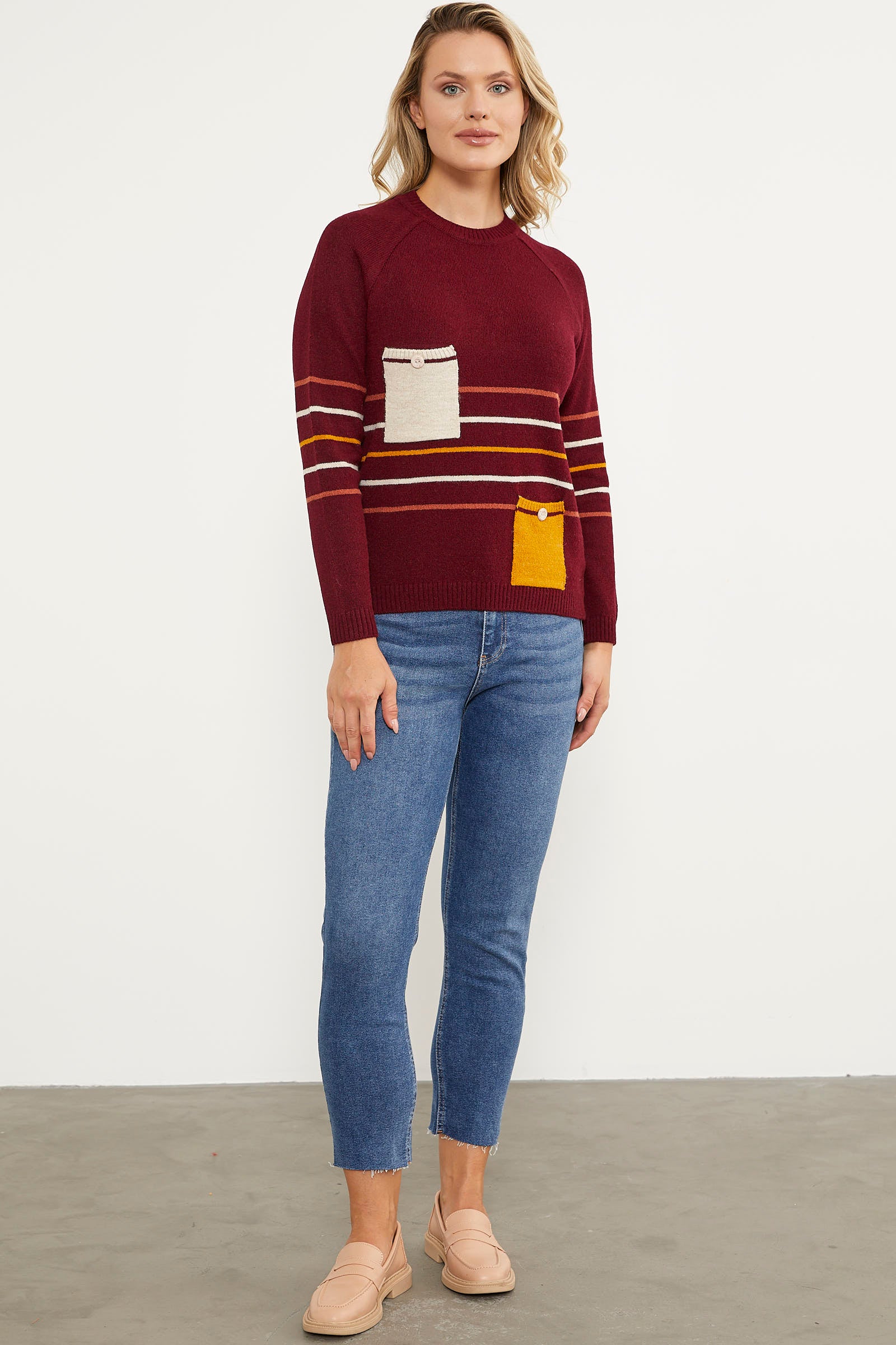 Blok Cepli Renk Çizgili Triko Kazak - Bordo