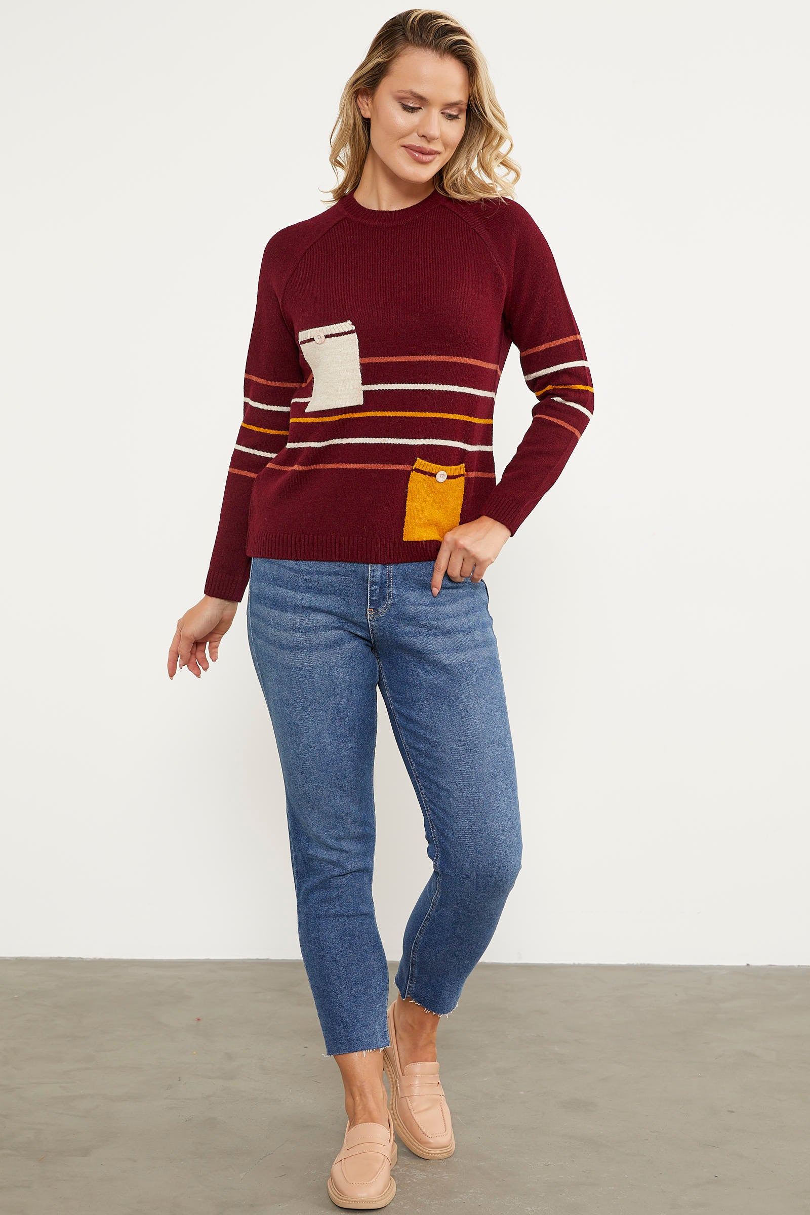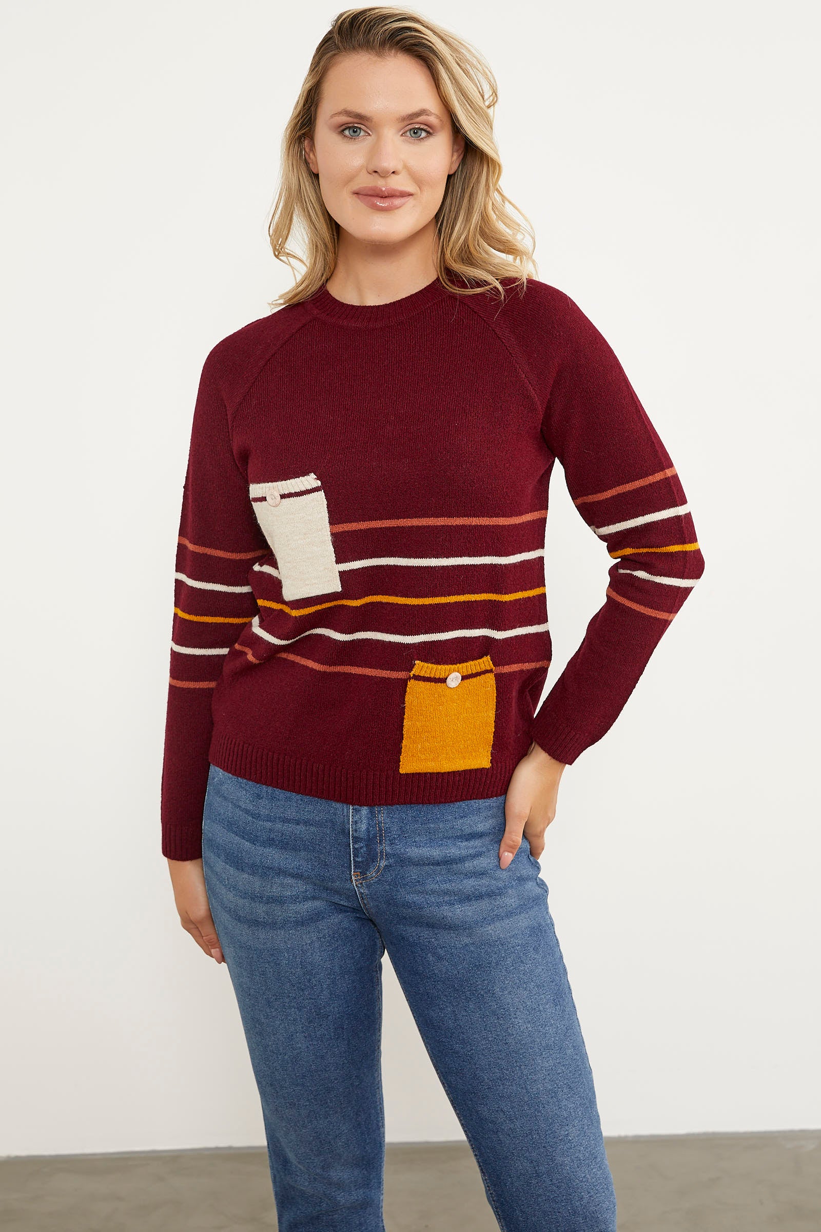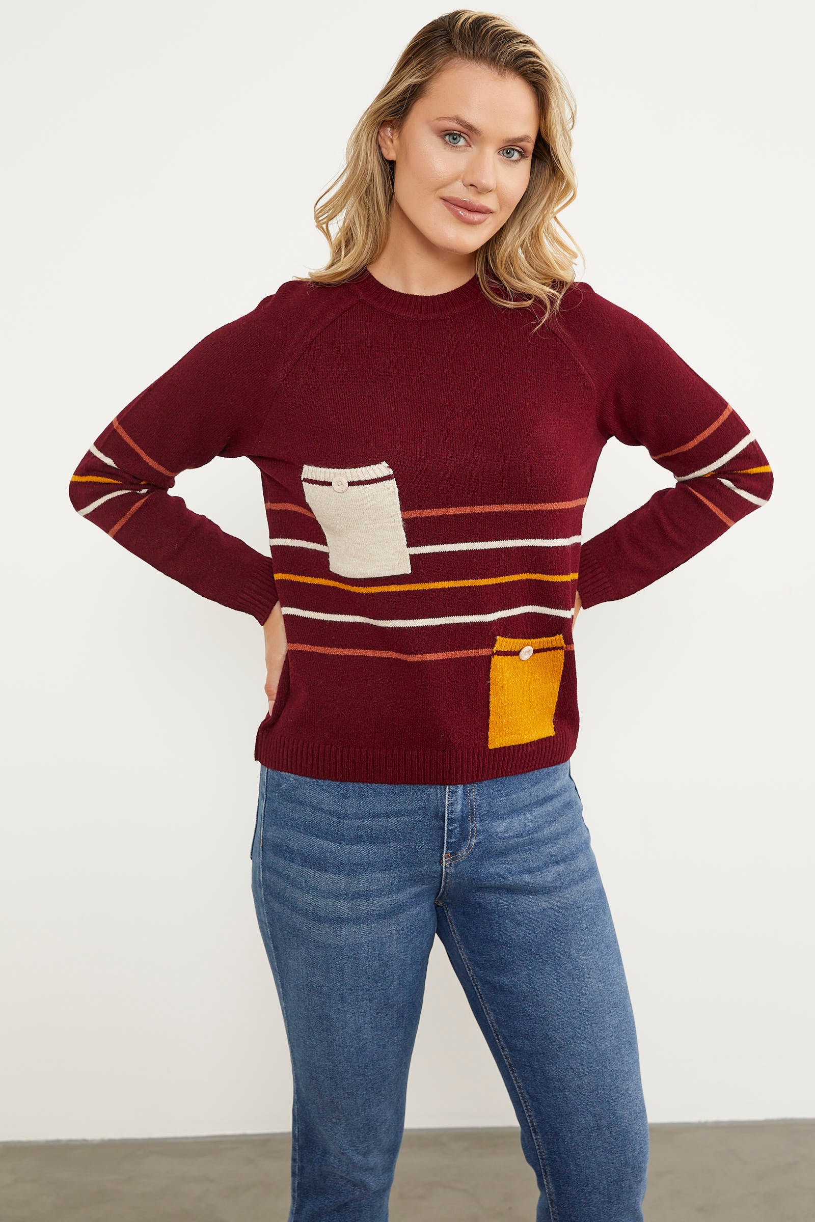 Blok Cepli Renk Çizgili Triko Kazak - Bordo