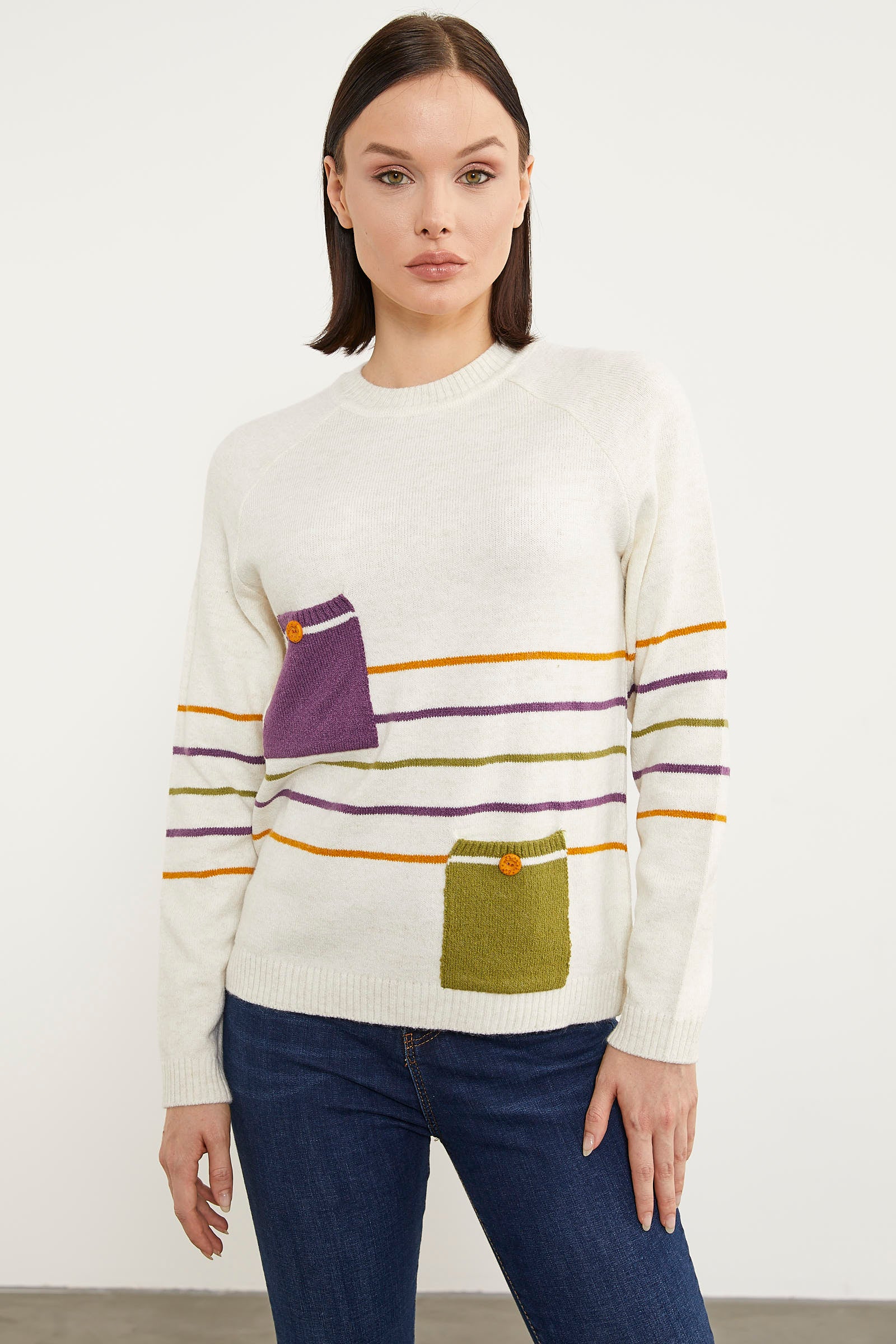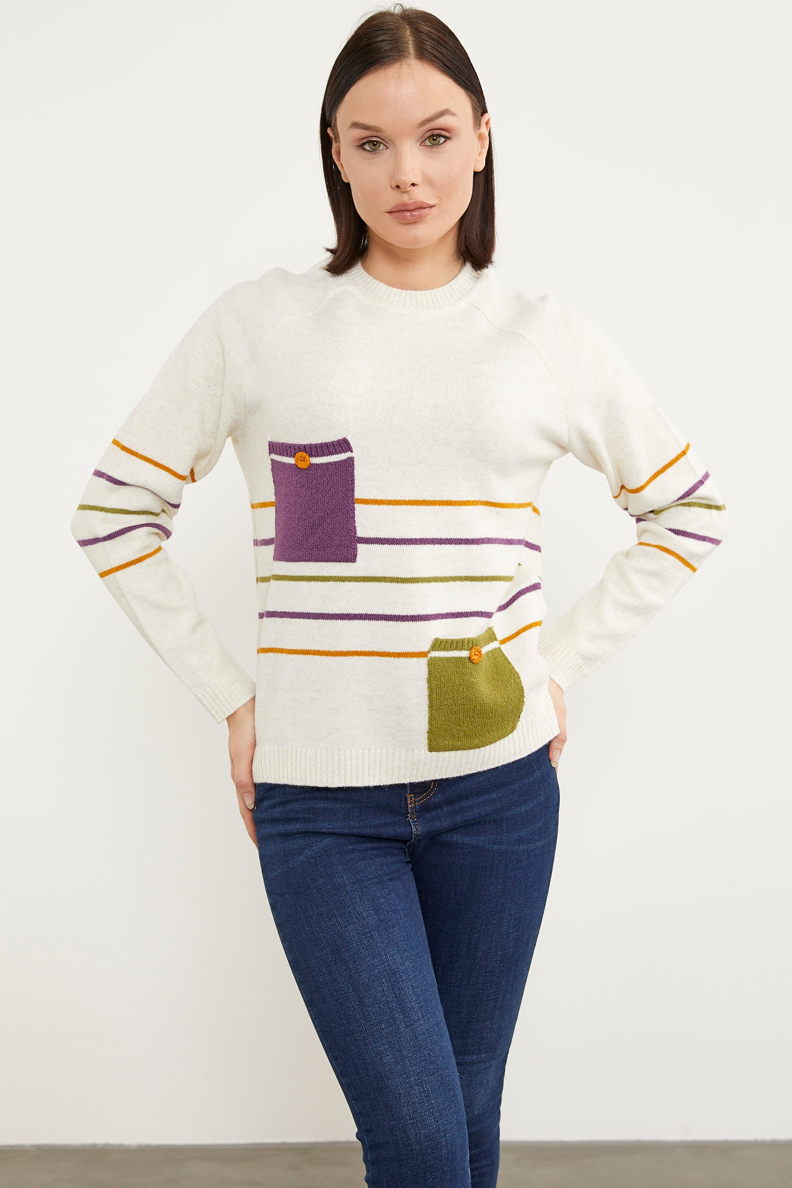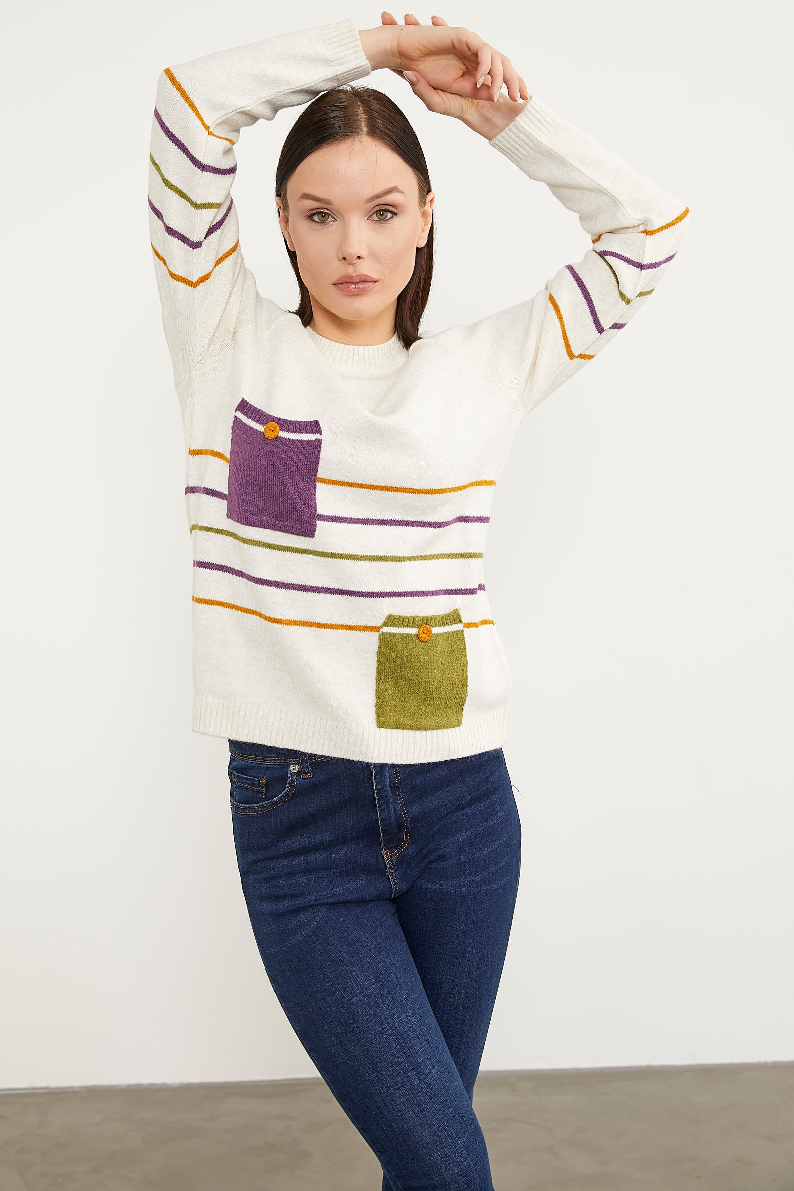 Blok Cepli Renk Çizgili Triko Kazak - Kemik