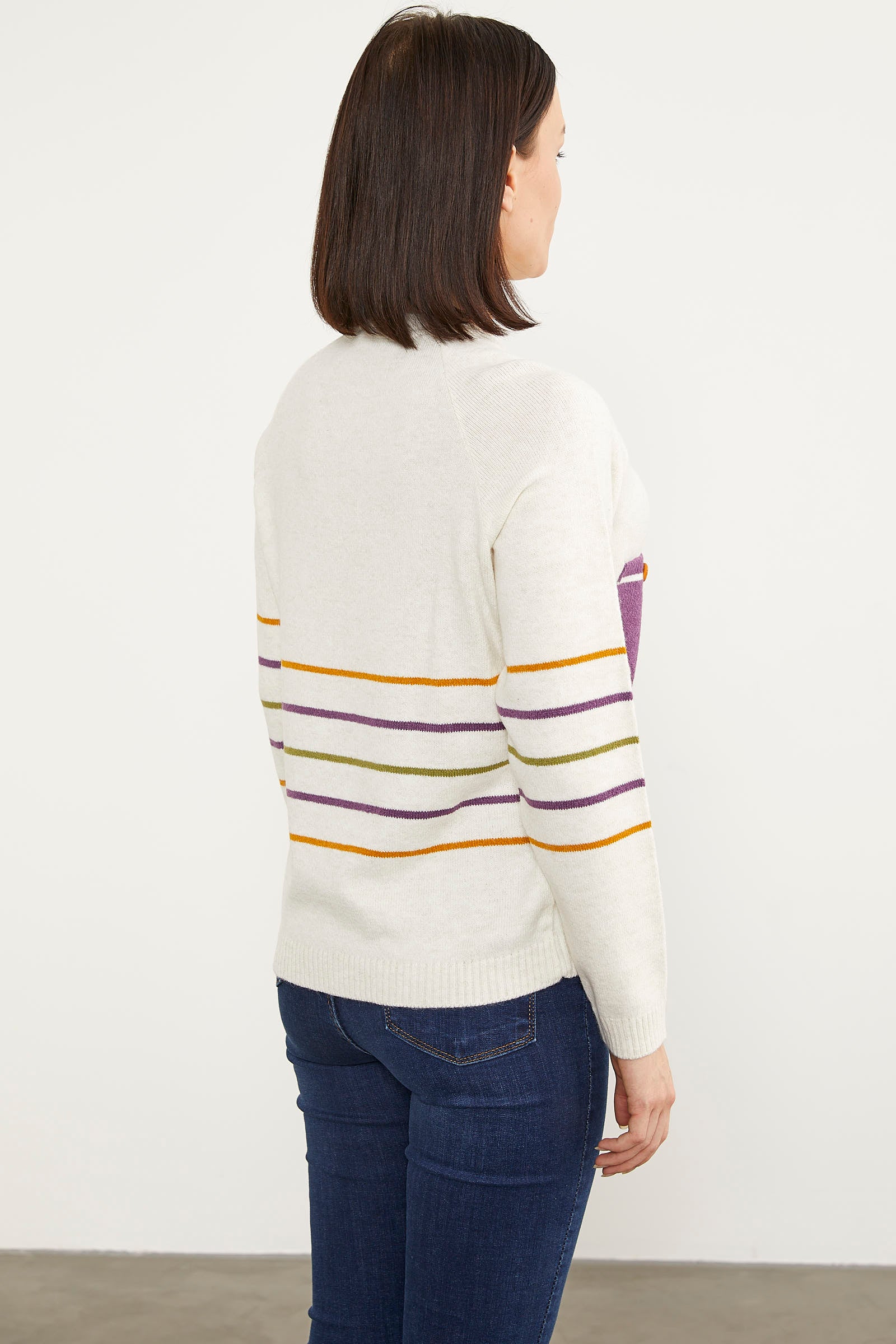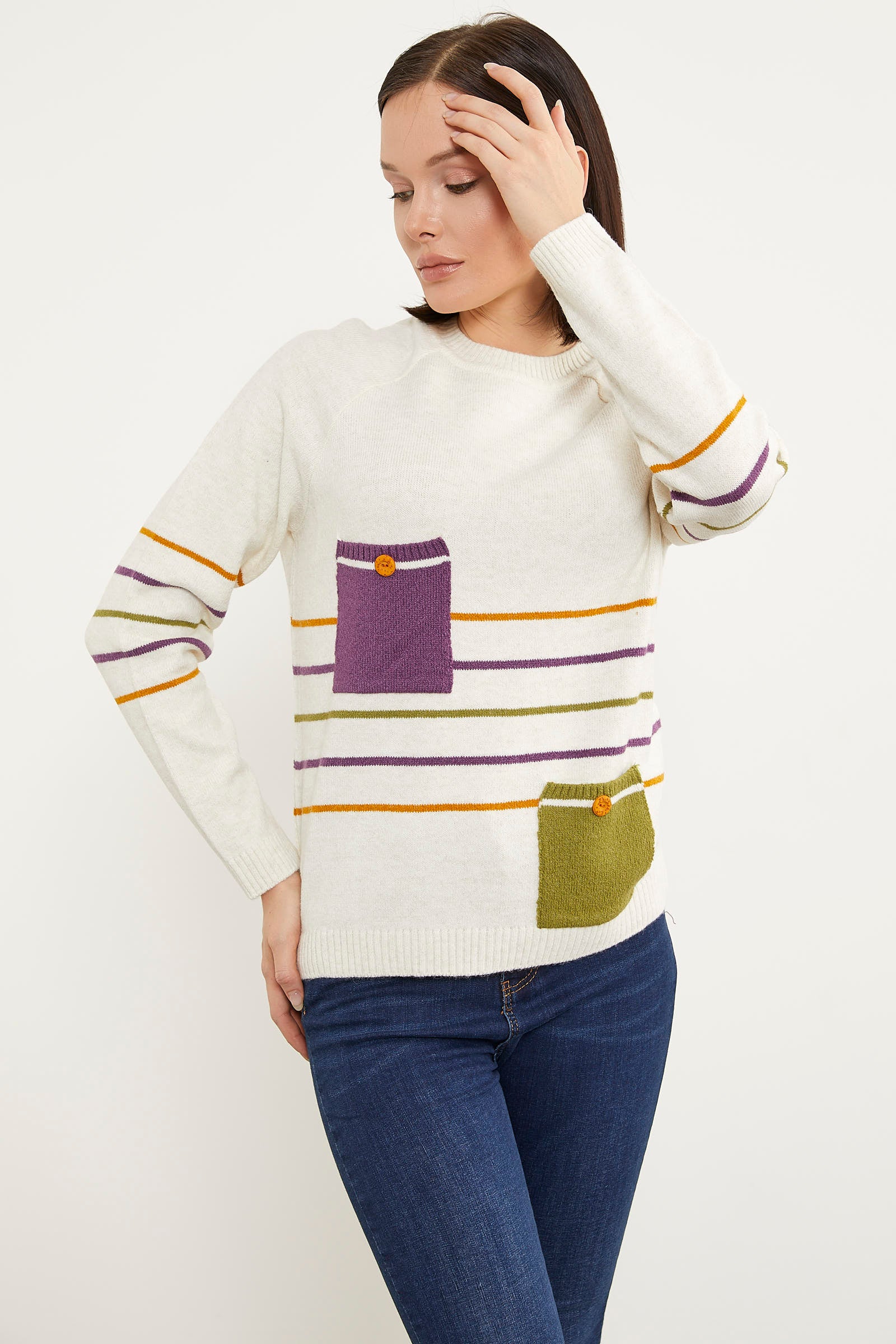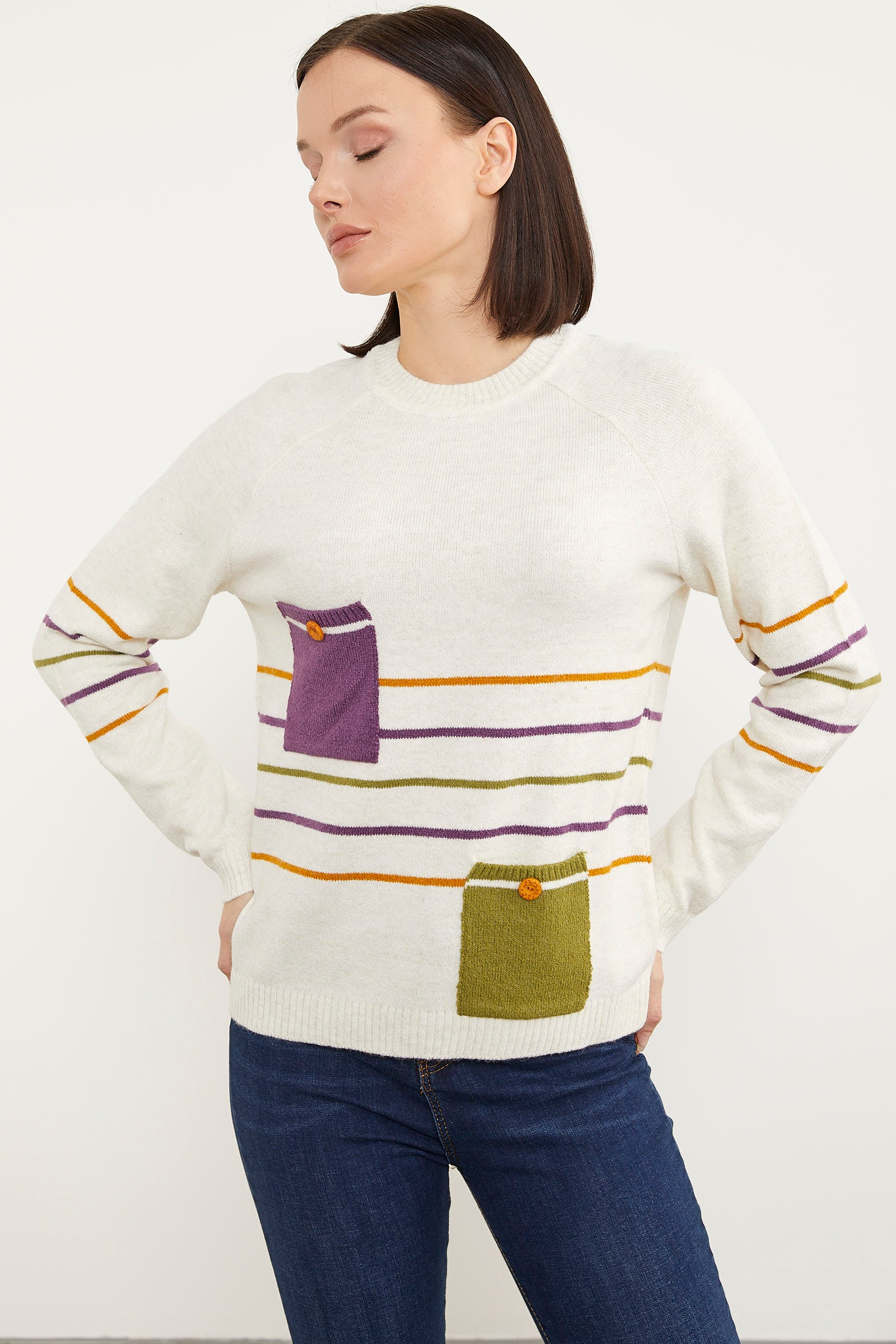 Blok Cepli Renk Çizgili Triko Kazak - Kemik