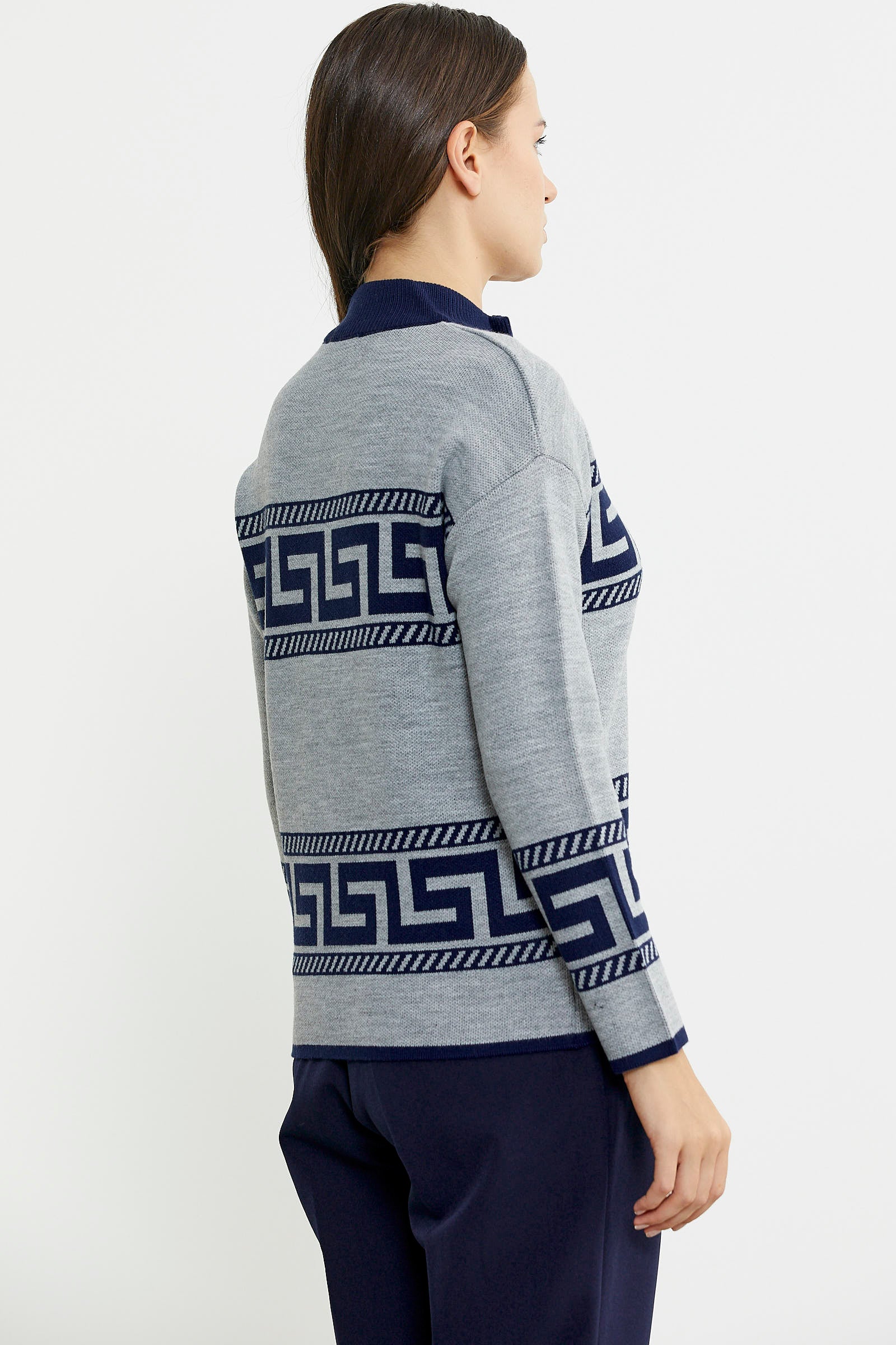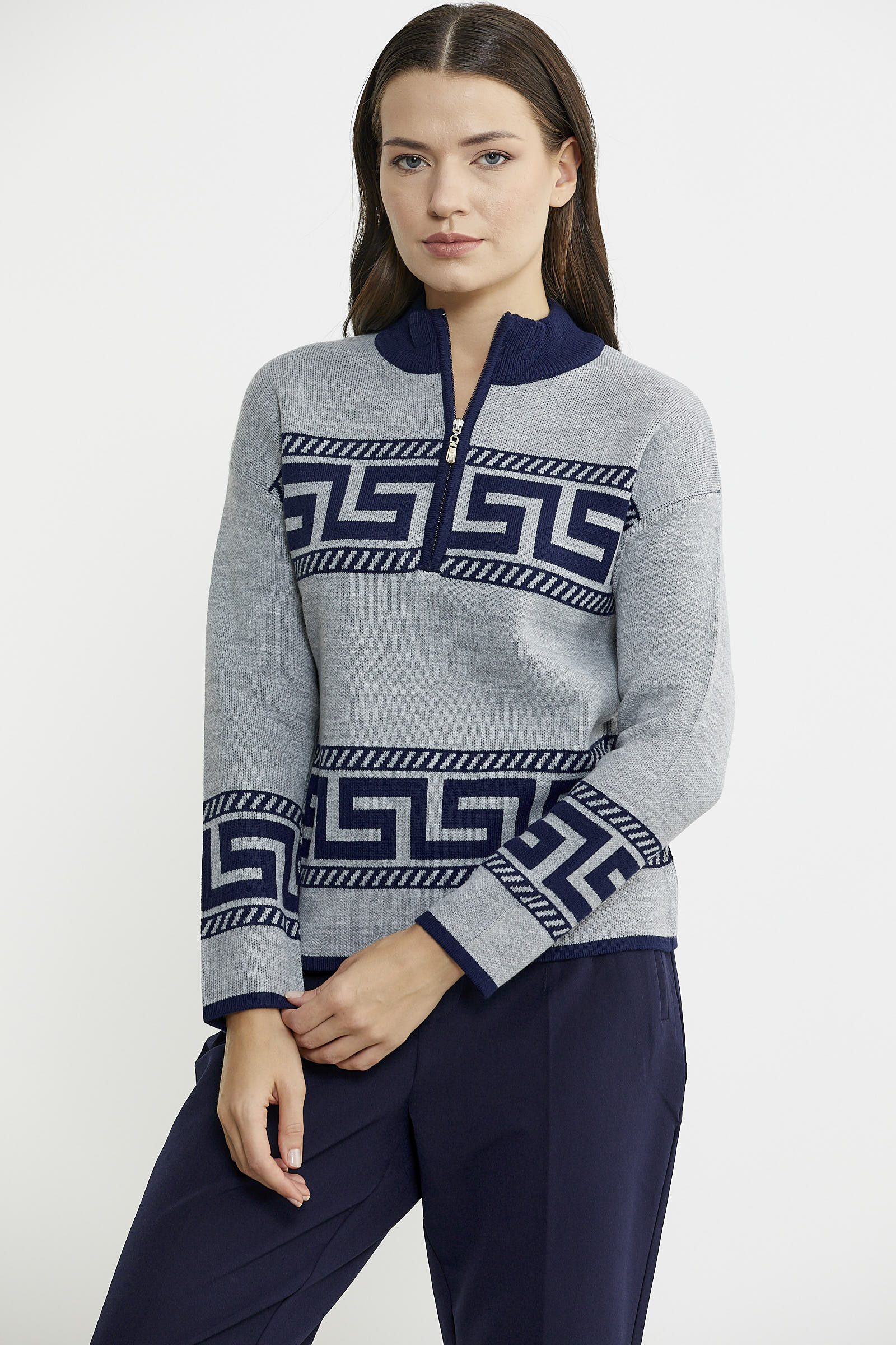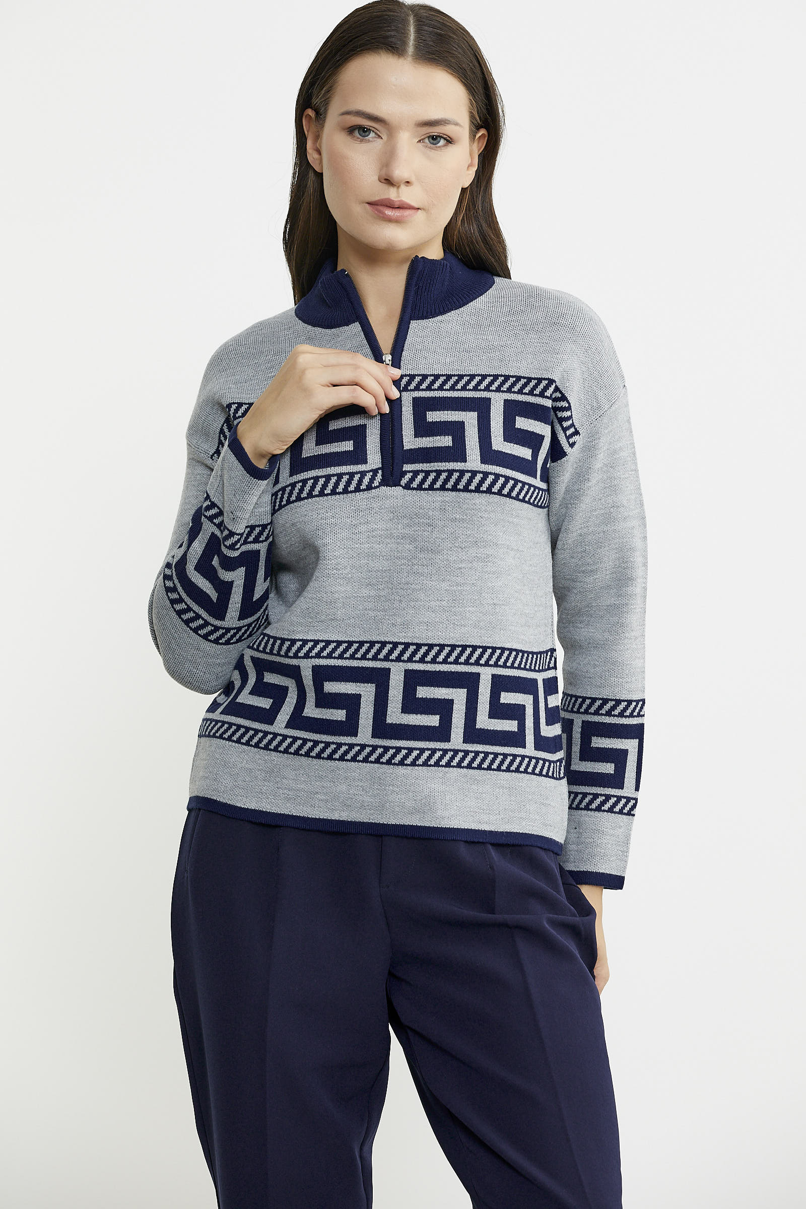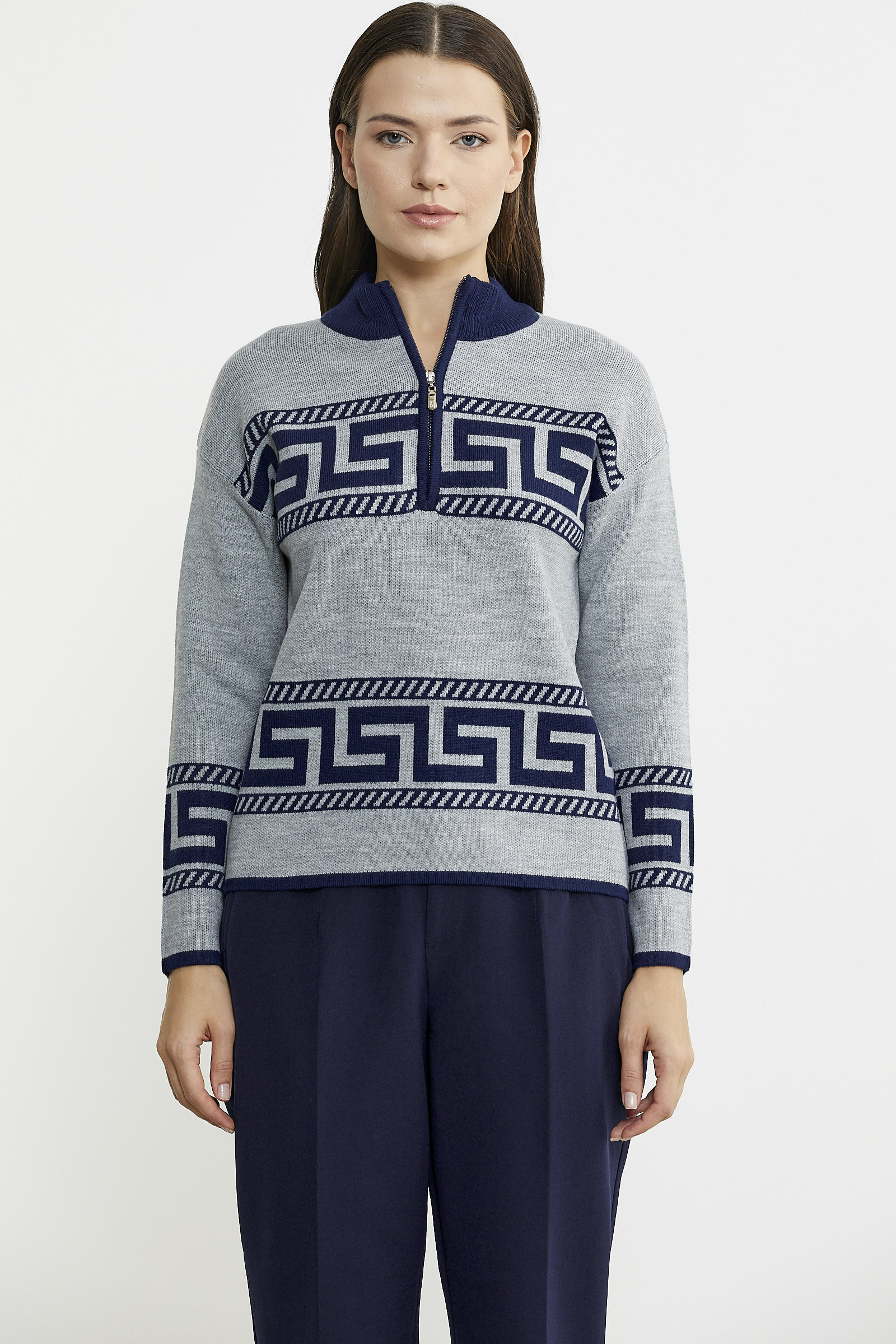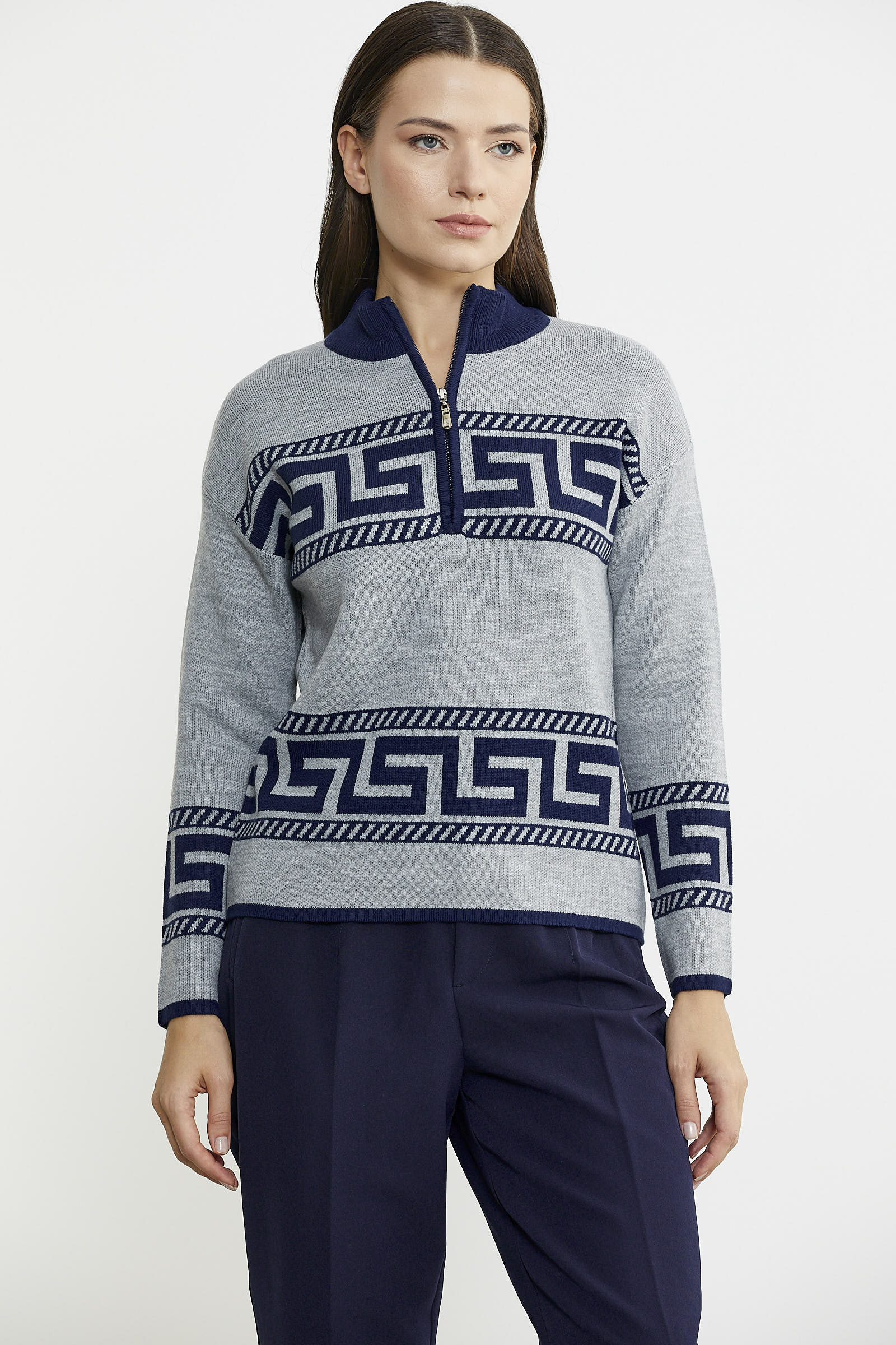 Blok Desenli Dik Yaka Triko Kazak - Gri