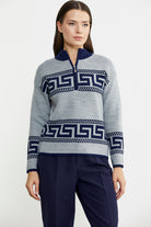 Dik yaka, yarım fermuar kapamalı triko kazak. Kol manşetlerinde ve bedende blok geçişler mevcut.