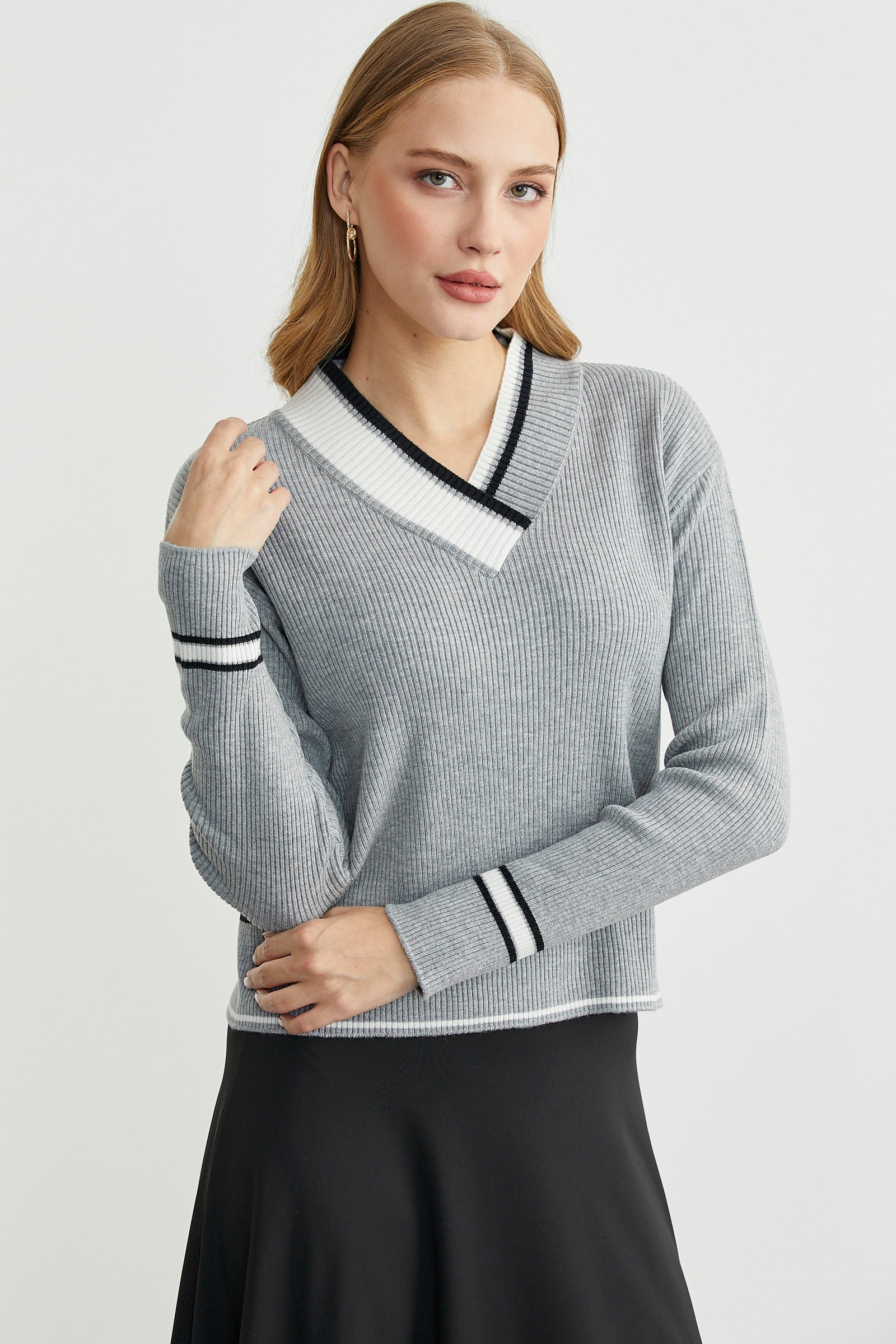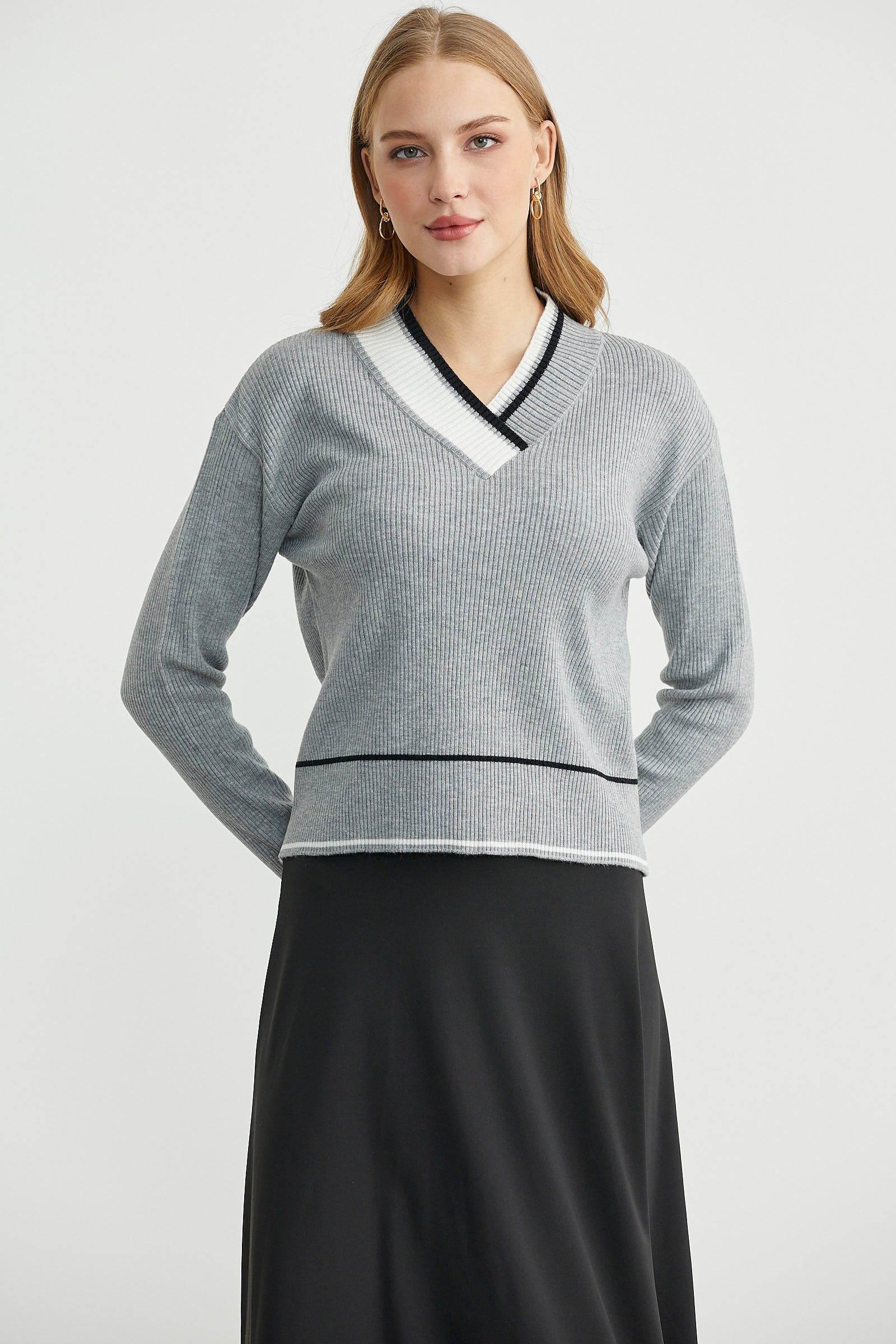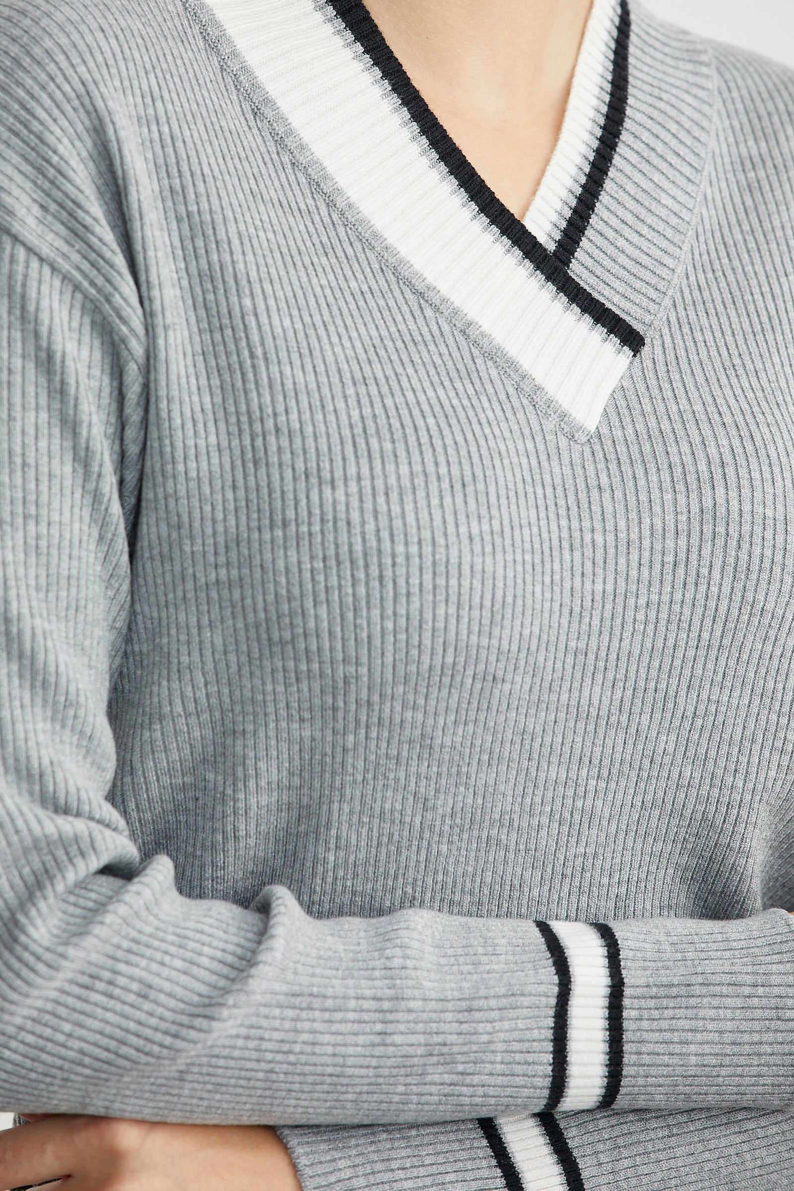 Blok Renk Kombinli Triko Kazak - Gri