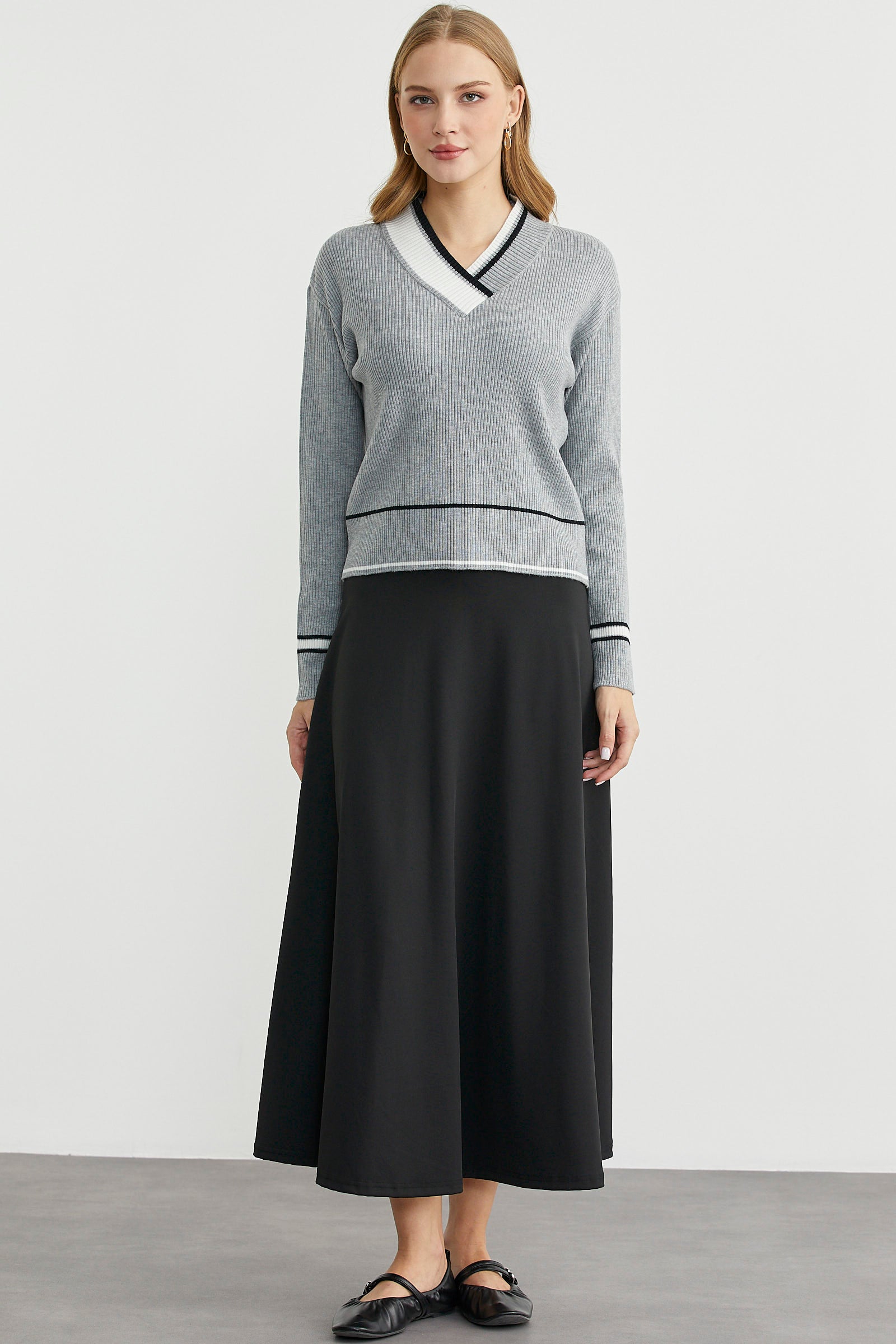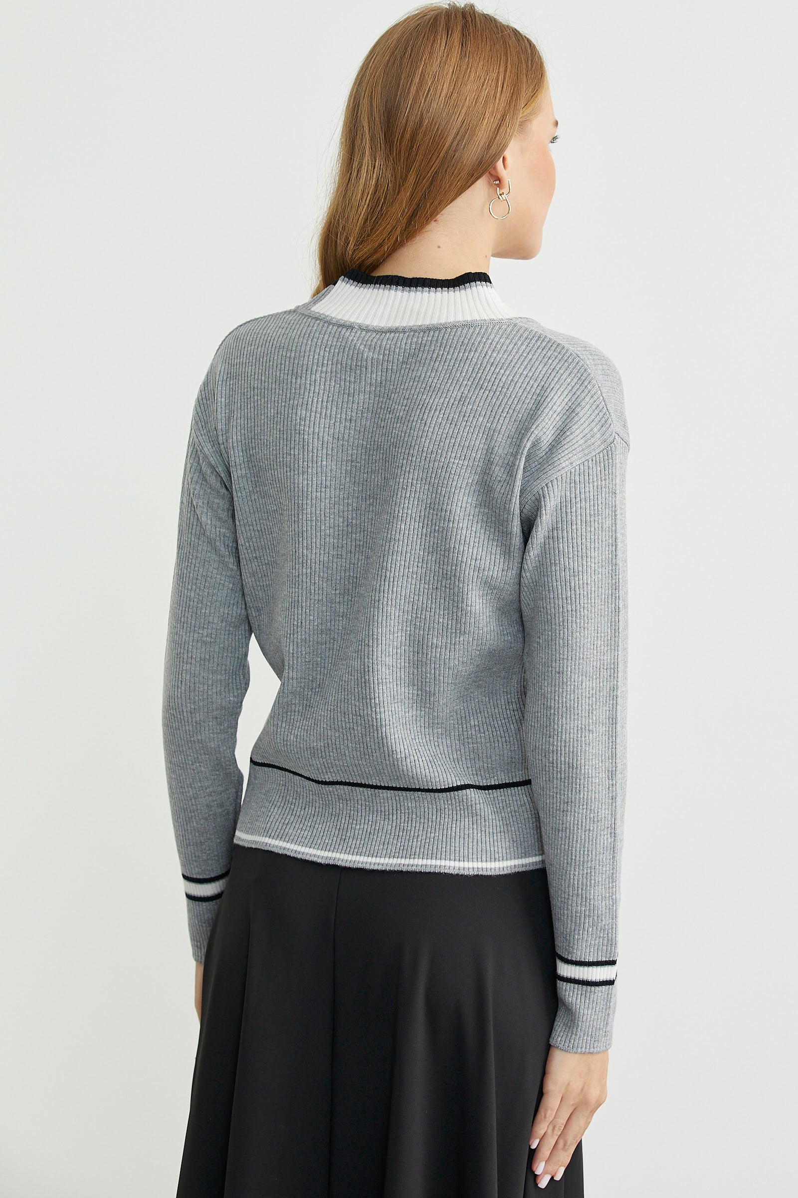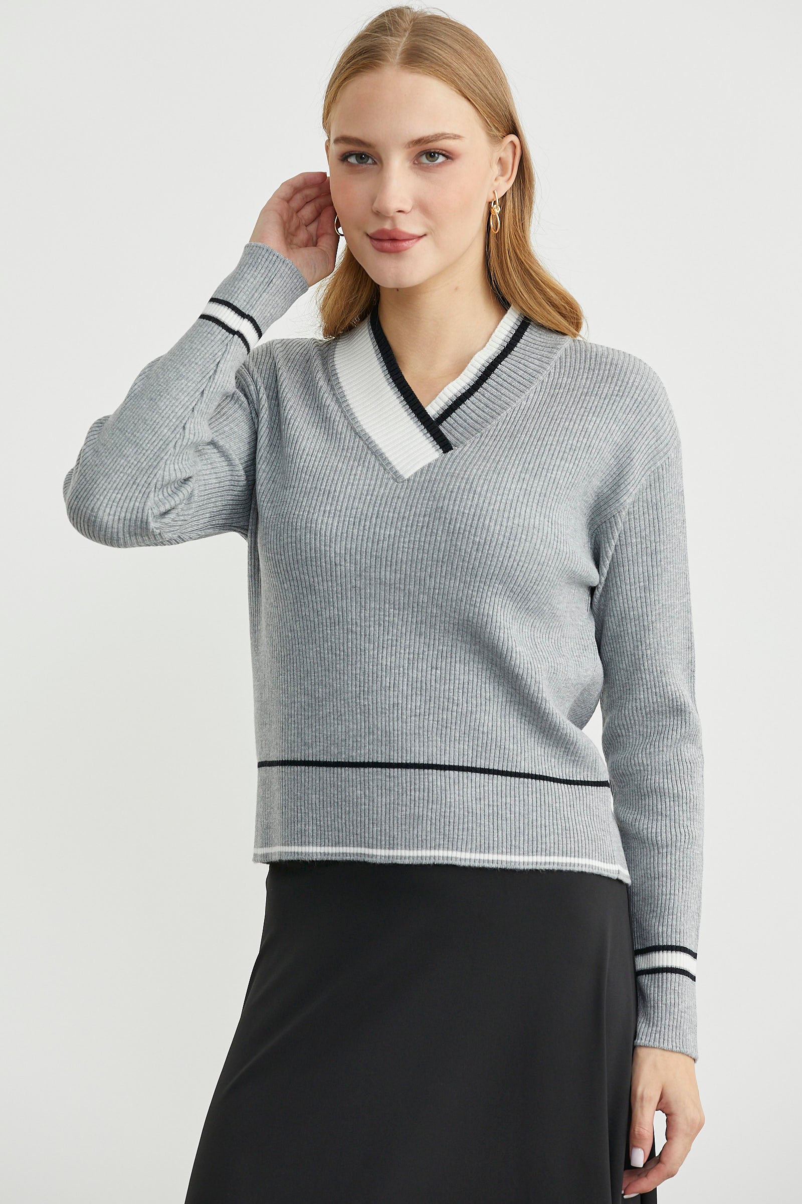 Blok Renk Kombinli Triko Kazak - Gri