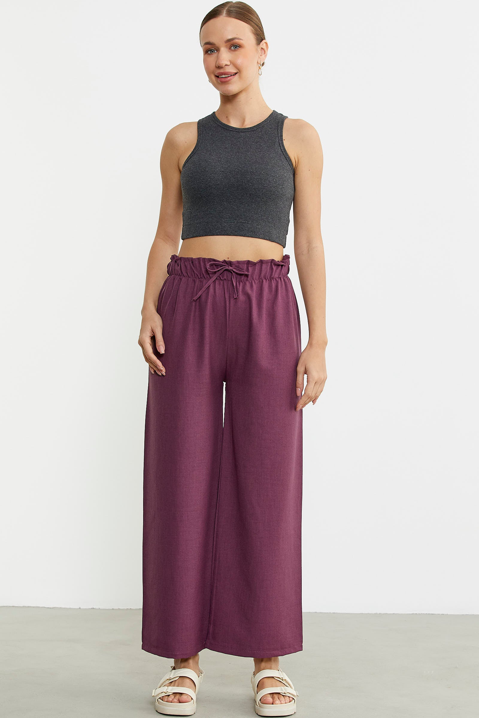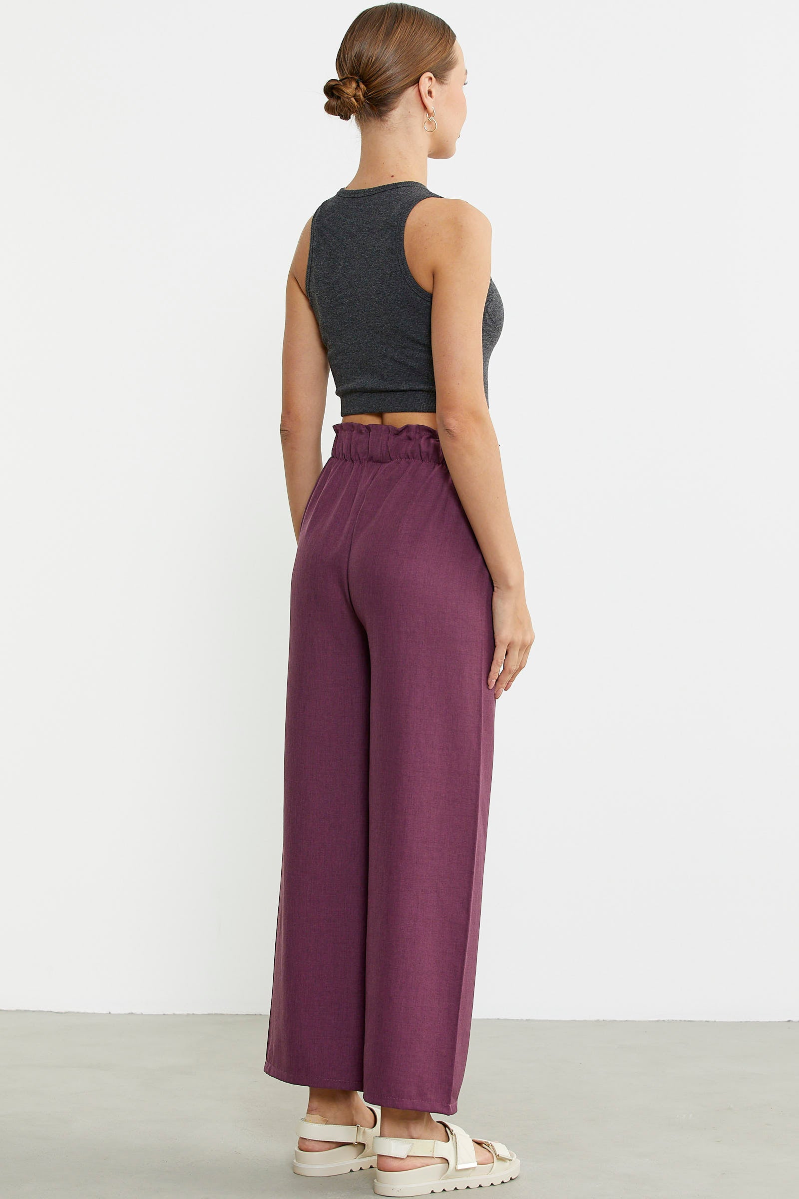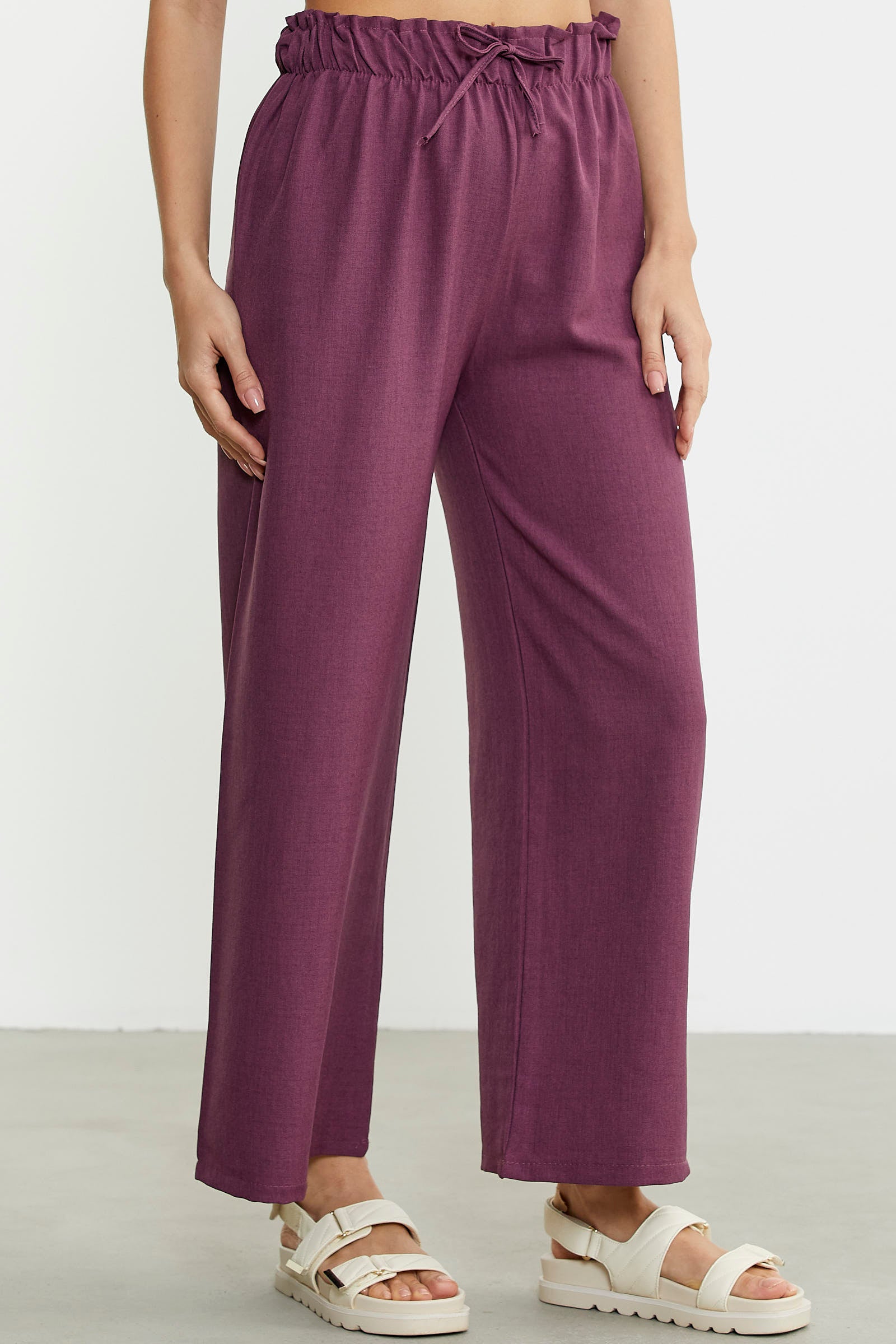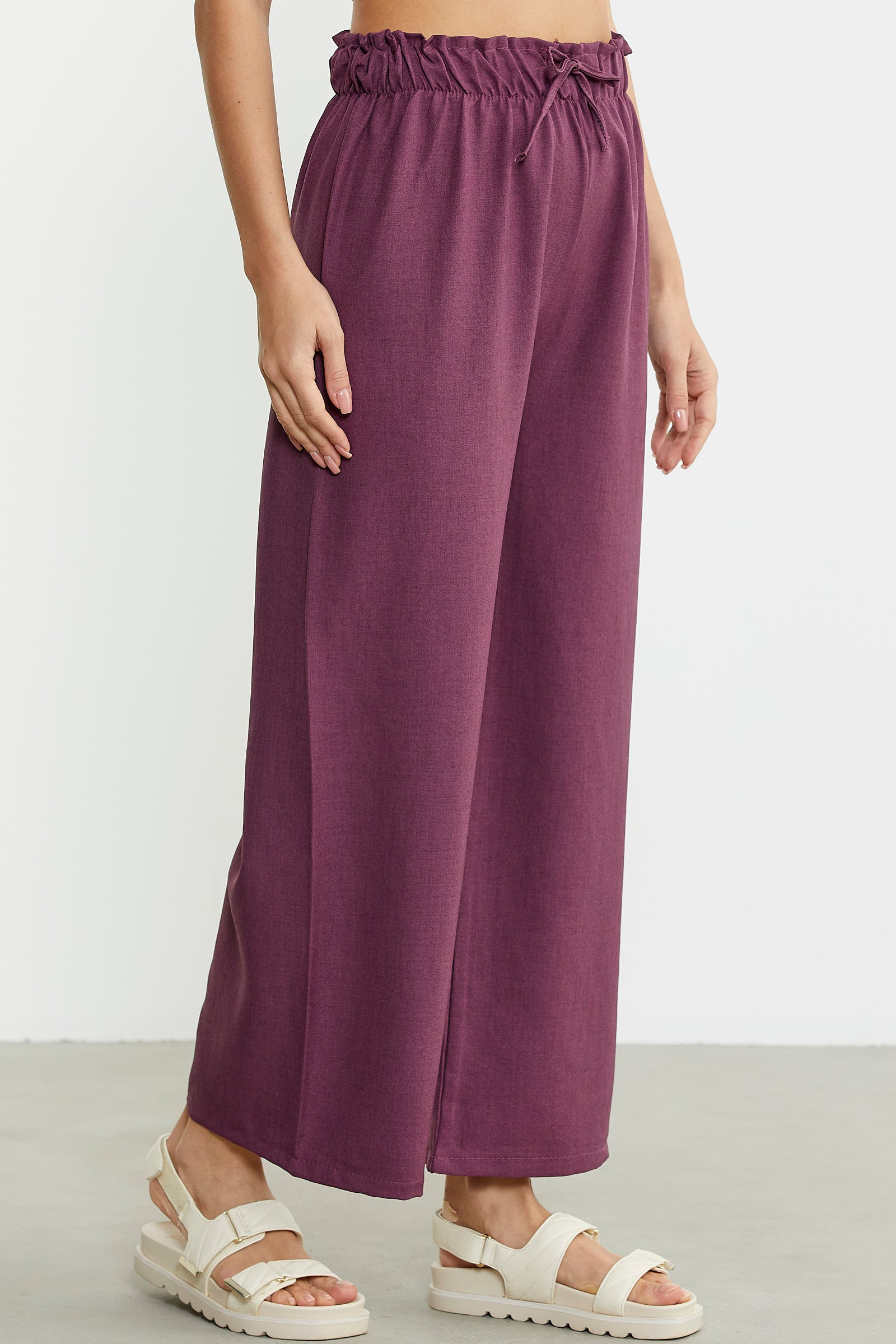 Beli kalın lastikli, rahat kesim, bol paça, cepli pantolon.