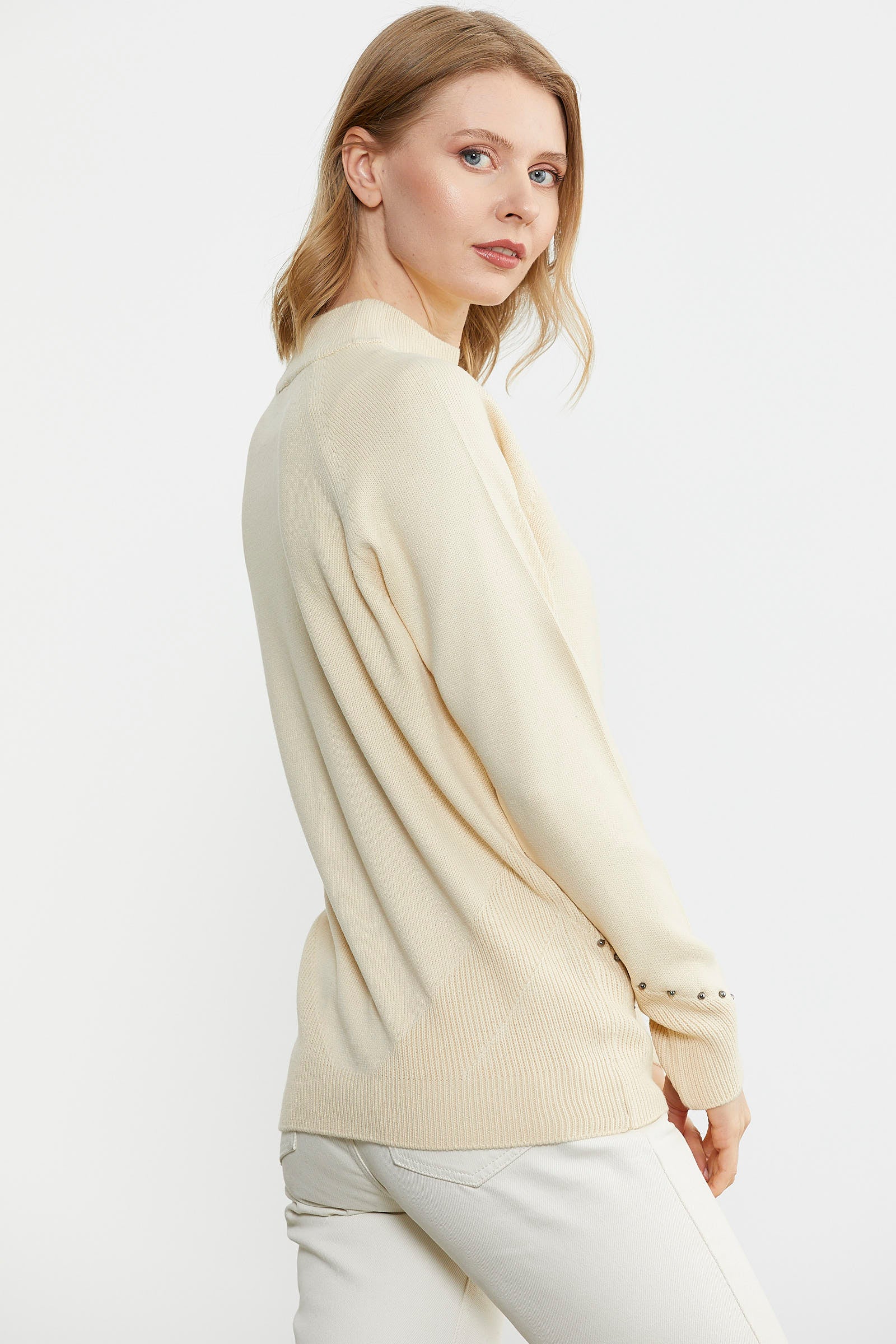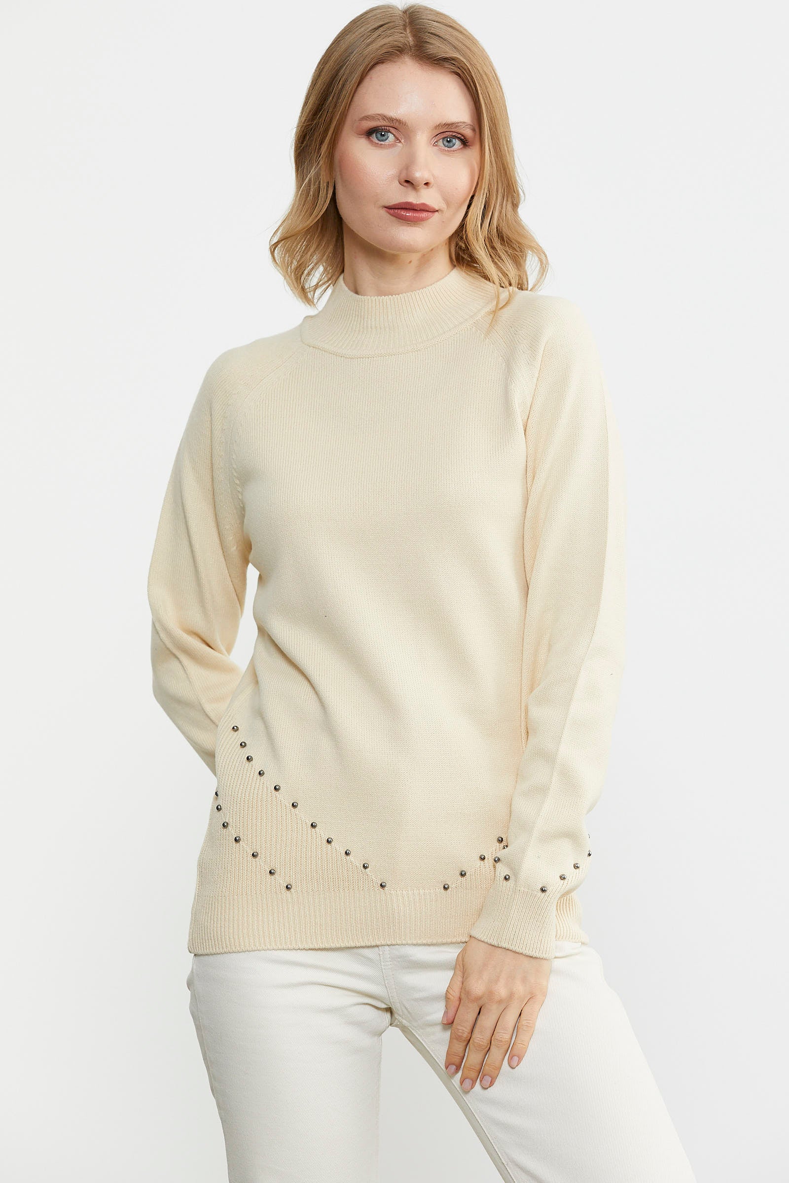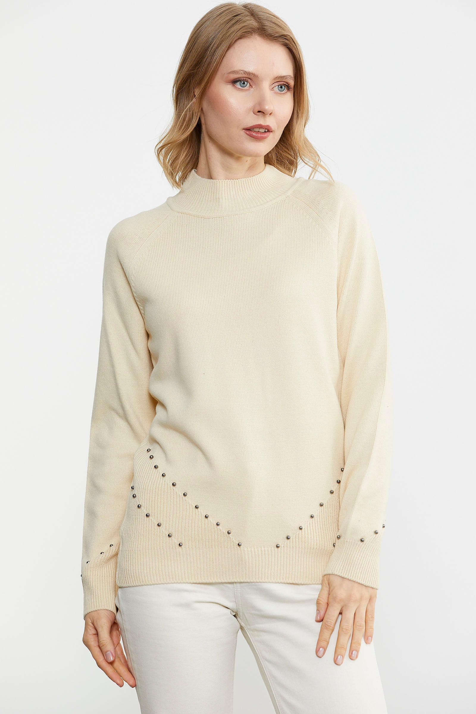 Boncuk Detaylı Triko Kazak - Krem