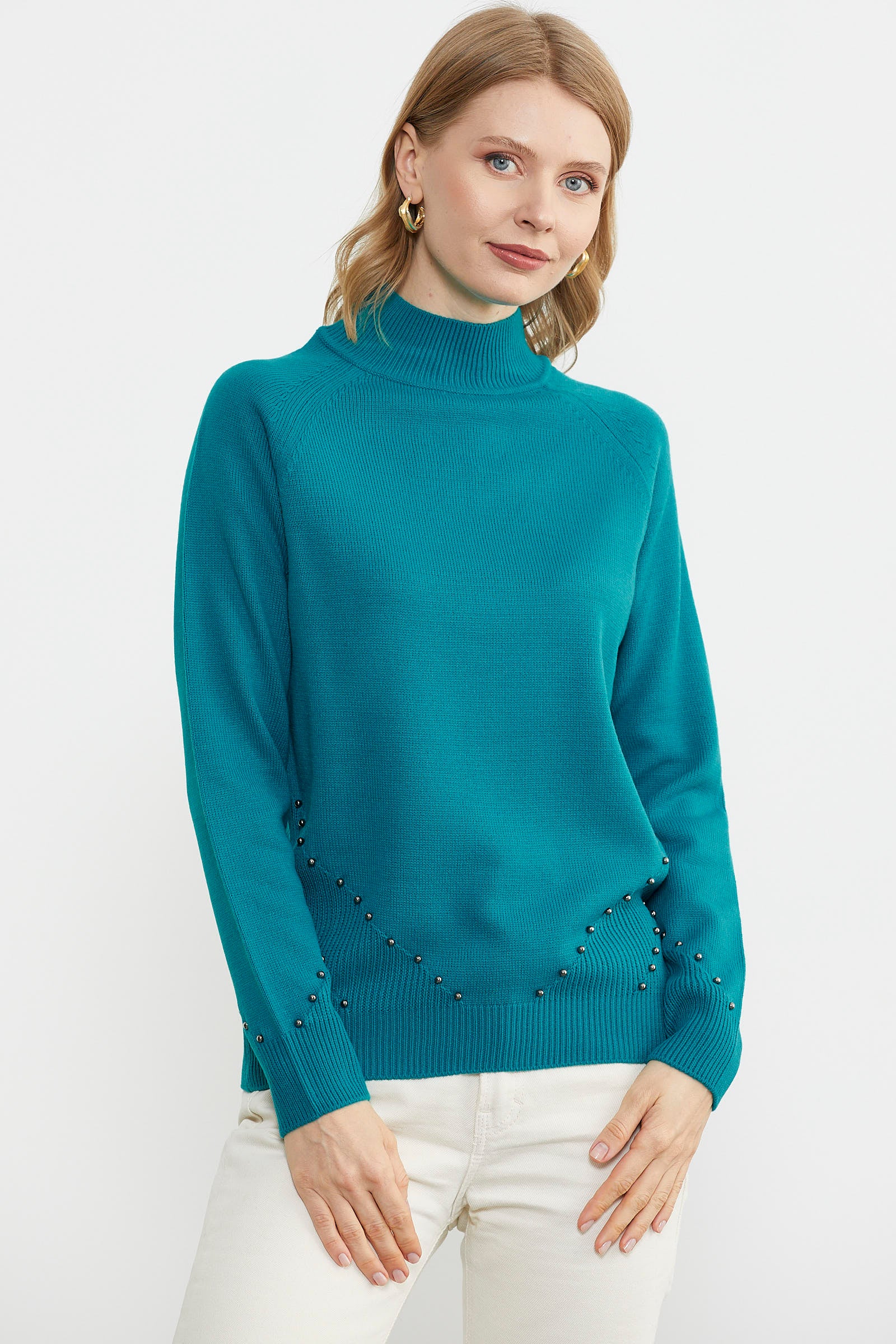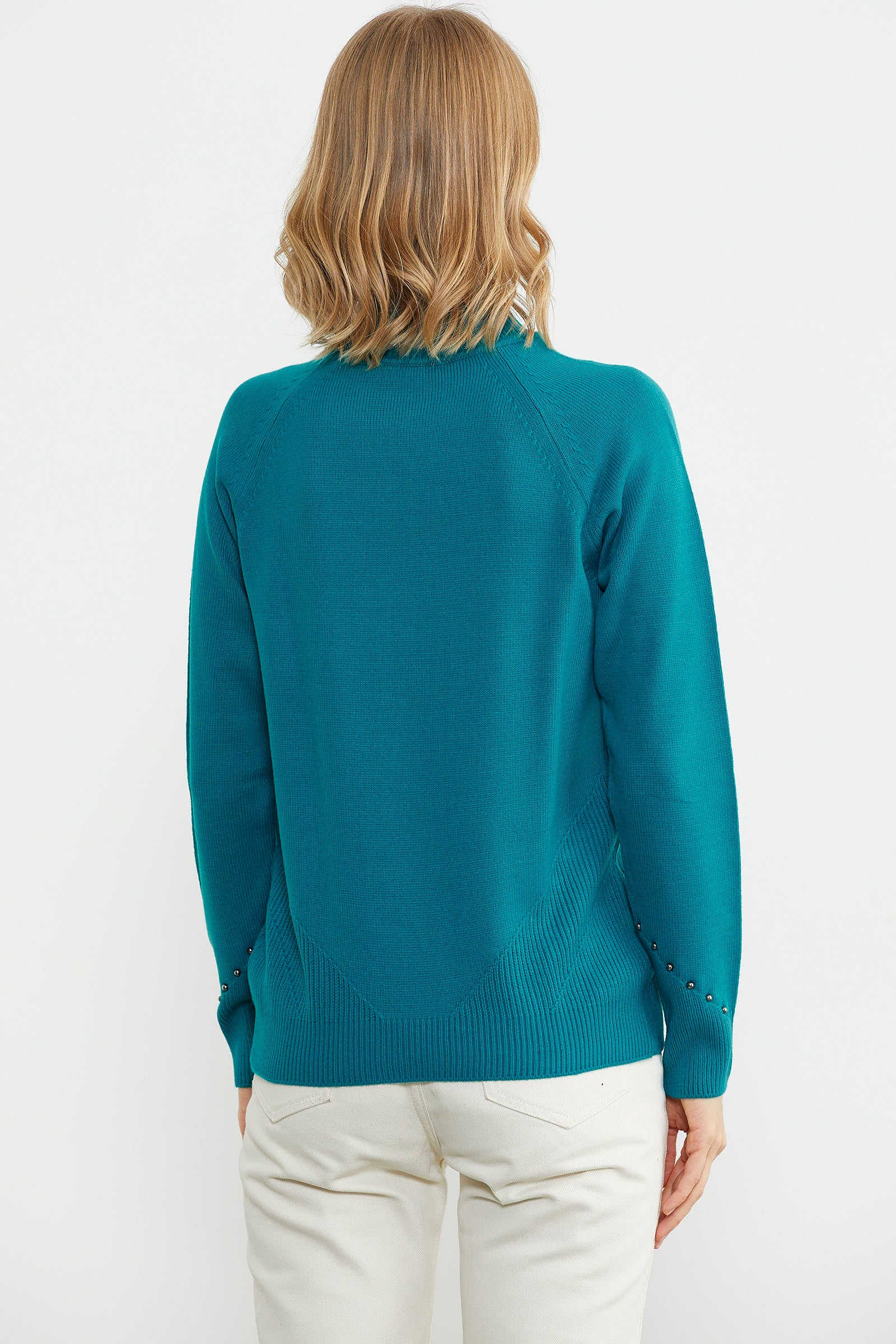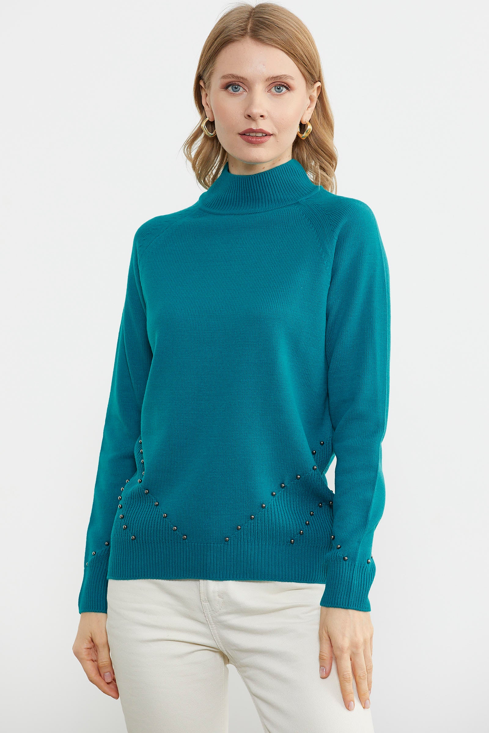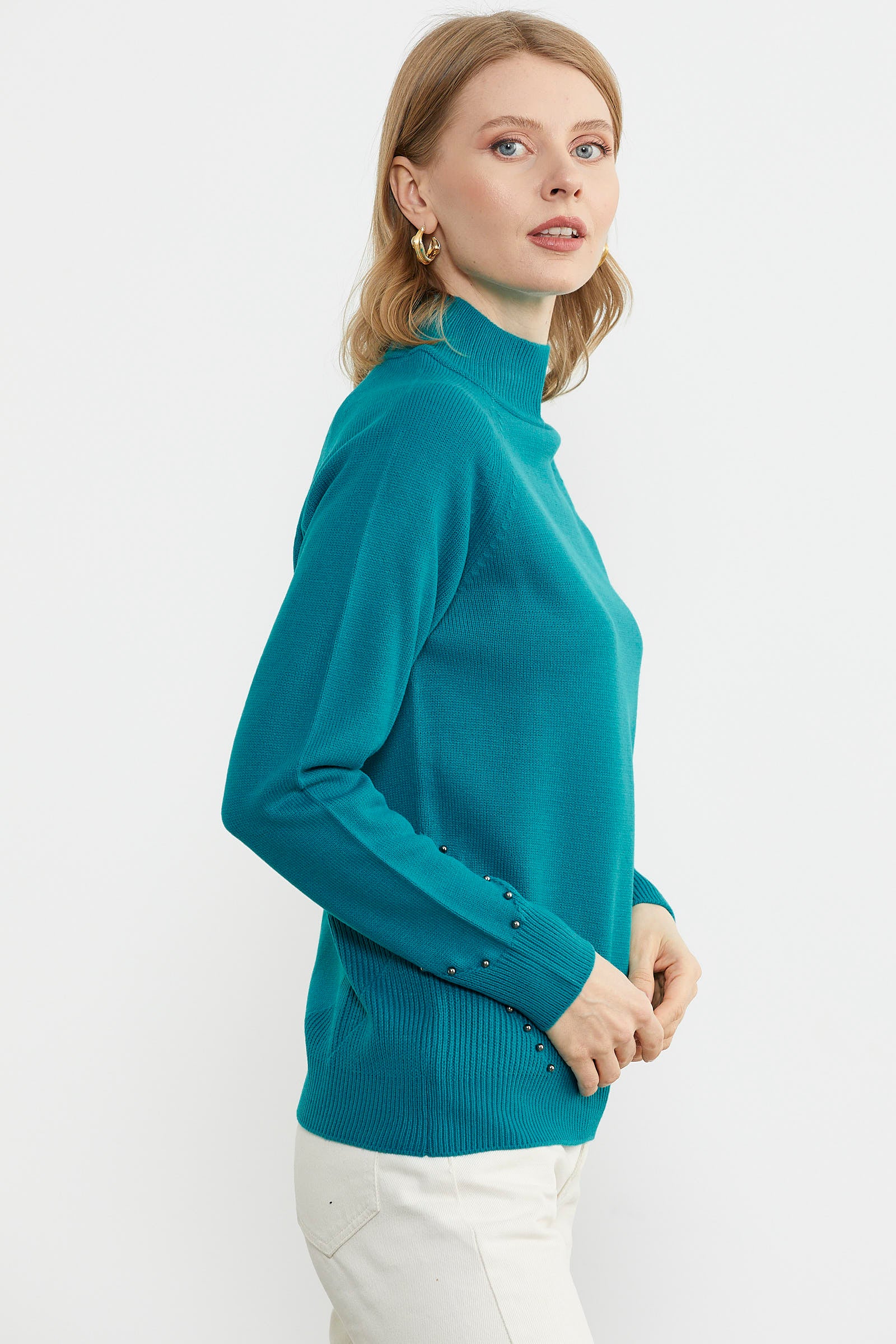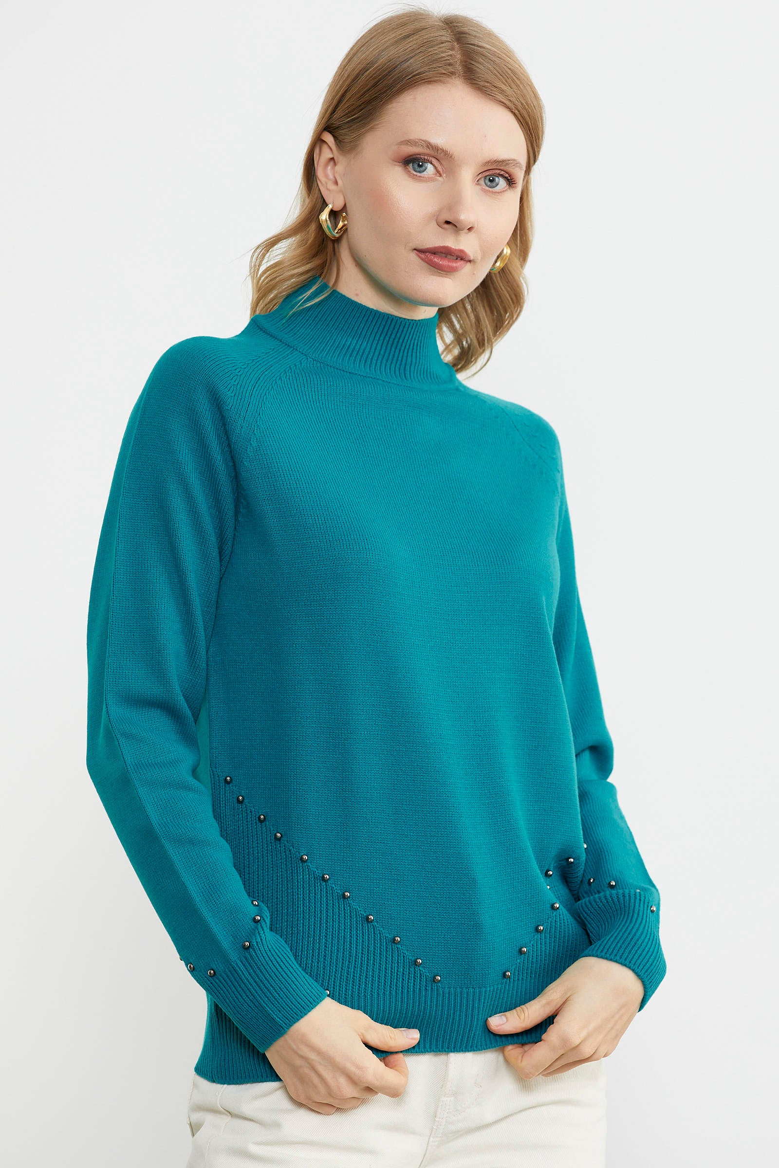 Boncuk Detaylı Triko Kazak - Turkuaz