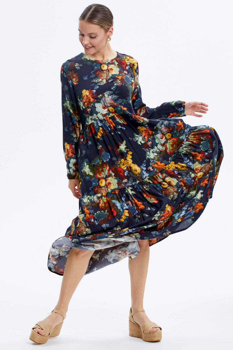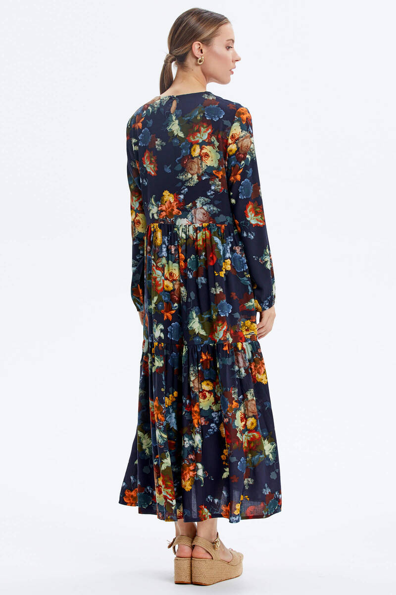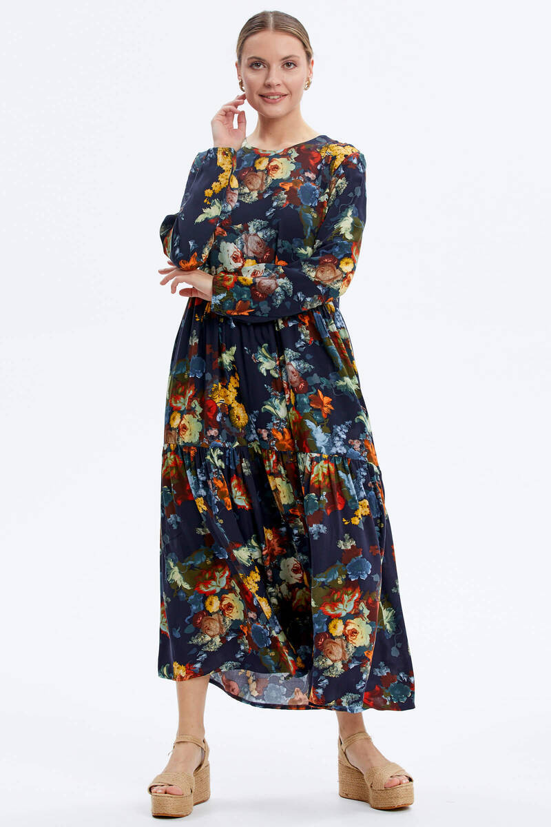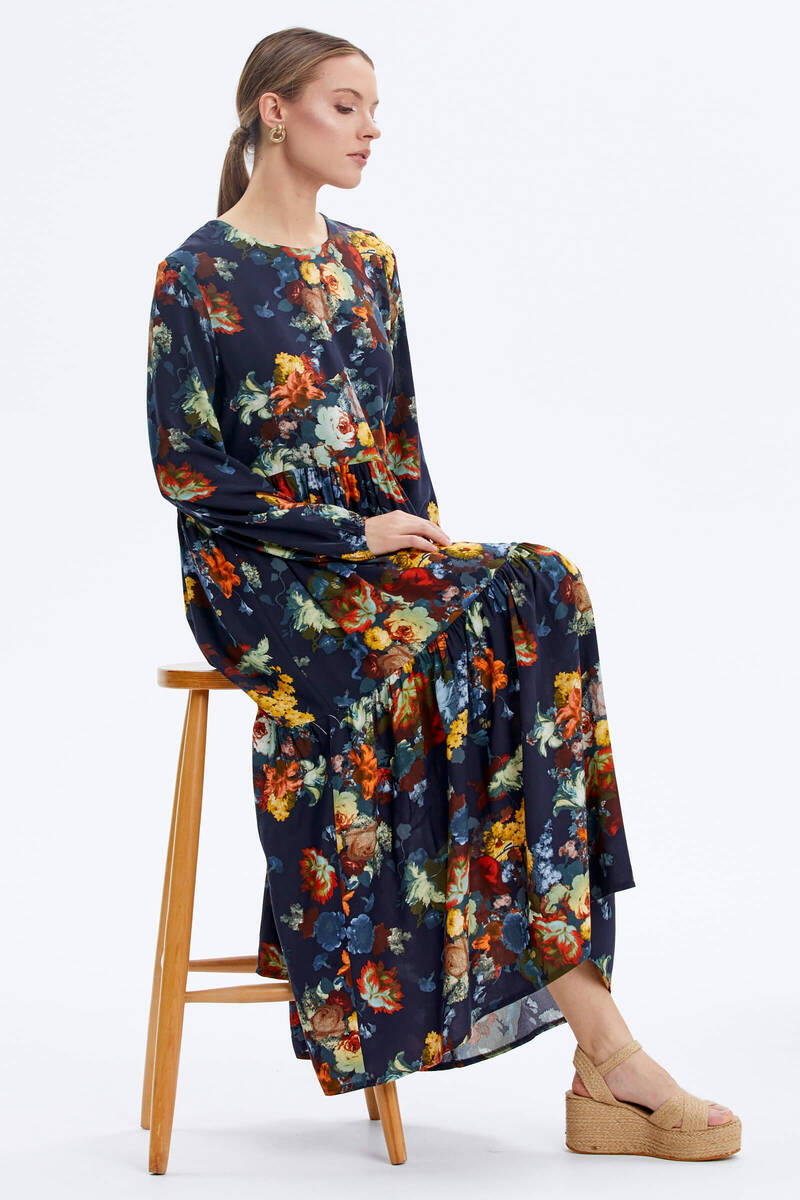 Çiçekli desenli tasarımıyla dikkat çeken, sıfır yaka, uzun kollu, maksi boy elbise ile konforu hissedin.
