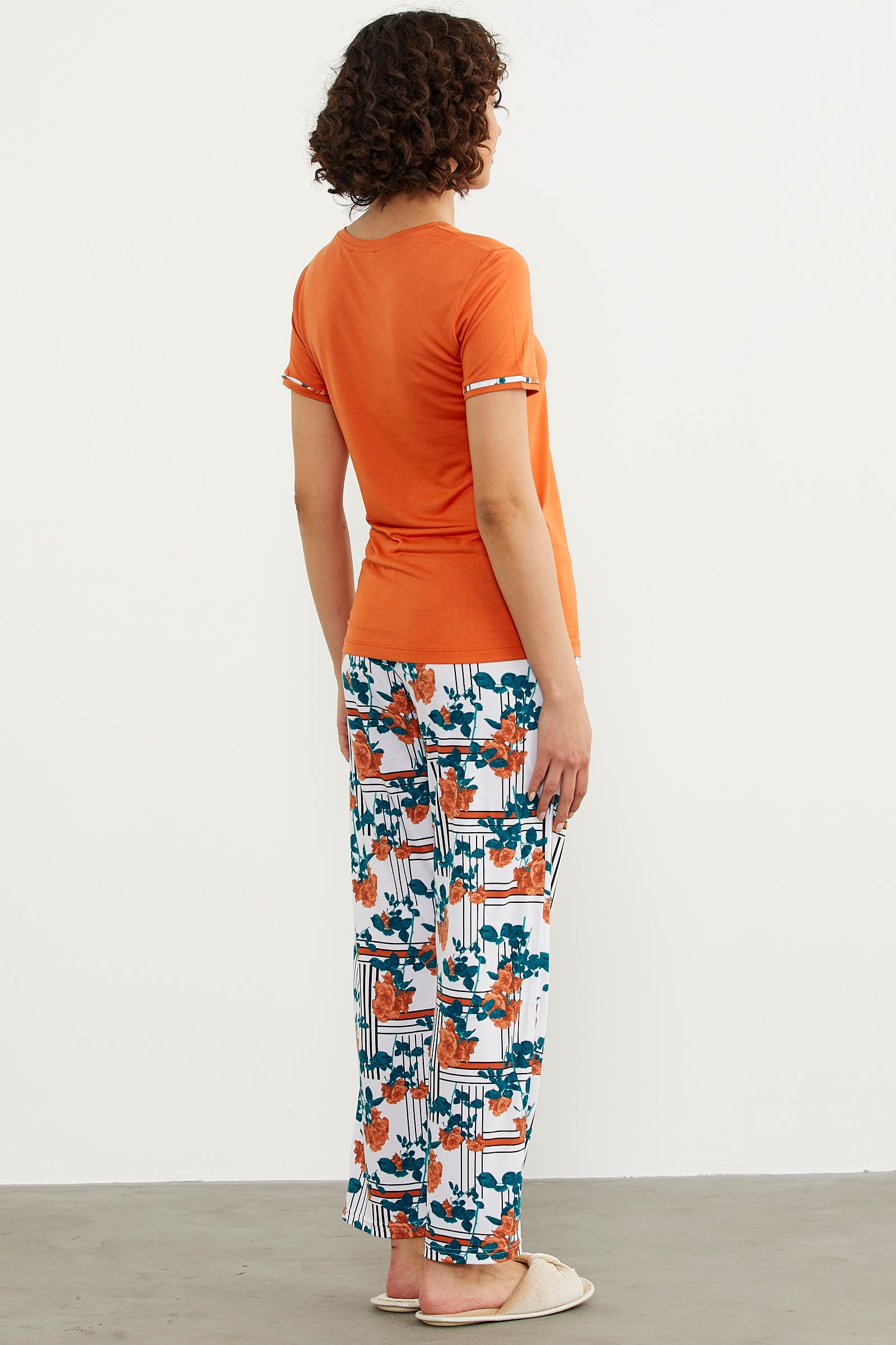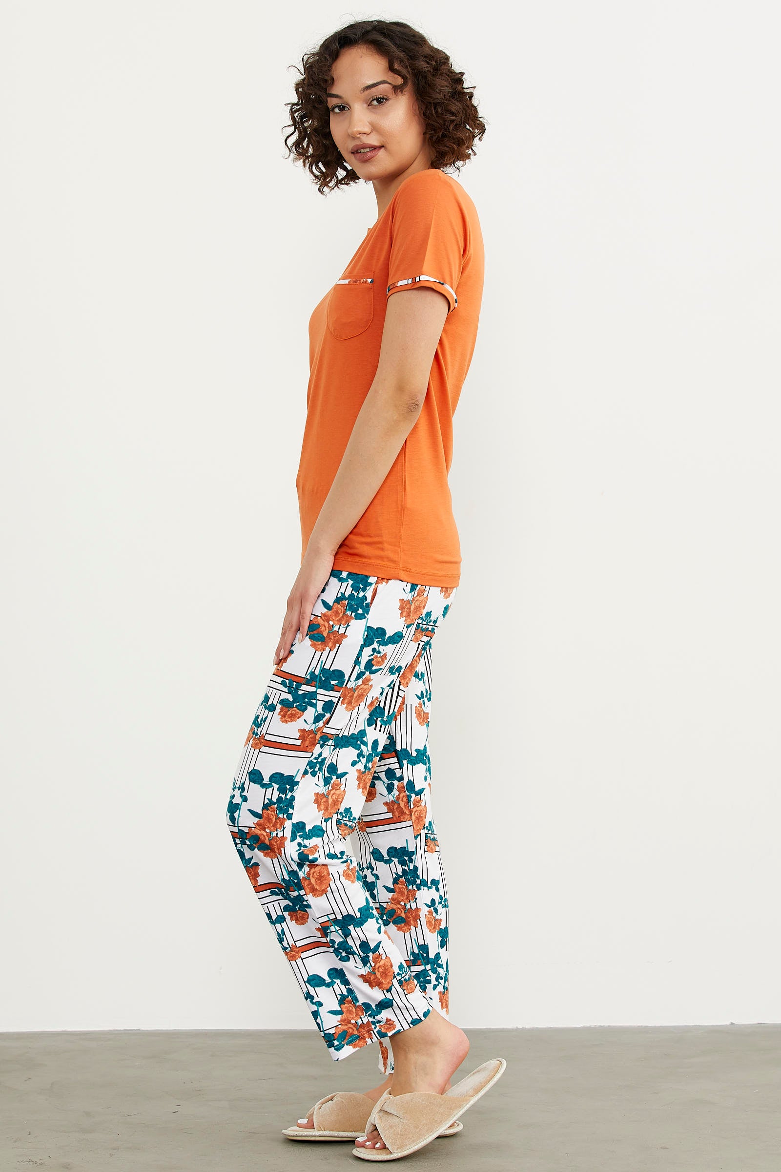 Büyük Beden Çiçek Desenli Renkli Pijama Takım - Kiremit