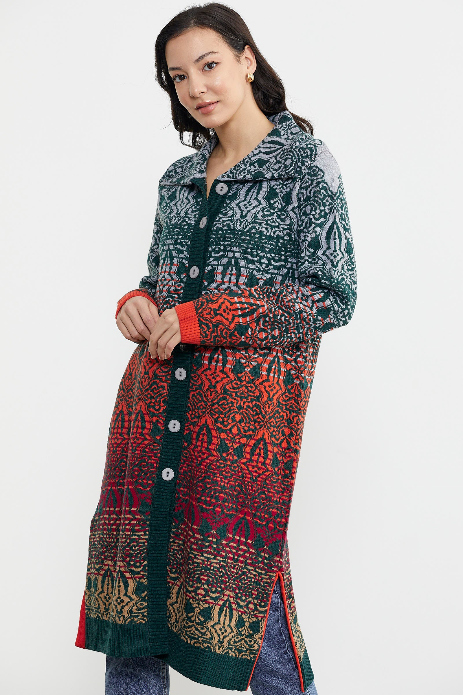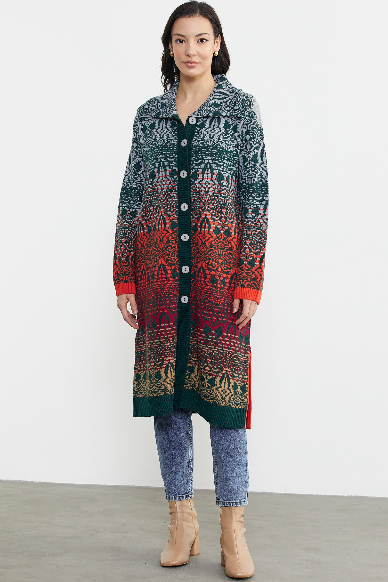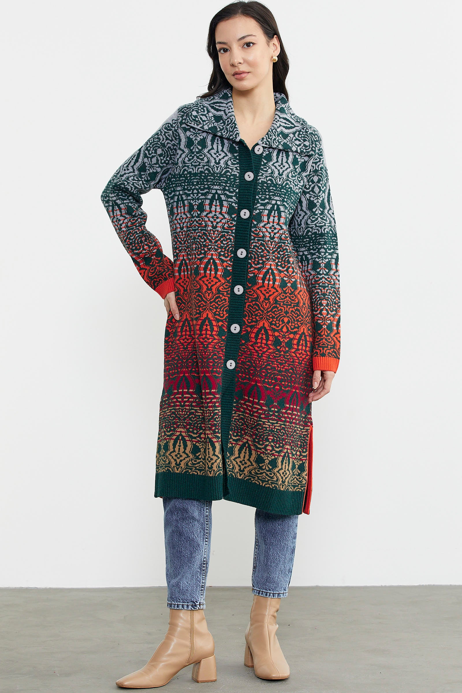Büyük Beden Çok Renkli Uzun Triko Hırka - Yeşil