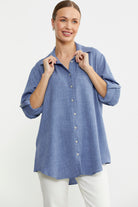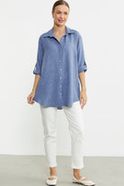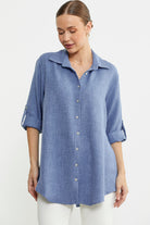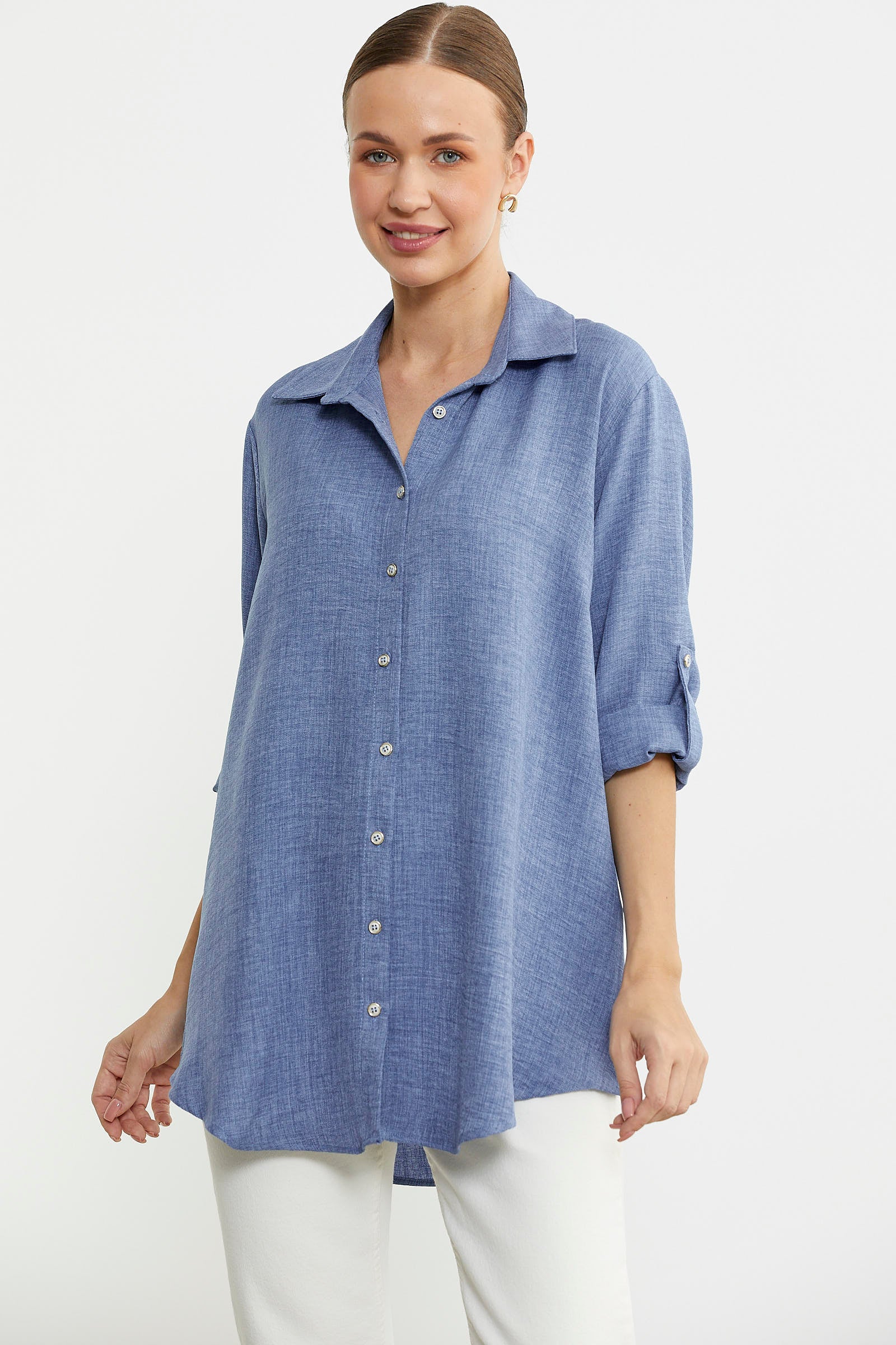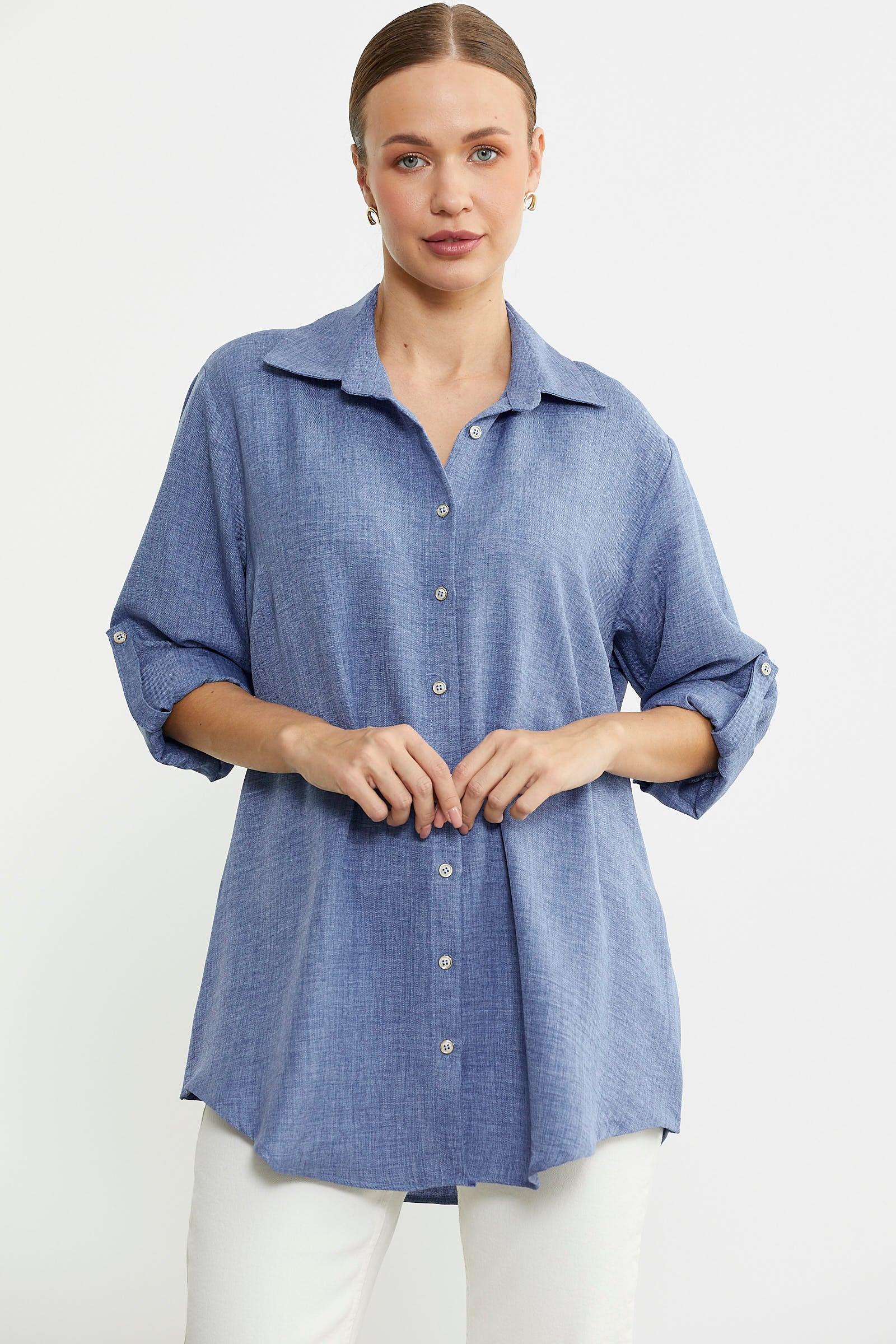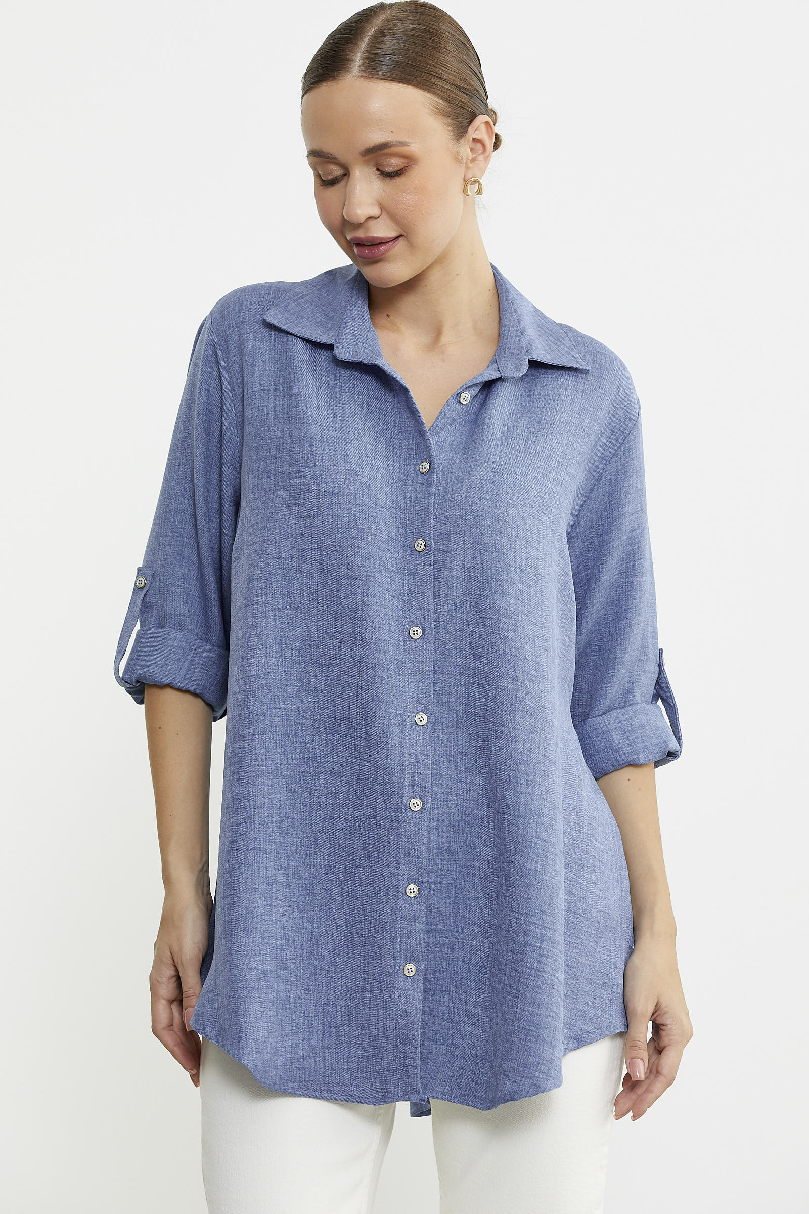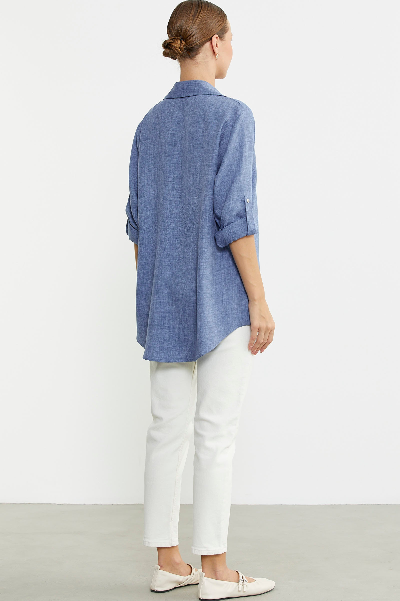 Büyük Beden Keten Görünümlü Gömlek - Mavi