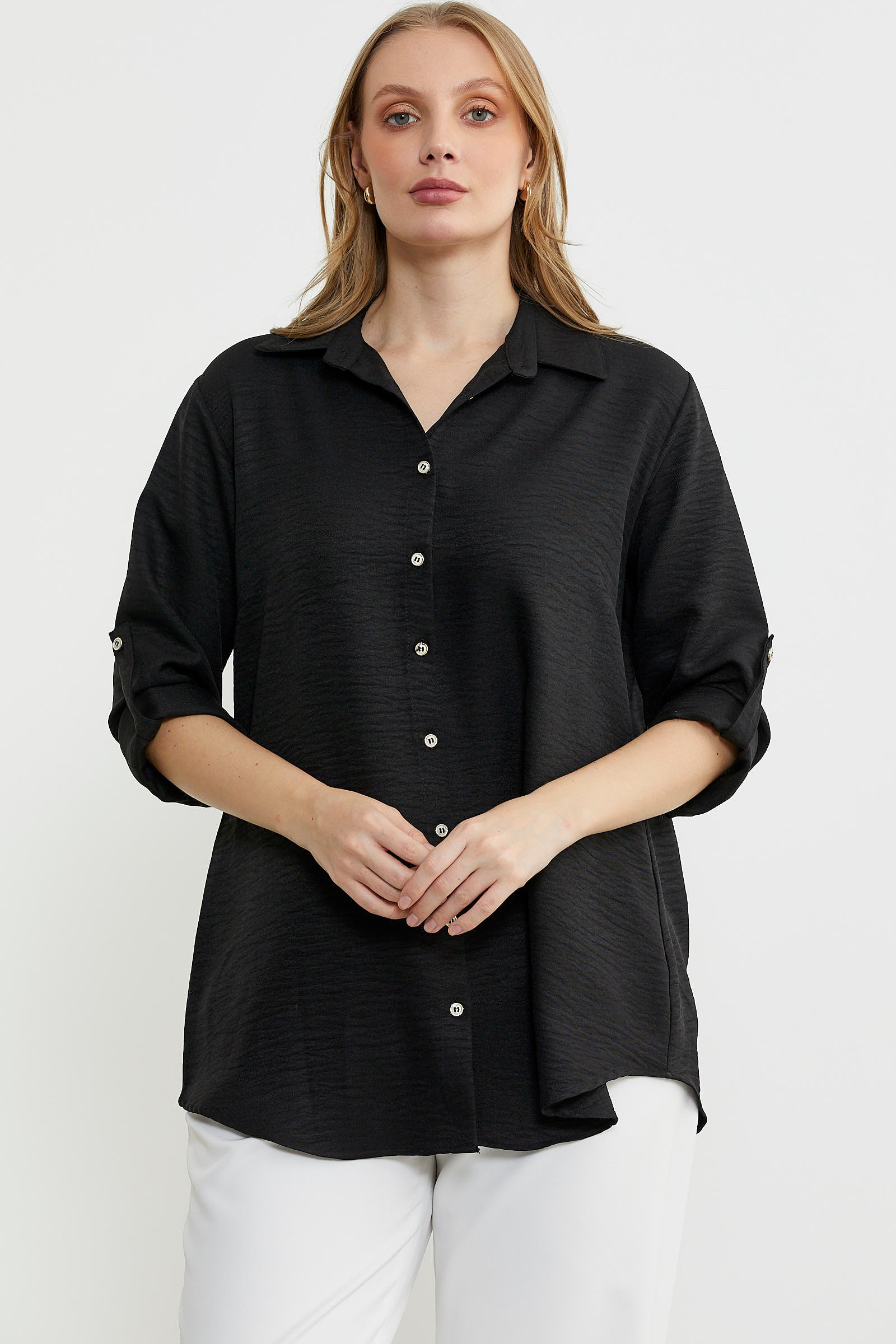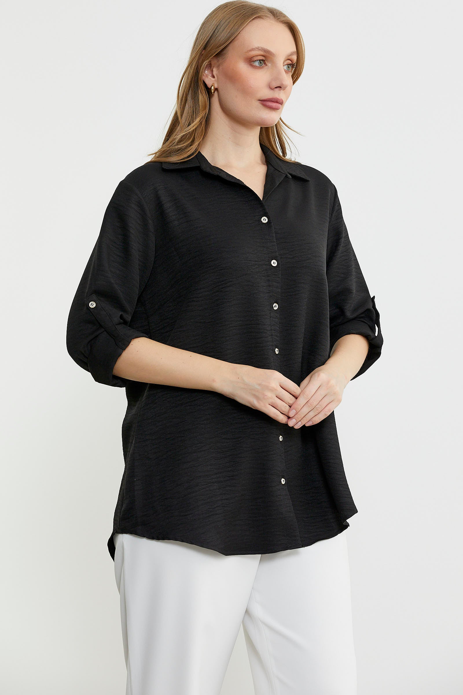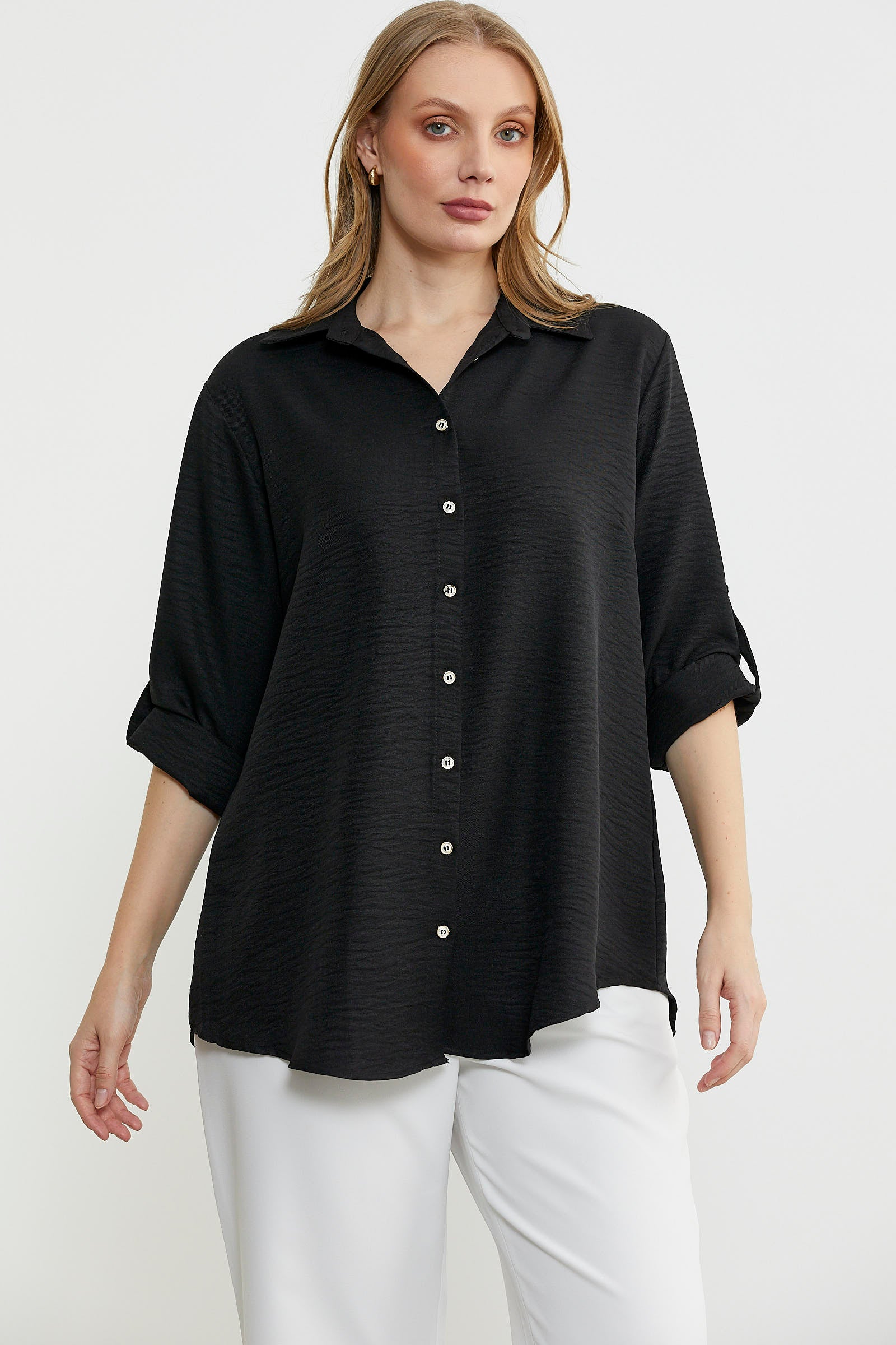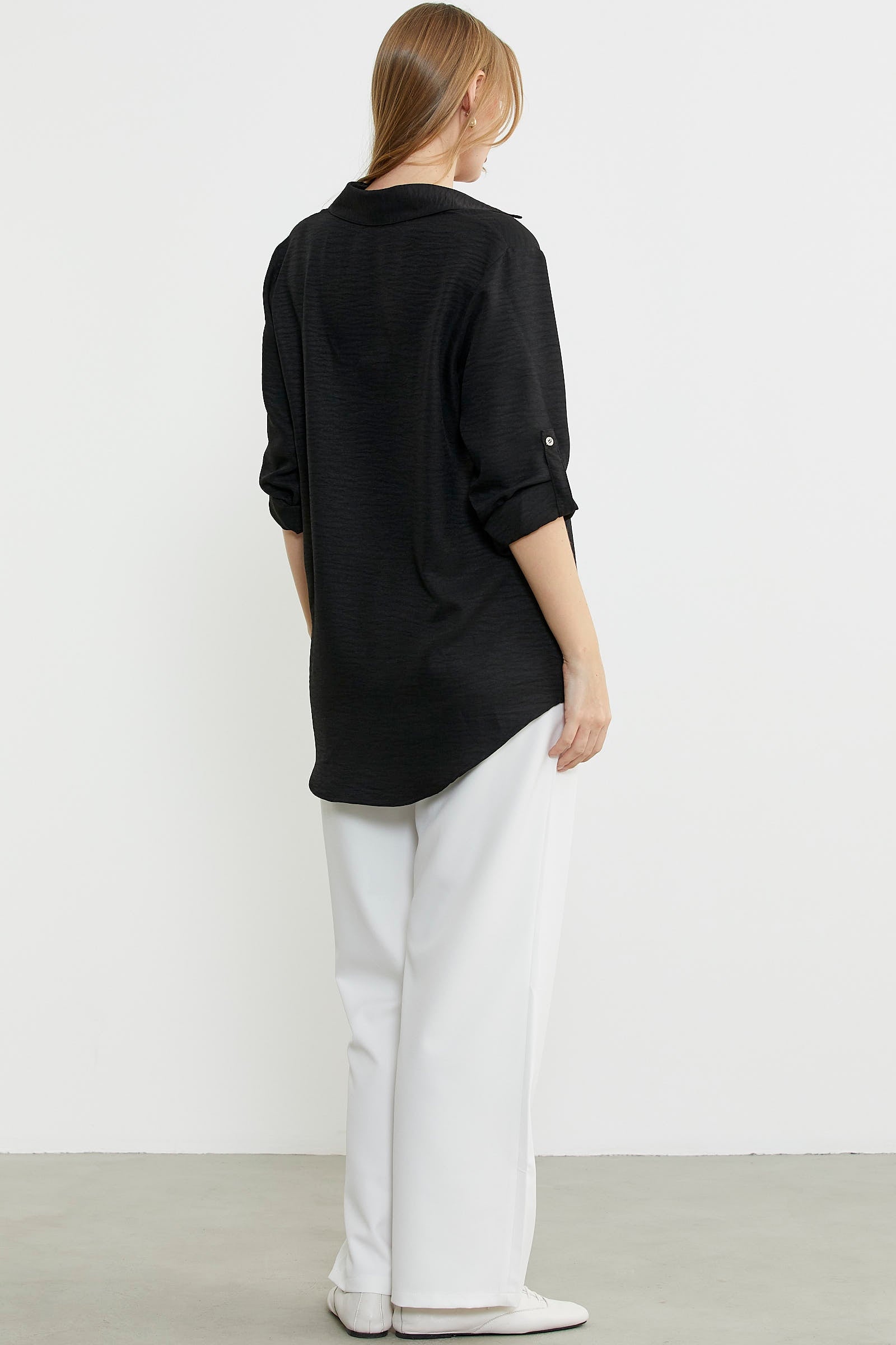 Büyük beden olarak tasarlanan gömlek düz renk keten görünümlü kumaştan üretilmiştir. Katlamalı kol detayına sahiptir. Arkası uzundur.