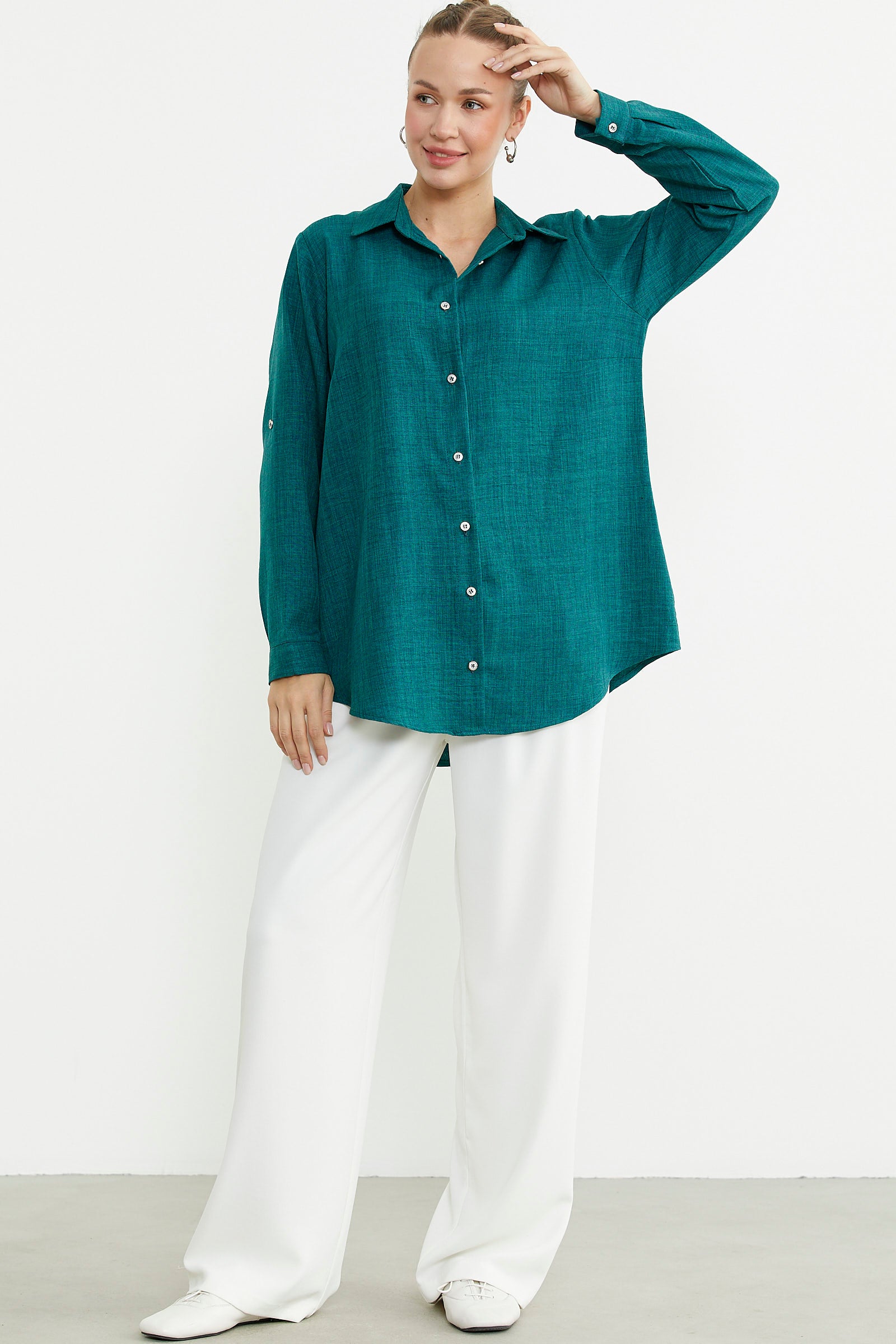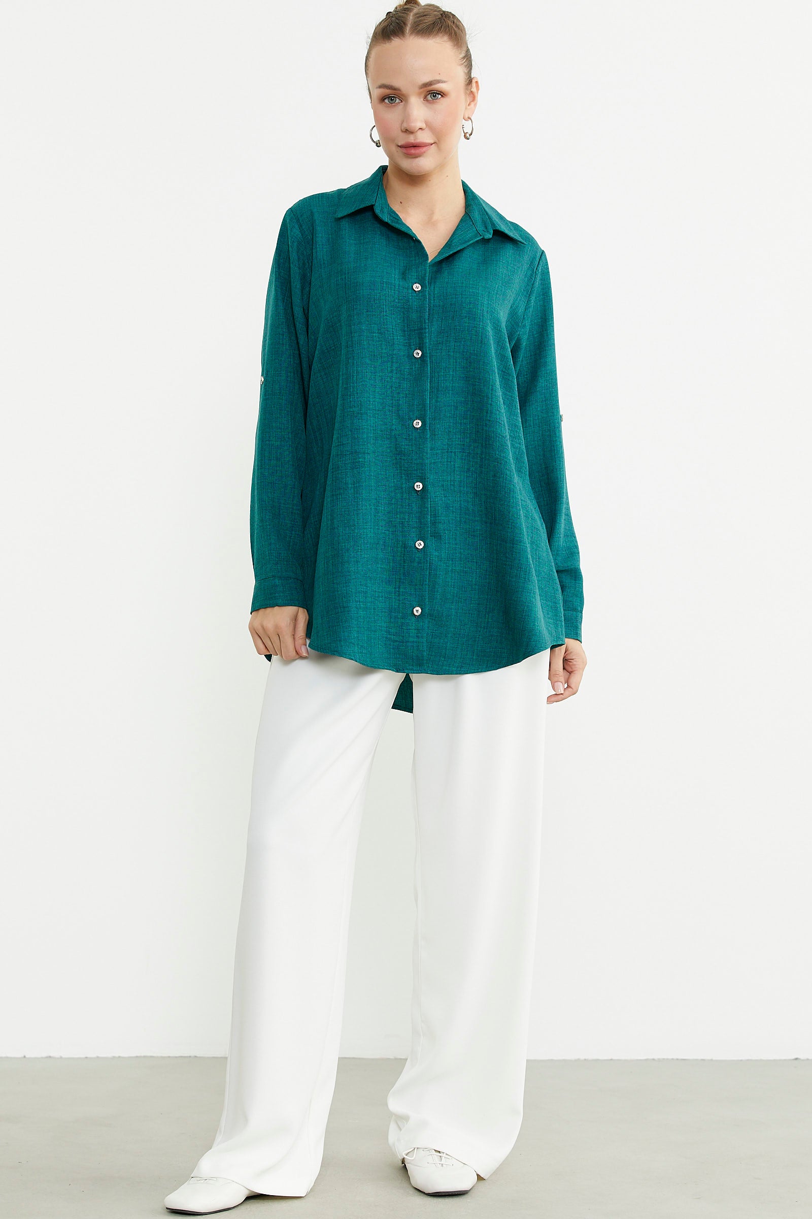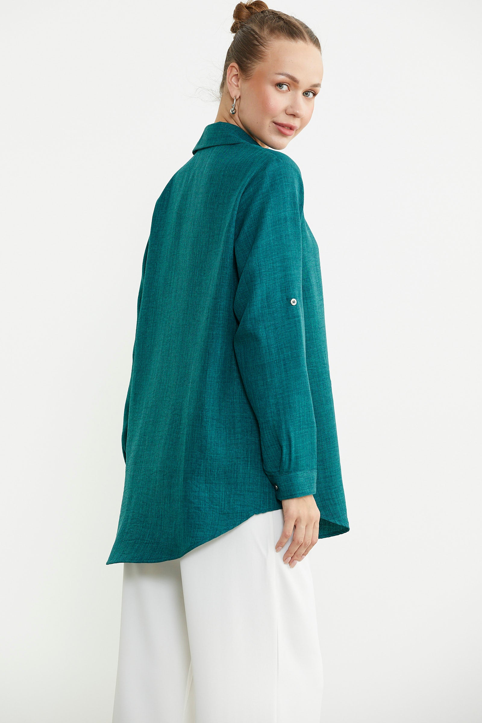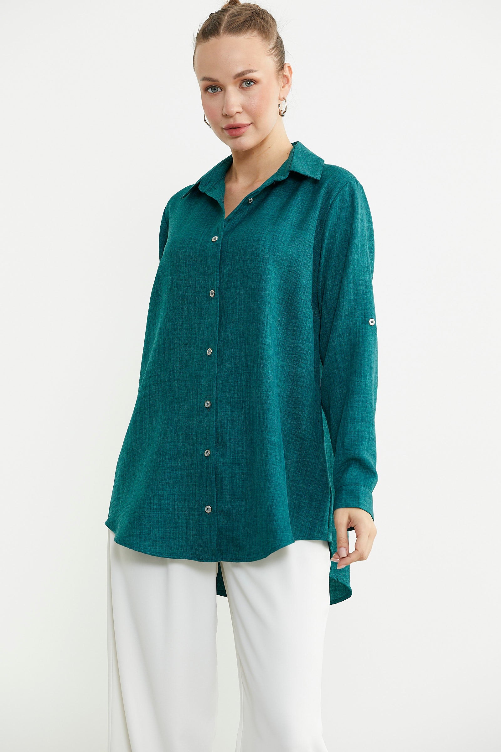 Büyük beden olarak tasarlanan gömlek düz renk keten görünümlü kumaştan üretilmiştir. Katlamalı kol detayına sahiptir. Arkası uzundur.