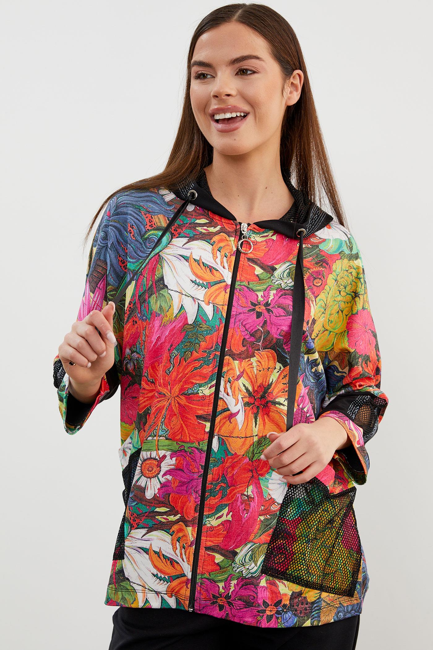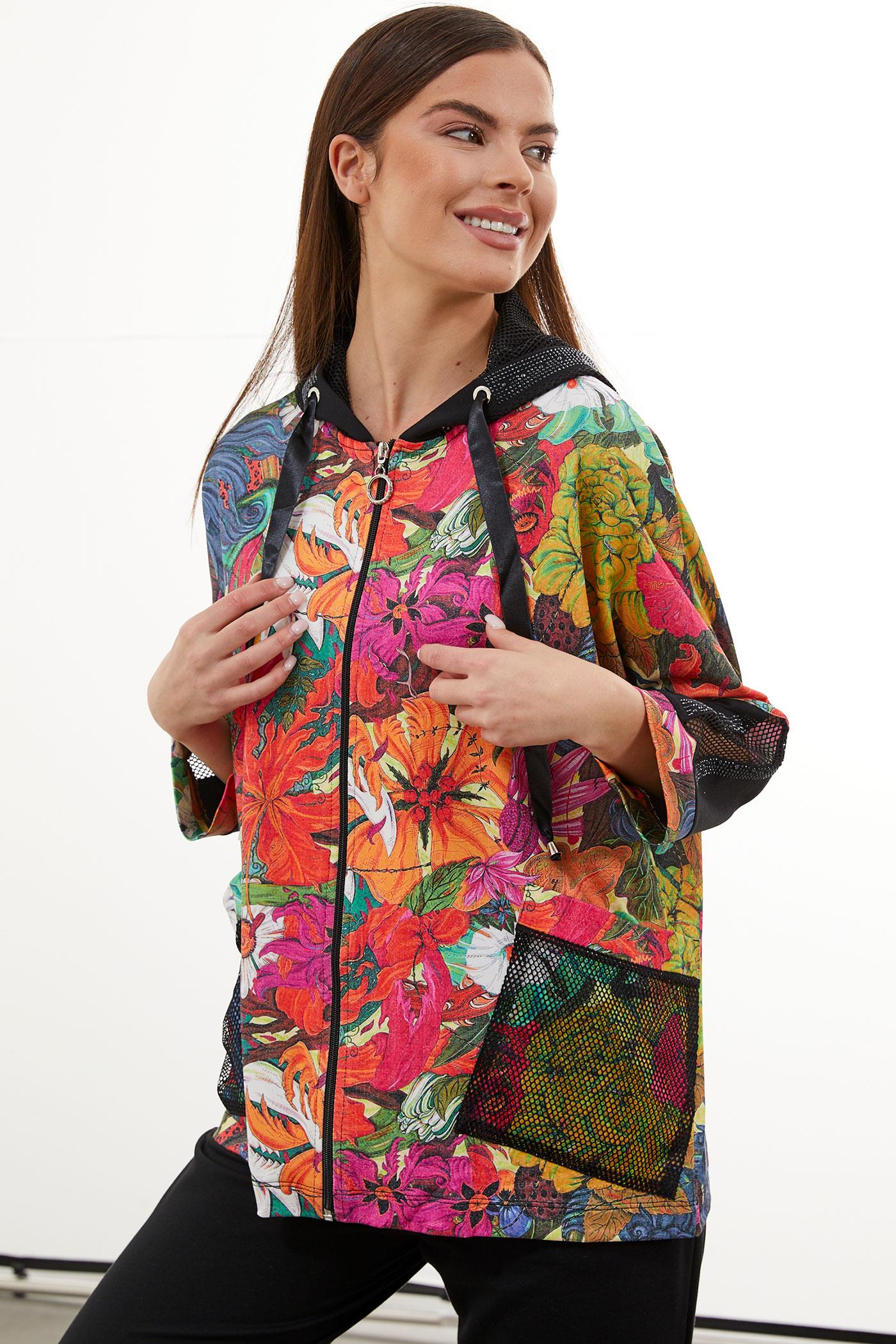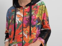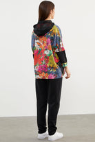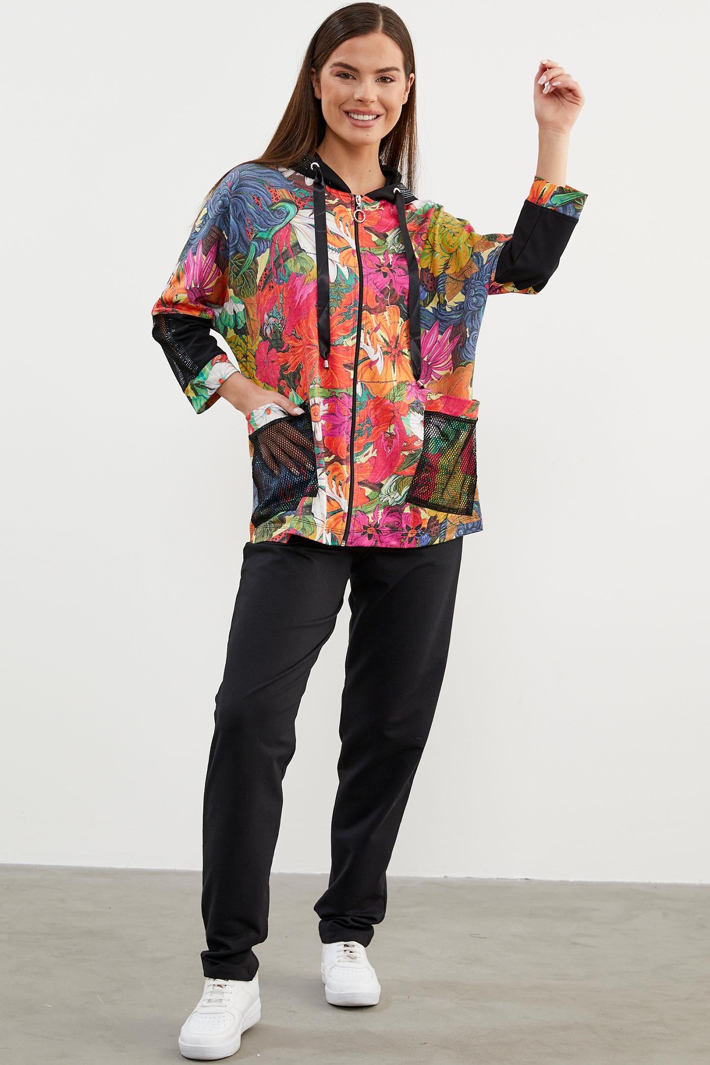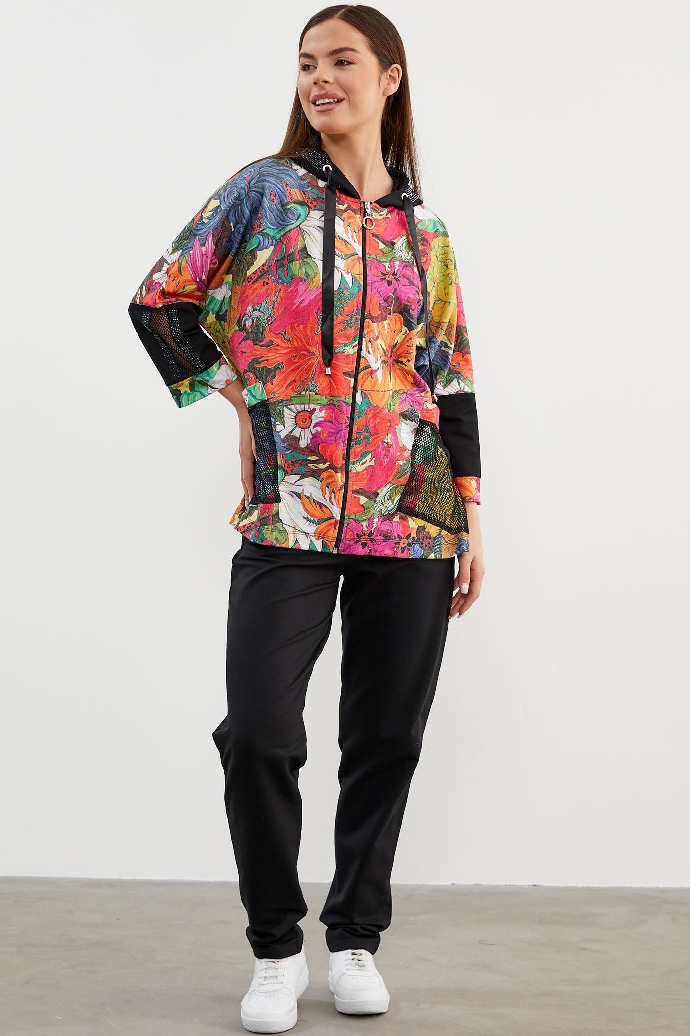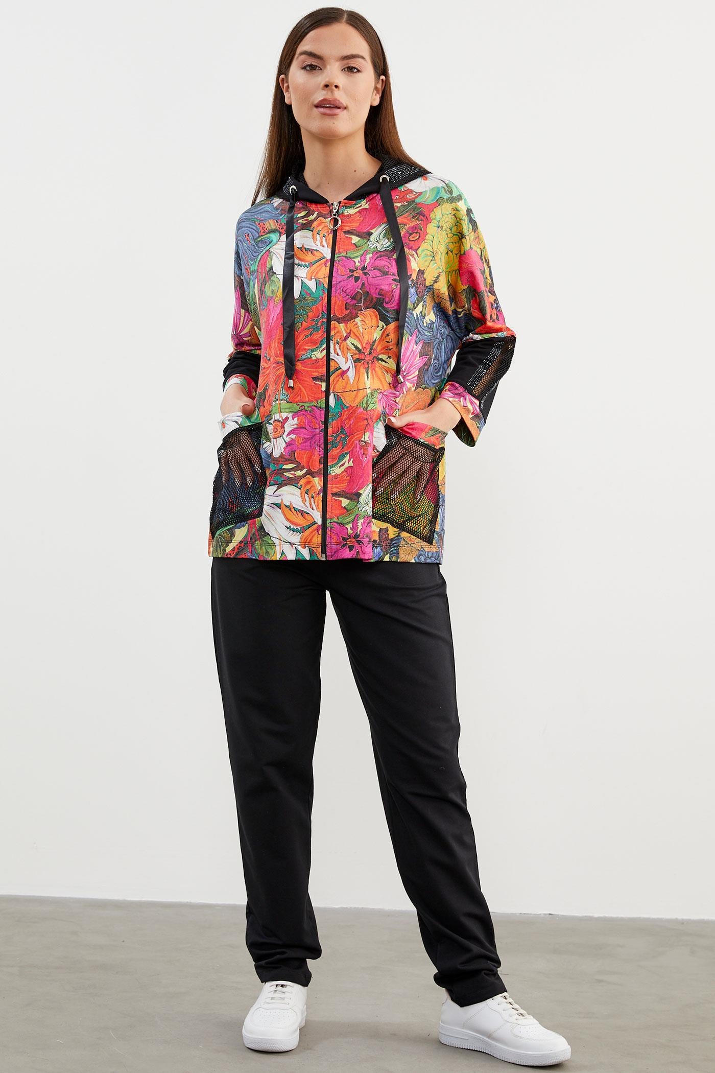 Zarif tasarımıyla giymesi kolay olan kapüşonlu, fermuar kapamalı çiçek desenli sweatshirt ve beli lastikli eşofman altından oluşan takım çok yönlü stil seçenekleri sunuyor.