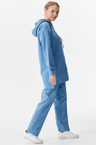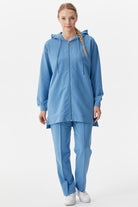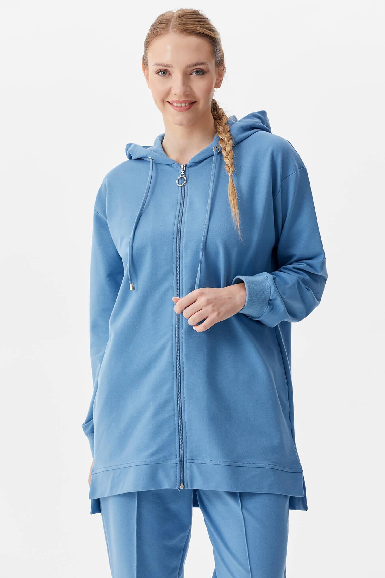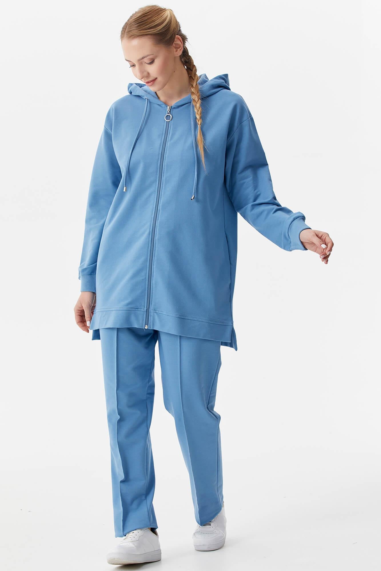 Kapüşonlu, uzun kollu, fermuar kapatmalı, manşetleri ribanalı uzun sweatshirt ve beli bağcıklı, boru paça, nervürlü eşofman altından oluşan takım.