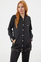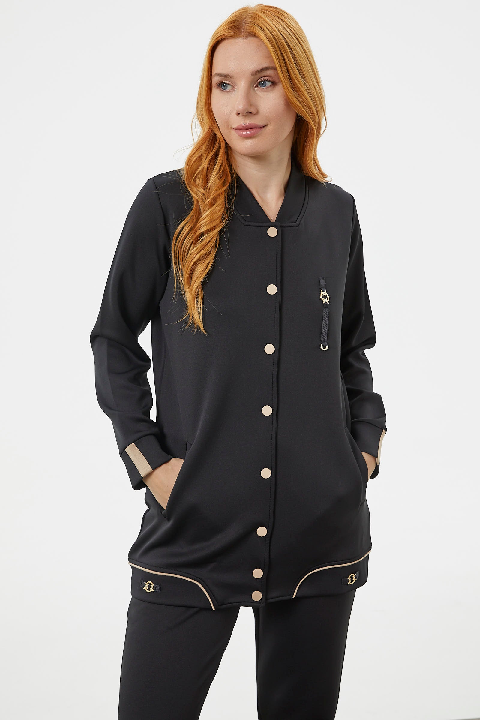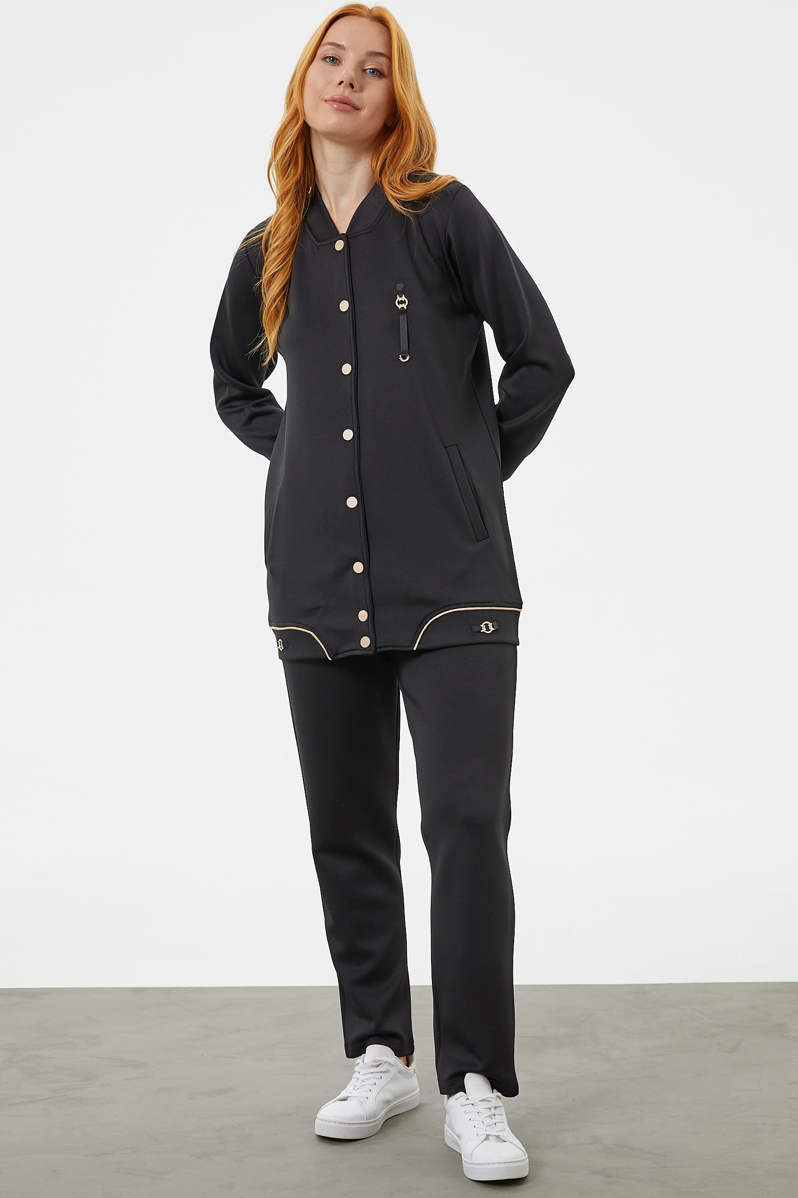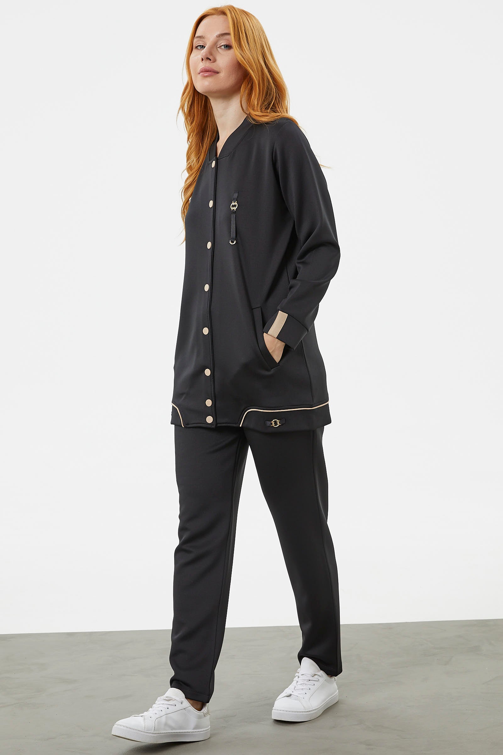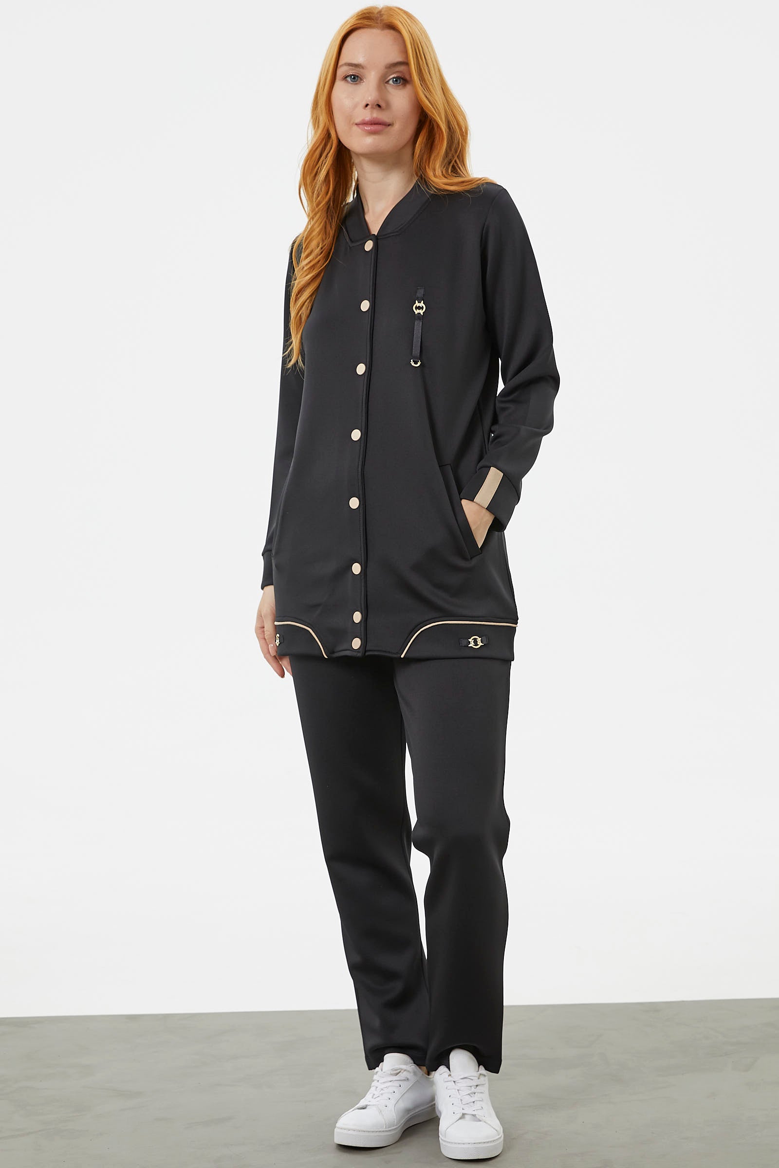 Büyük beden olarak tasarlanmış renk detaylı tunik ve alttan oluşan ikili eşofman takımı düğme ve cep detaylarıyla kullanım kolaylığı sağlarken zarif bir görünüm yaratıyor.