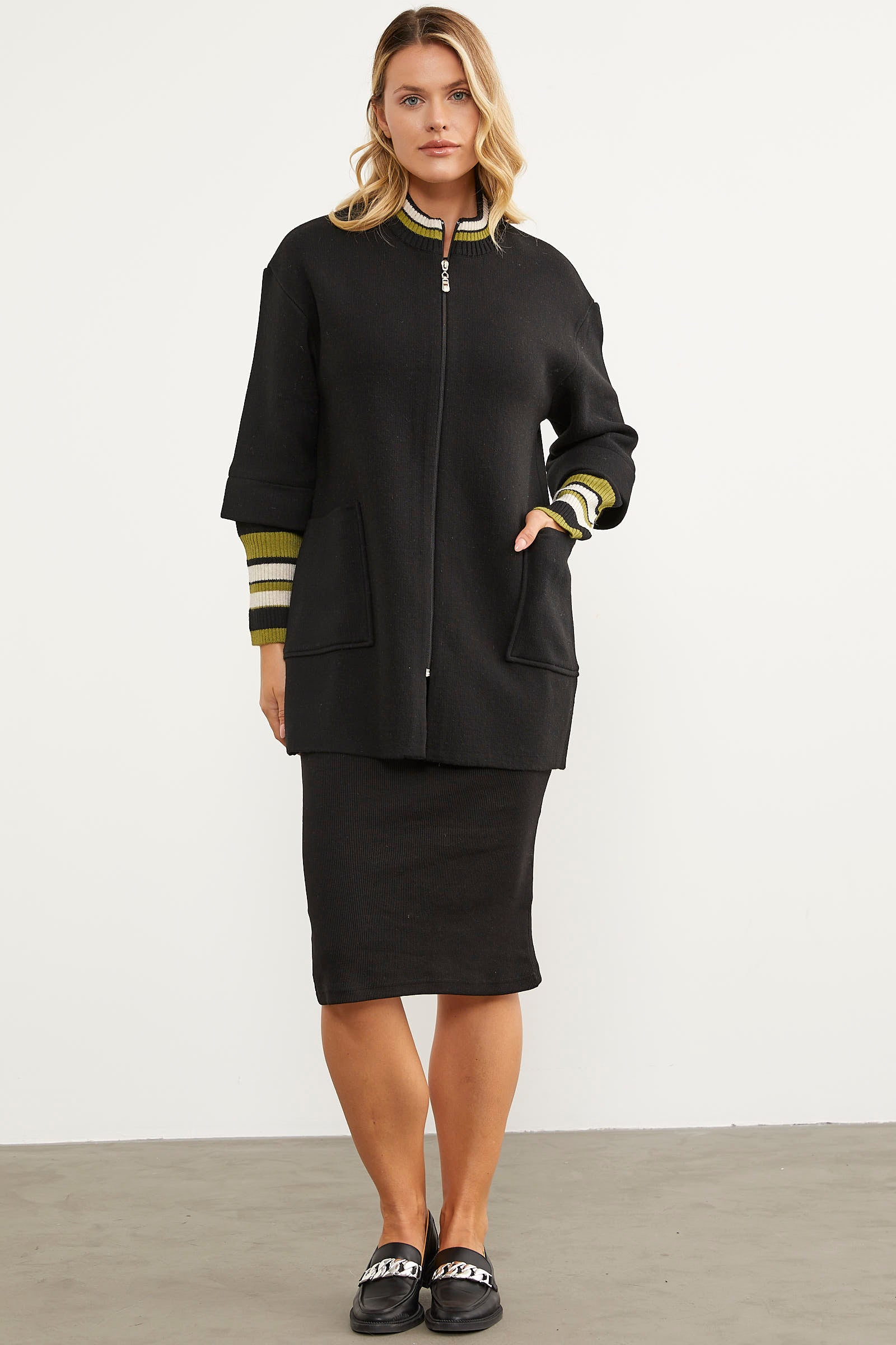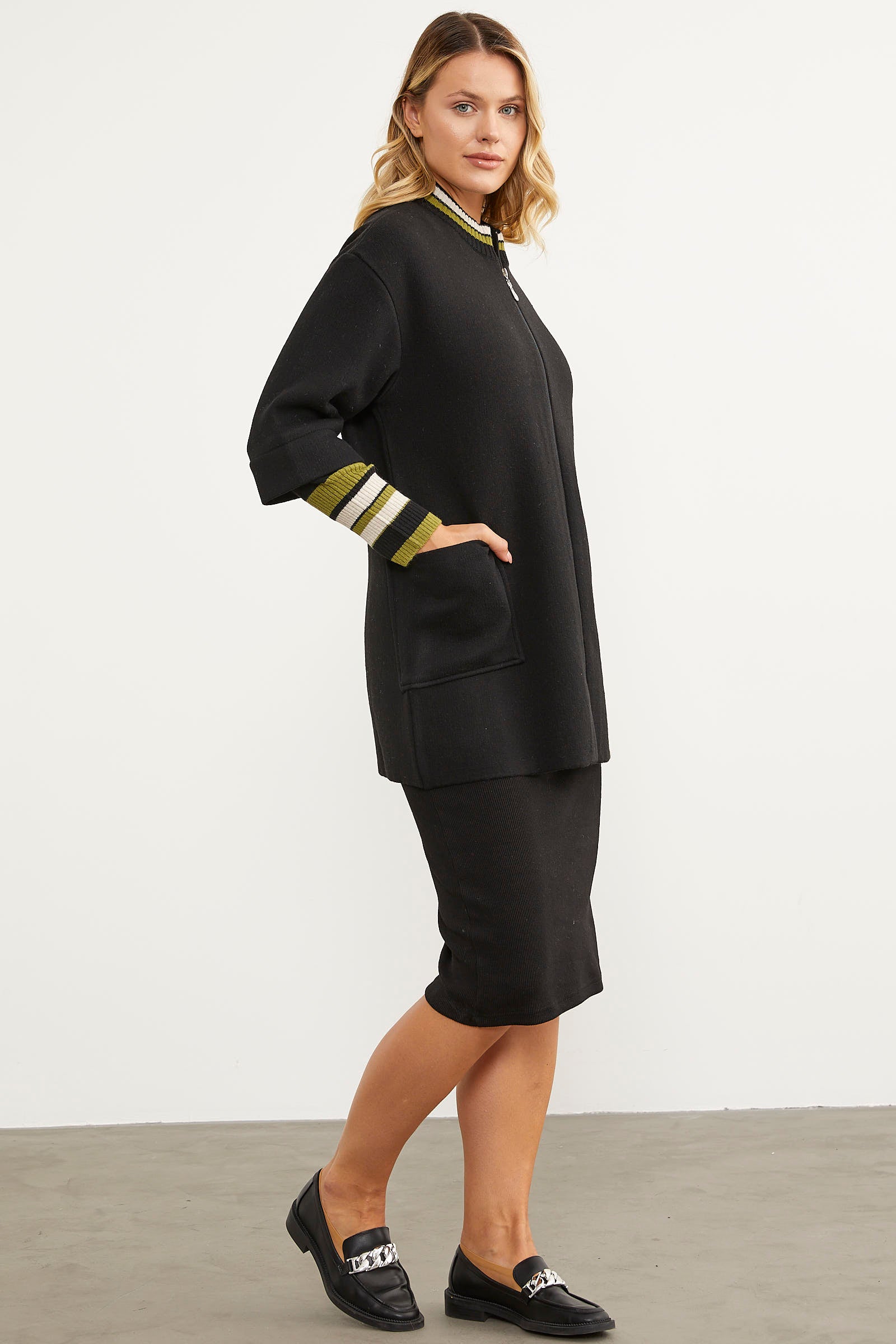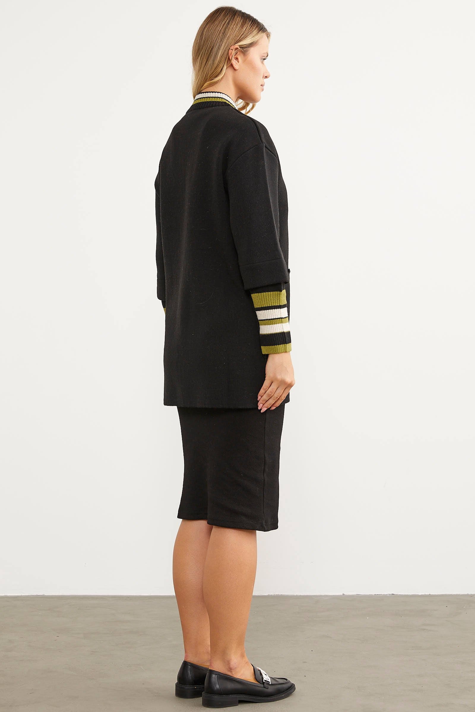 Çelik Örgü Çizgi Detaylı Triko Ceket - Siyah