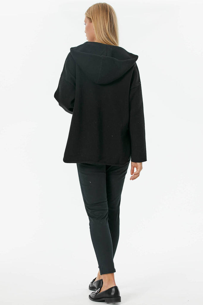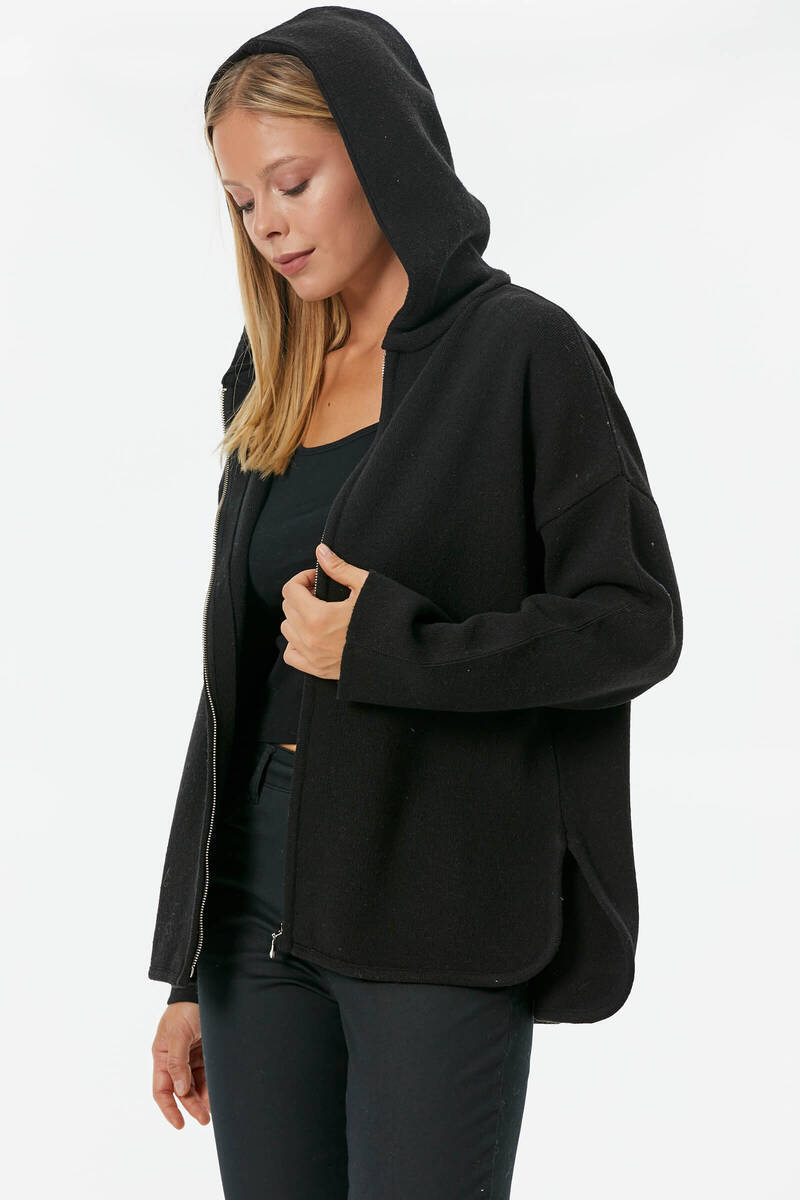 Kapüşonlu, fermuarlı formu ile kullanım kolaylığı sunan, önü kısa arkası uzun triko ceket ile en şık kombinlerinizi tamamlayacaksınız.
