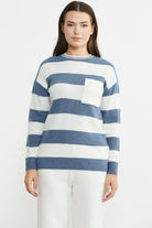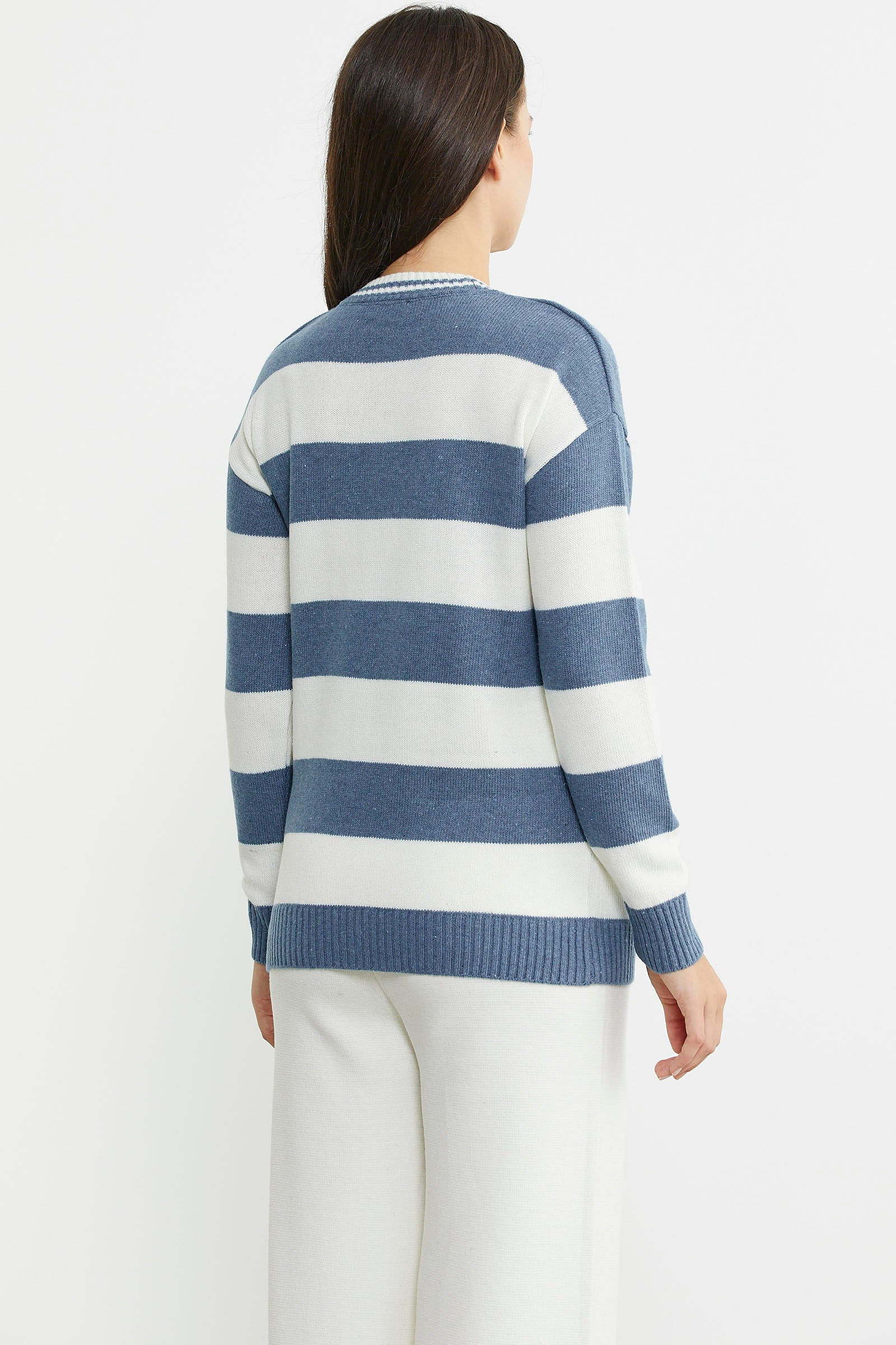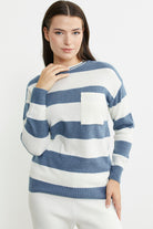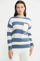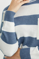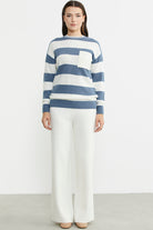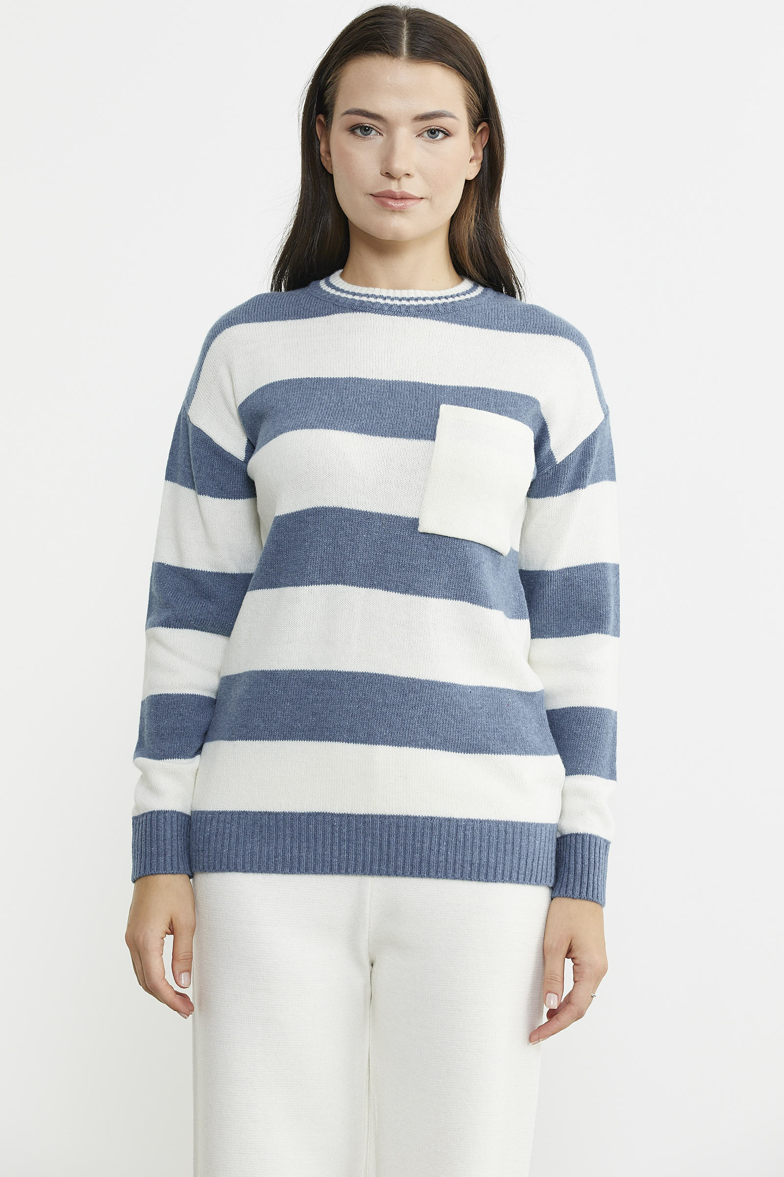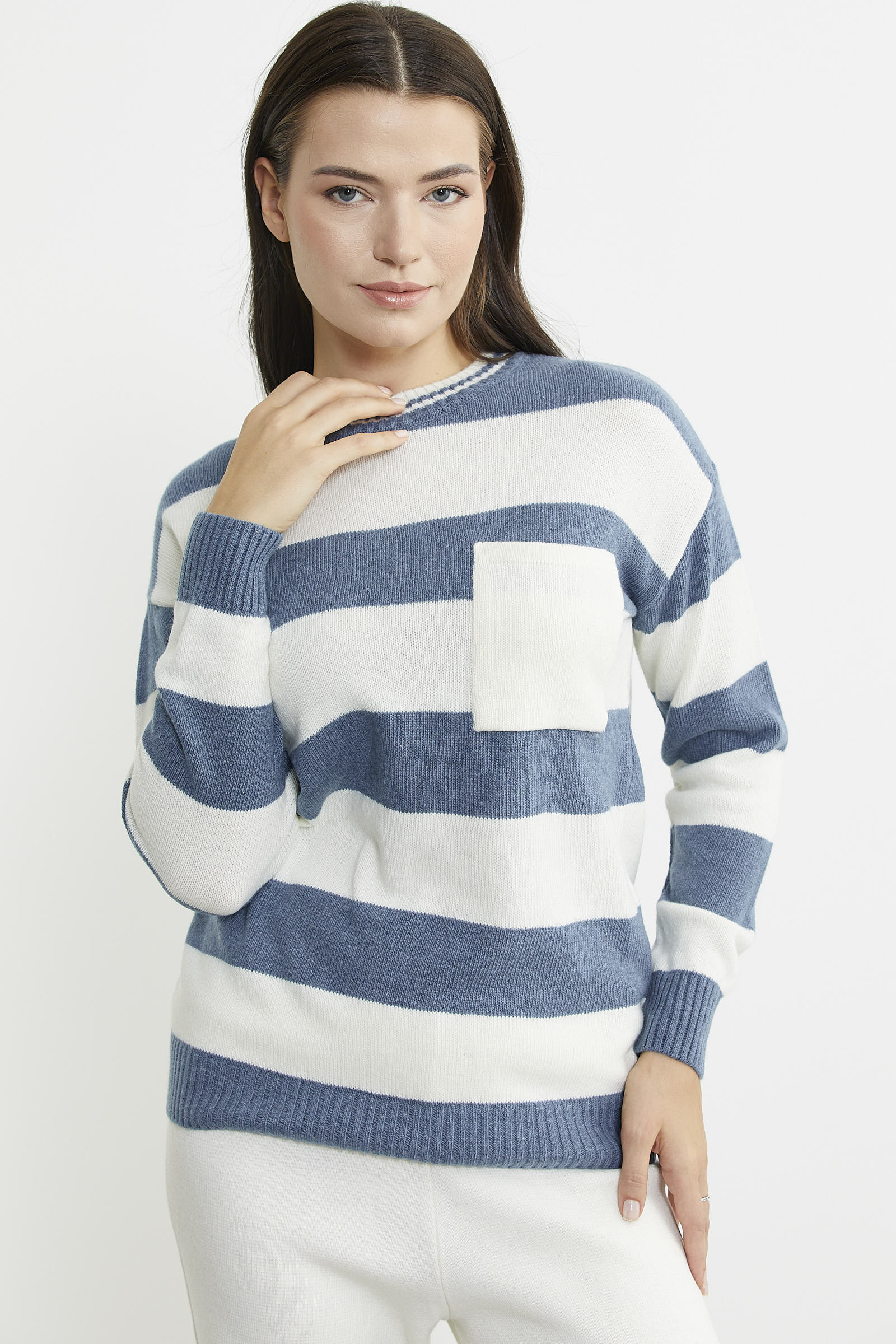 Cep Detaylı Çizgili Yünlü Triko Kazak - Mavi