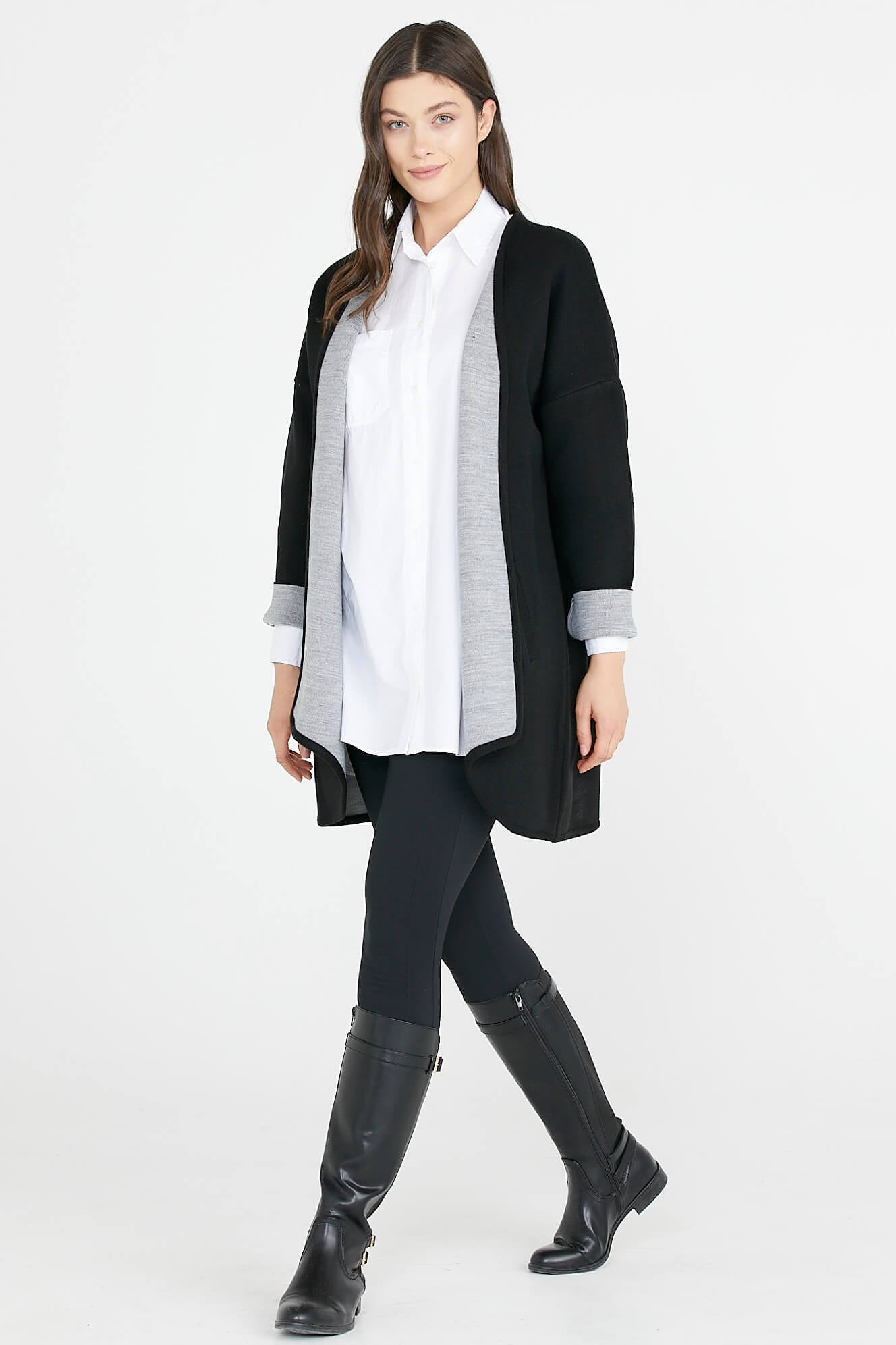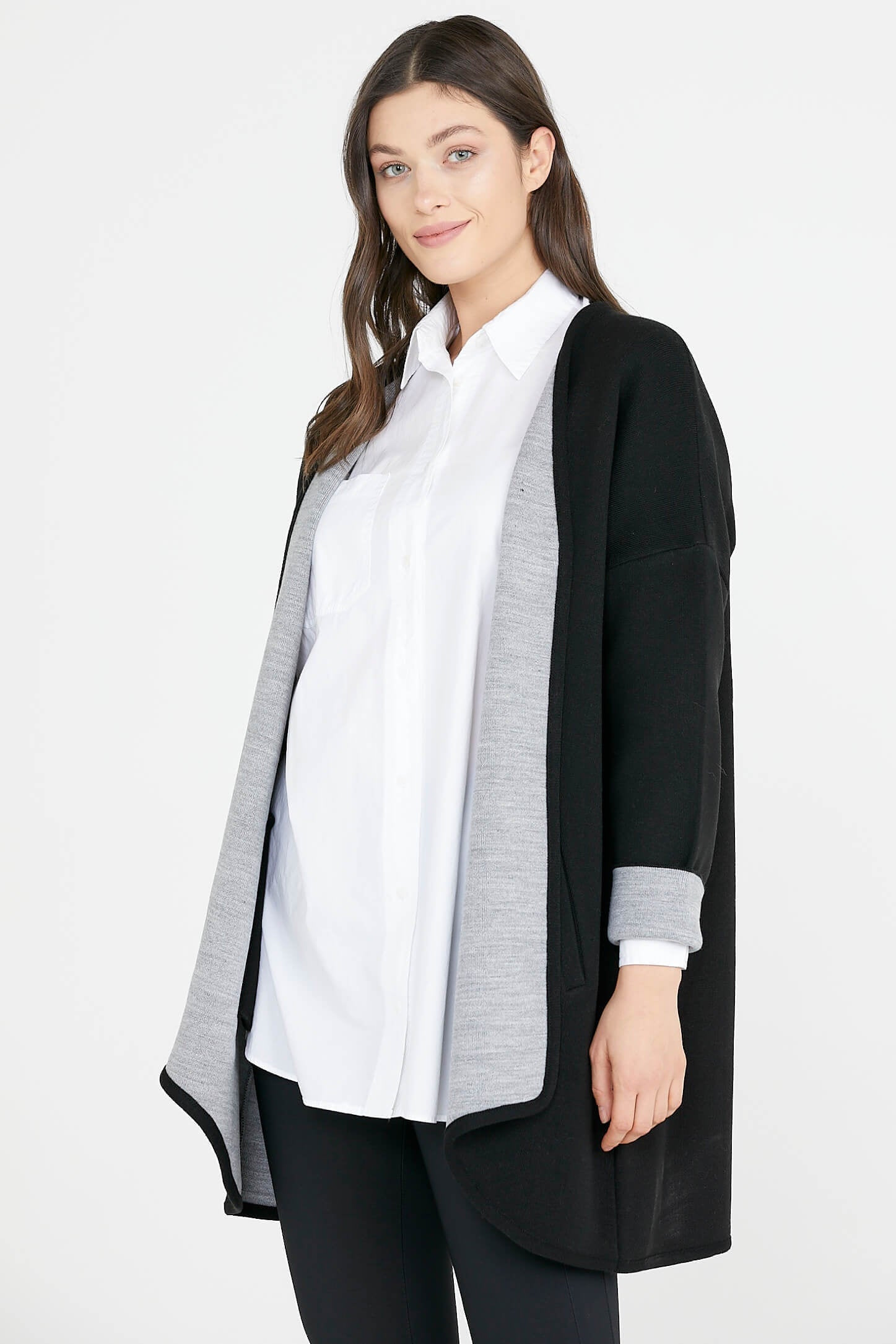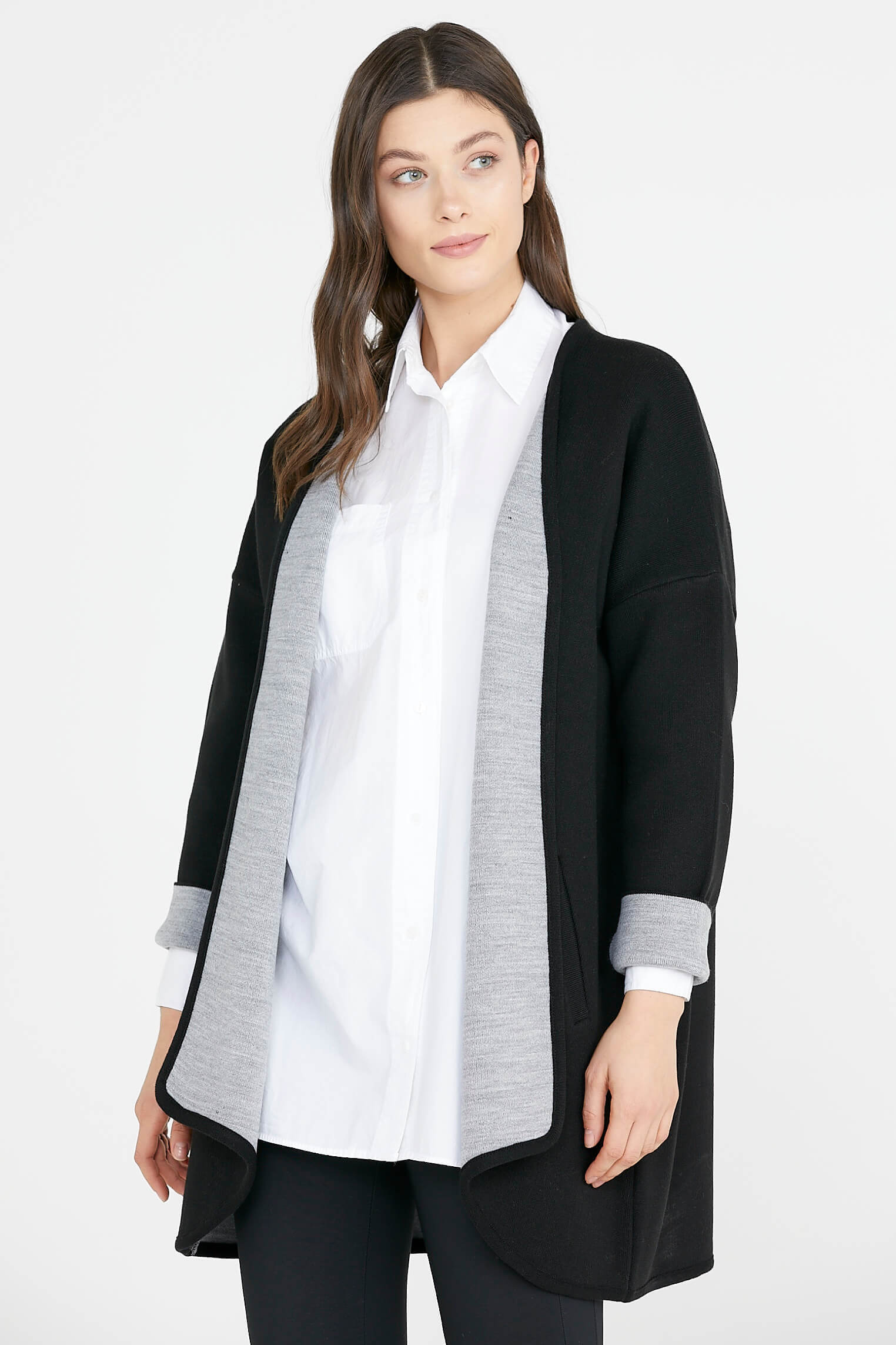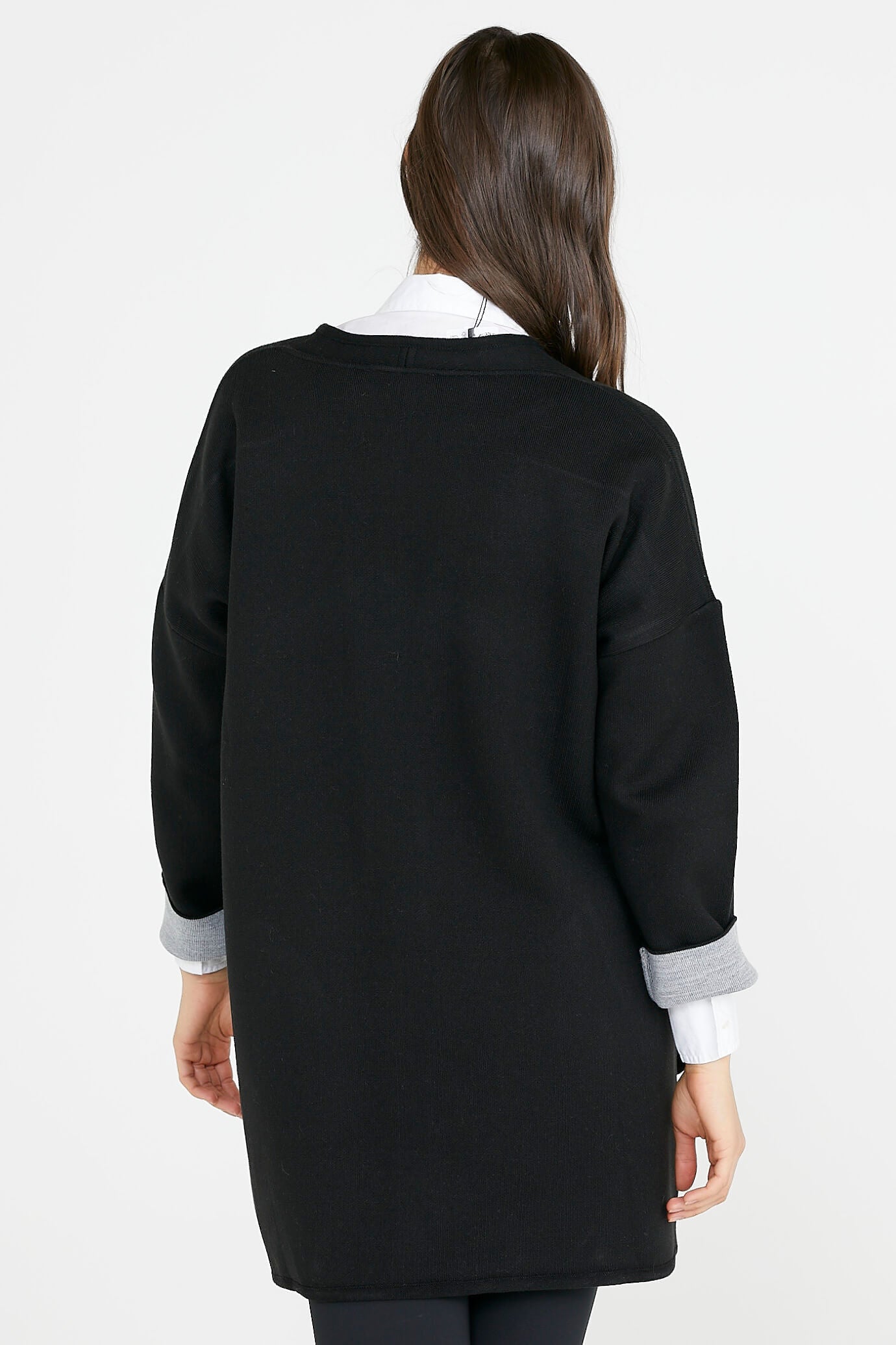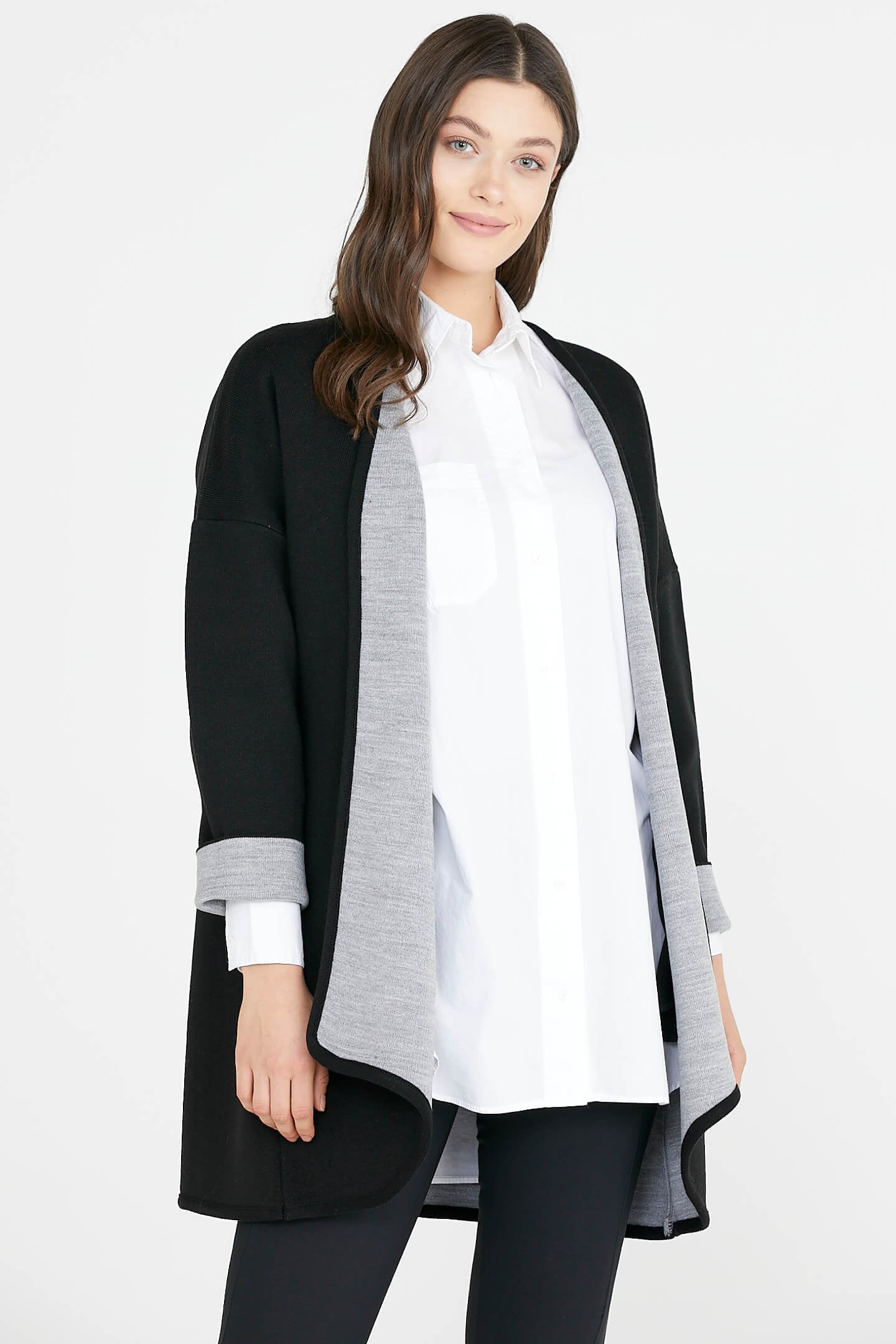 Triko hırka, çift renkli olması ile fark yaratıyor. Yalın formunu asimetrik dikiş detayları ile hareketlendiren bu tasarım, yakası ve uzun kollarıyla bütünlük sağlıyor. Triko hırka modern şehir stilinize şık bir dokunuş yaparak vazgeçilmez kıyafetleriniz arasında yer alıyor.
