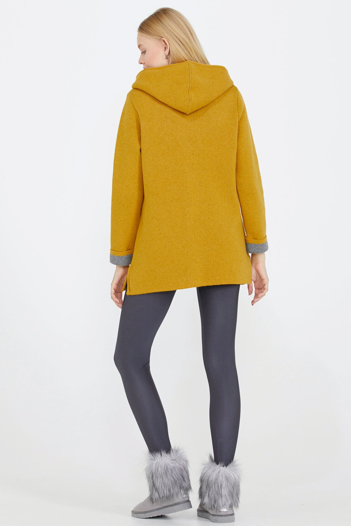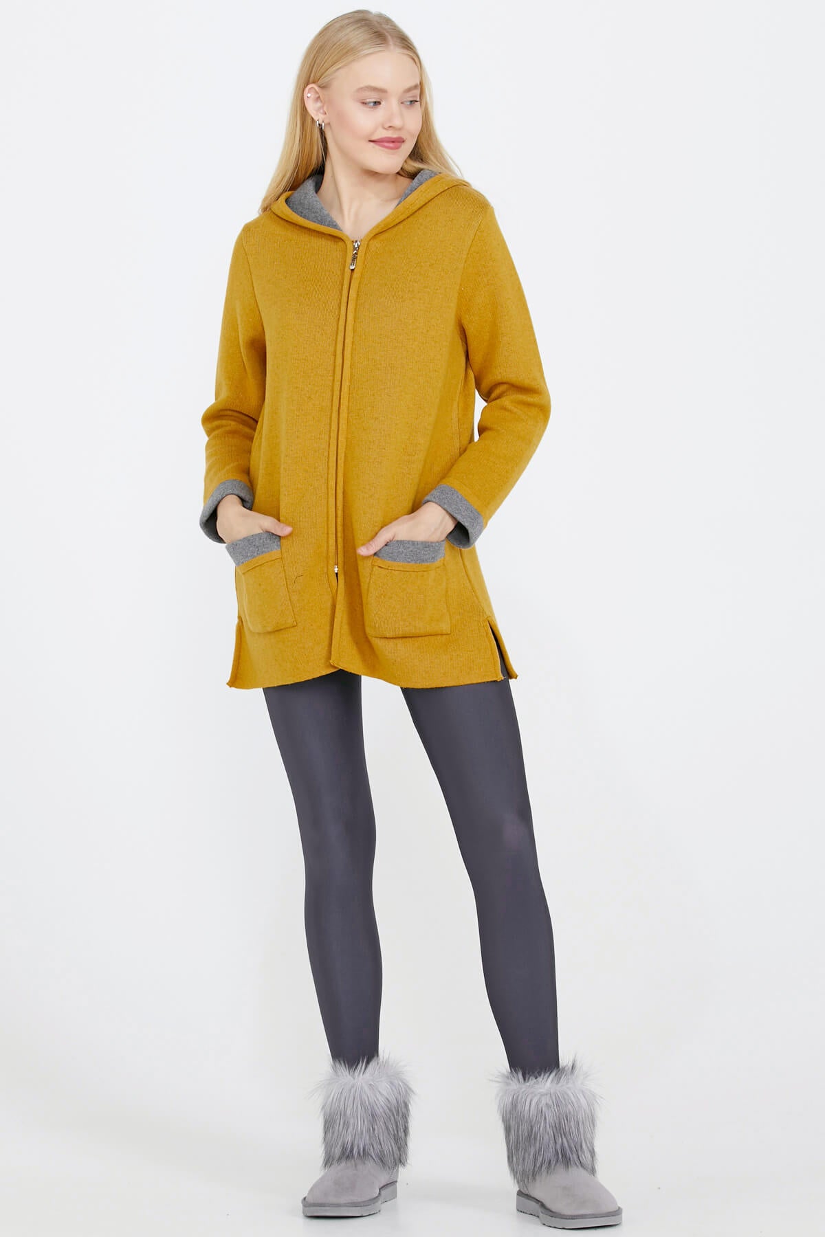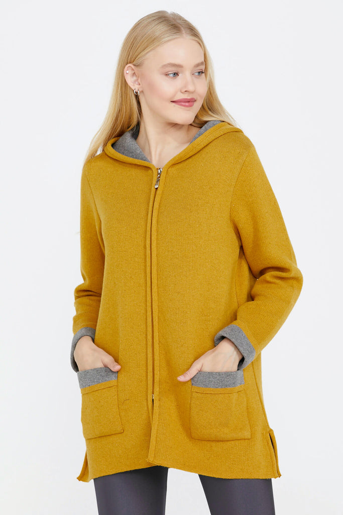 Sonbahar ve kış sezonunda kıyafetlerinizin tamamlayıcısı olan triko ceket, renkleriyle stil sahibi bir görünüme dikkat çekiyor. Kapüşonlu yaka, fermuar kapamalı ve uzun kol detaylı bu tasarım, yün karışımlı kumaş dokusu ile sıcacık bir stile sahip olmanızı sağlıyor.