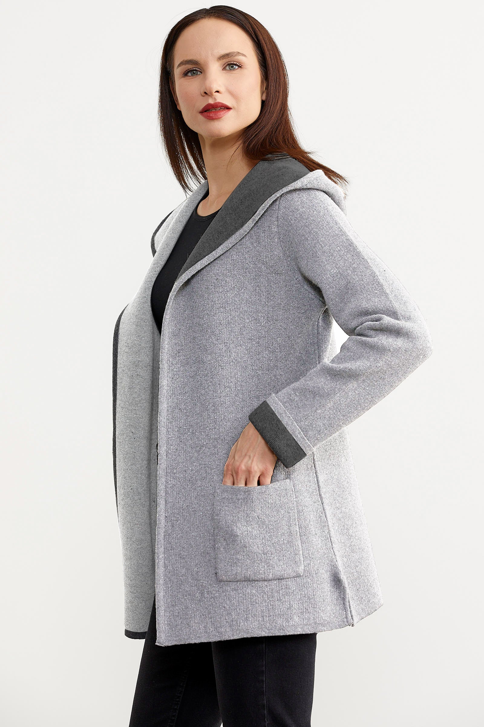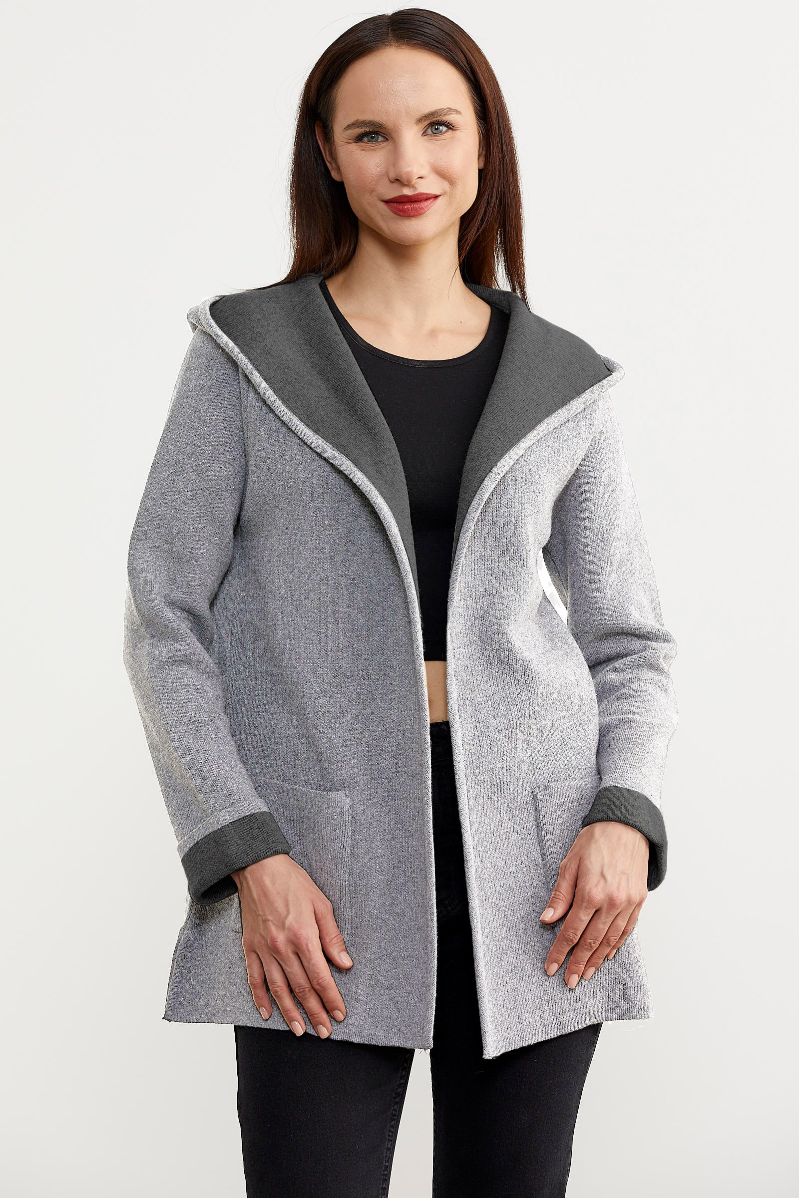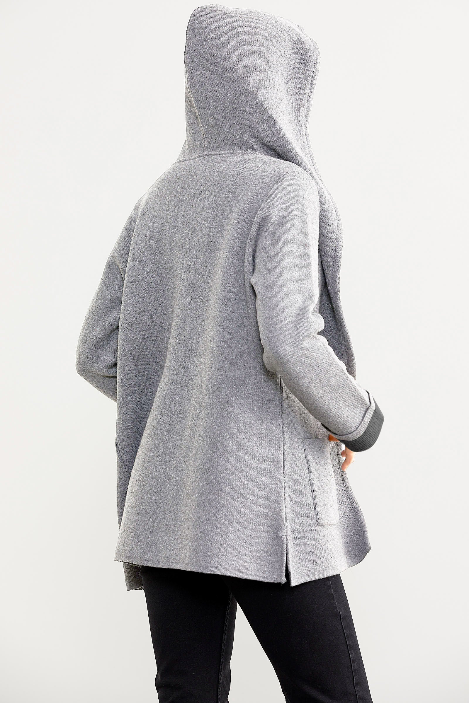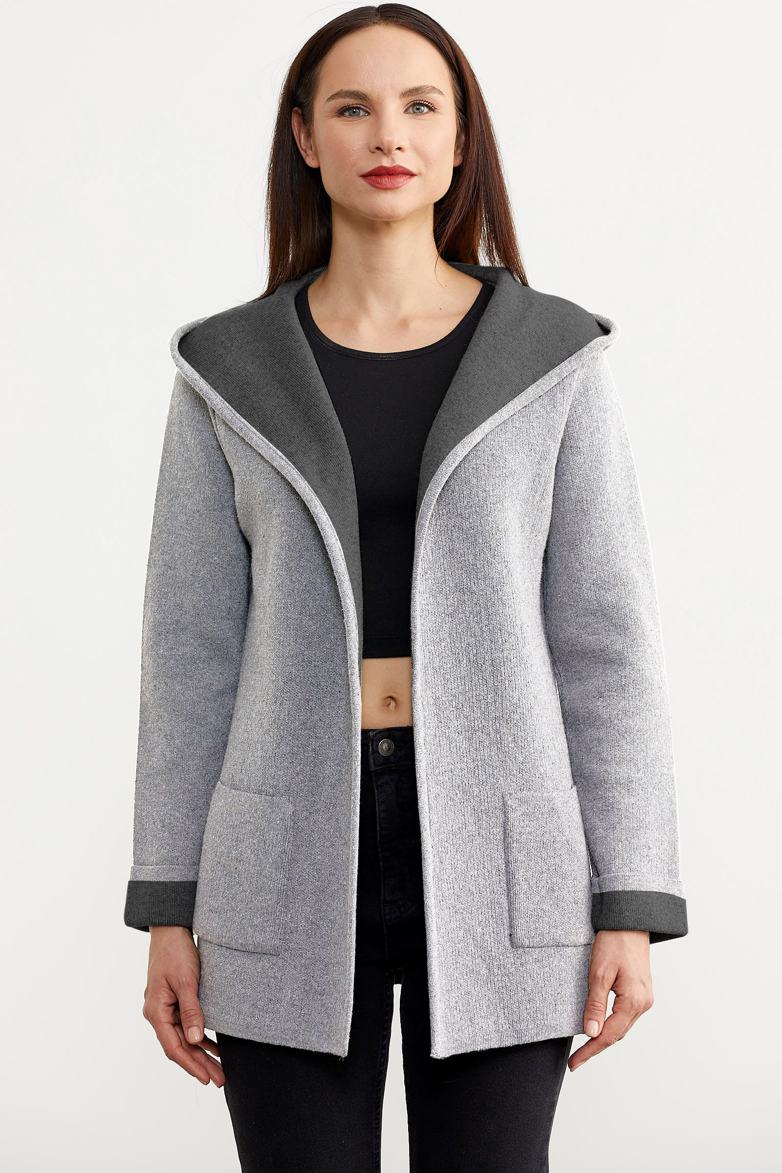 Cepli ve Kapüşonlu Yünlü Triko Ceket - Açık Gri - Koyu Gri