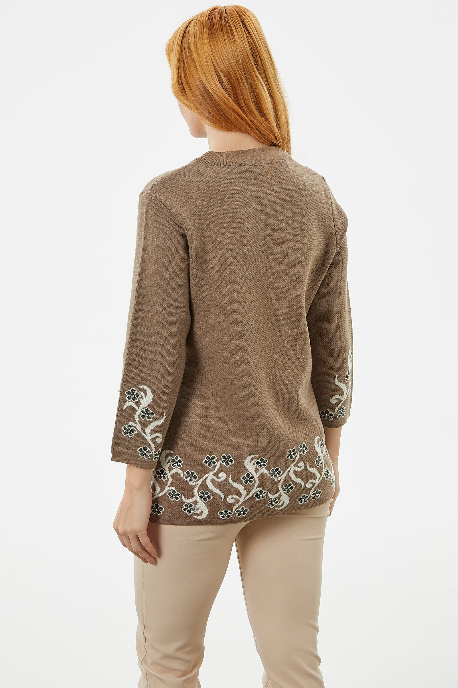 Çiçek Desen Detaylı Yünlü Triko Hırka - Sütlü Kahve
