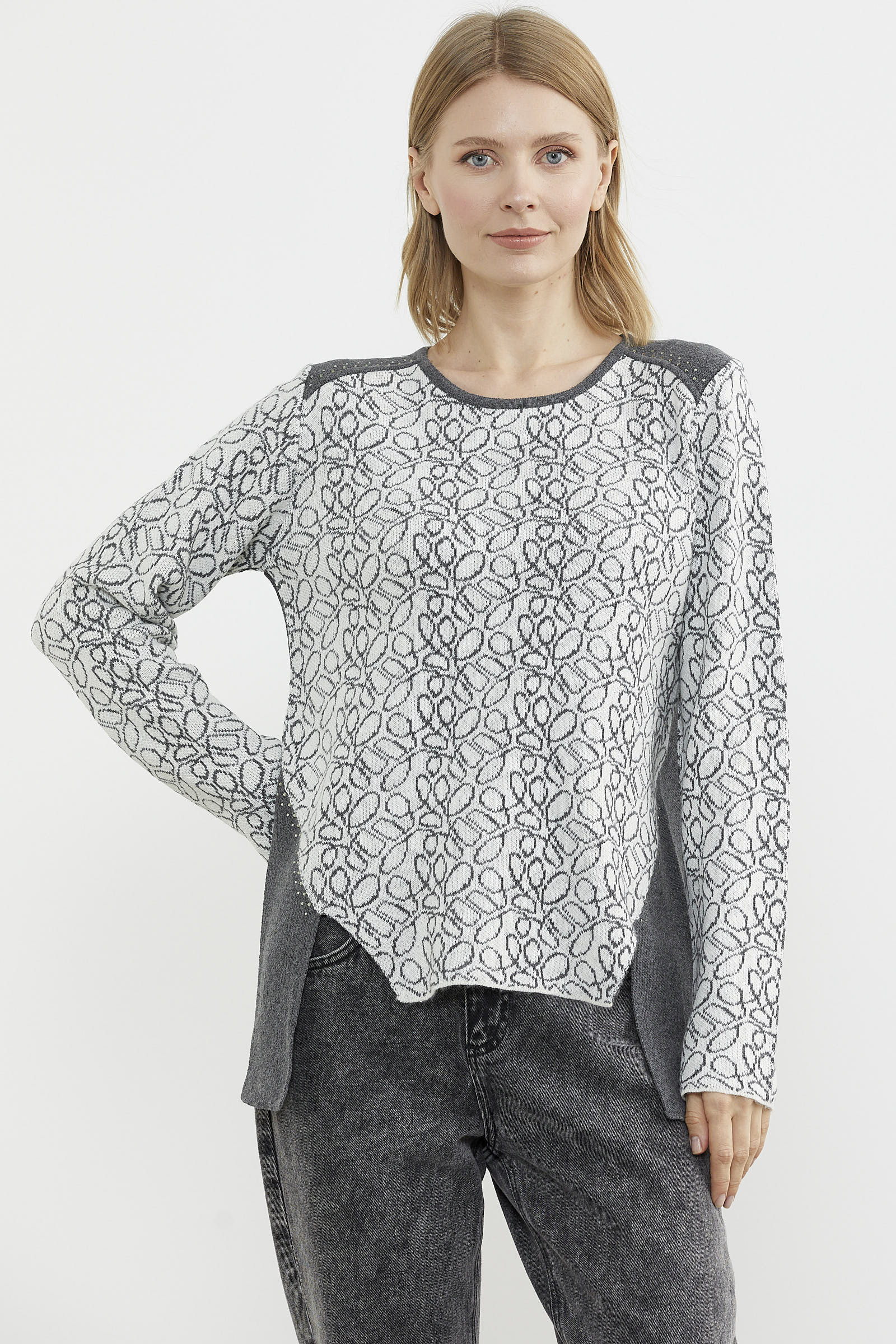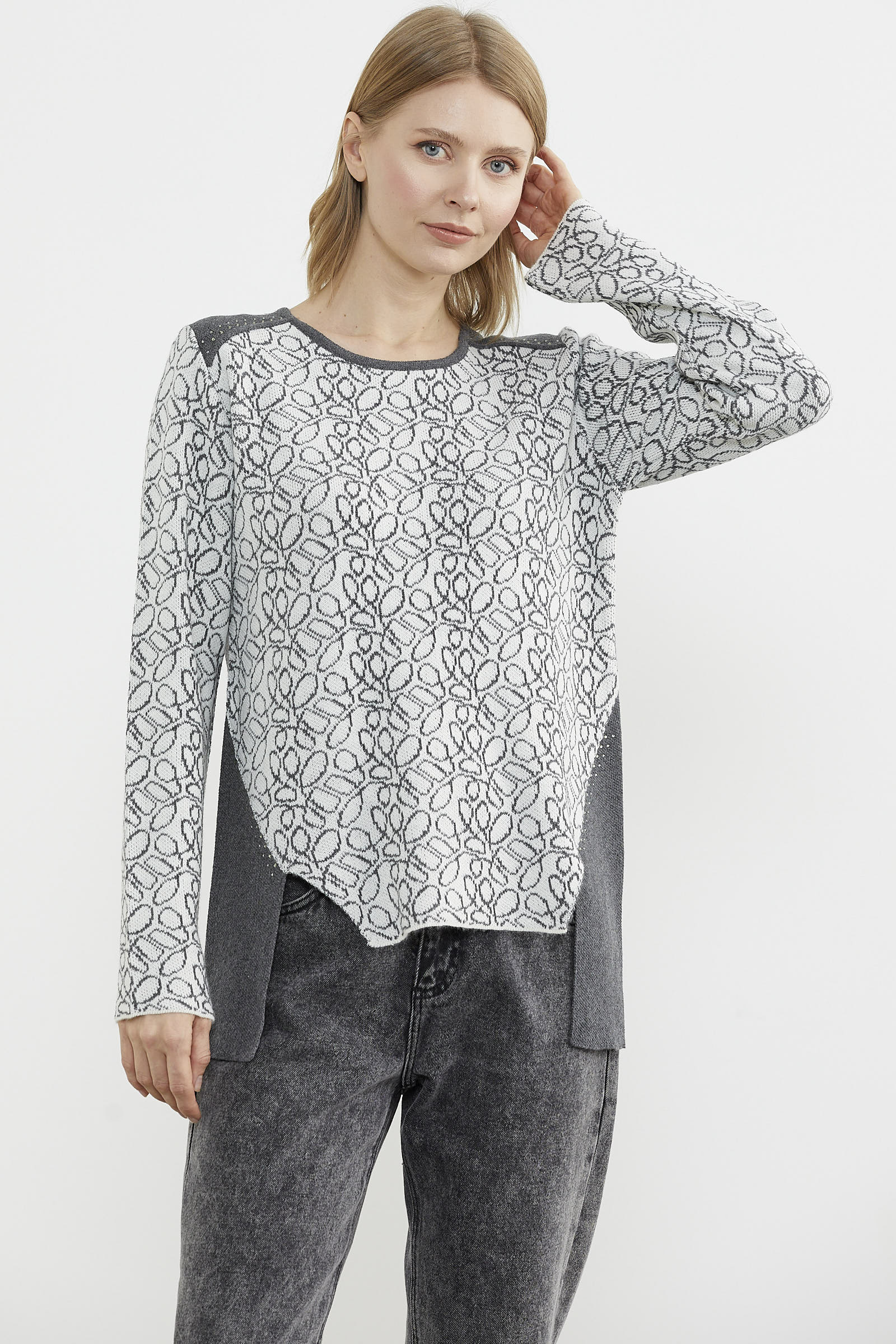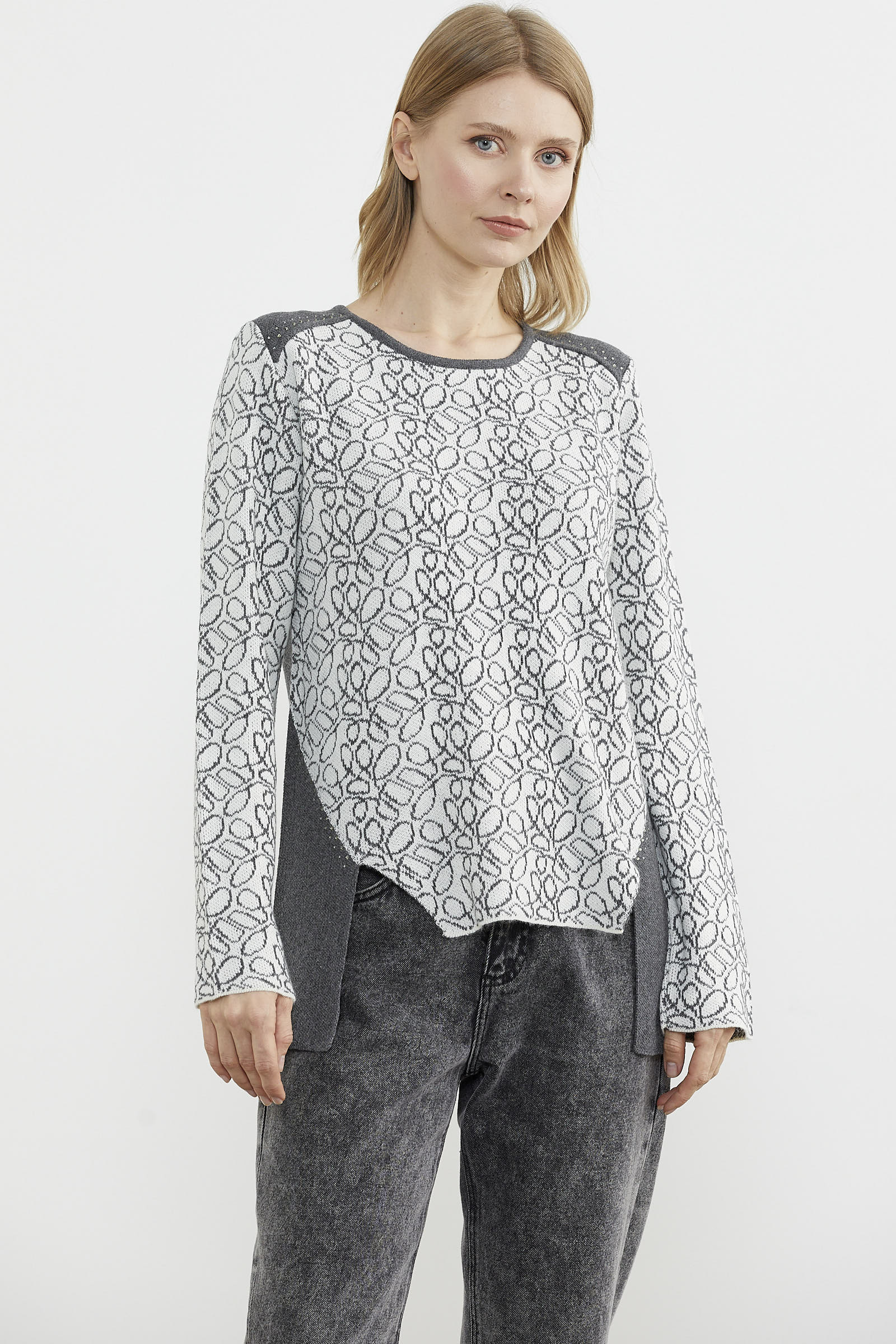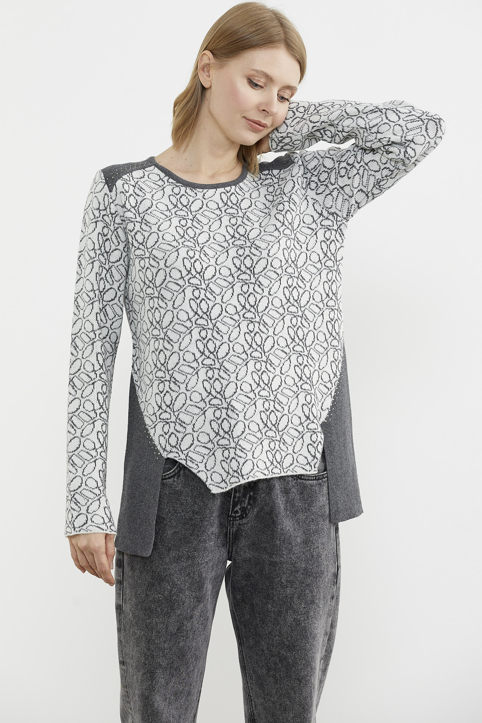 Asimetrik kesimi ile ön plana çıkan desenleri sayesinde canlı bir görünüm kazanan arkası düz sıfır yaka uzun kollu esnek kumaşlı ve yün dokusu ile sıcacık hissettiren uzun triko kazak .