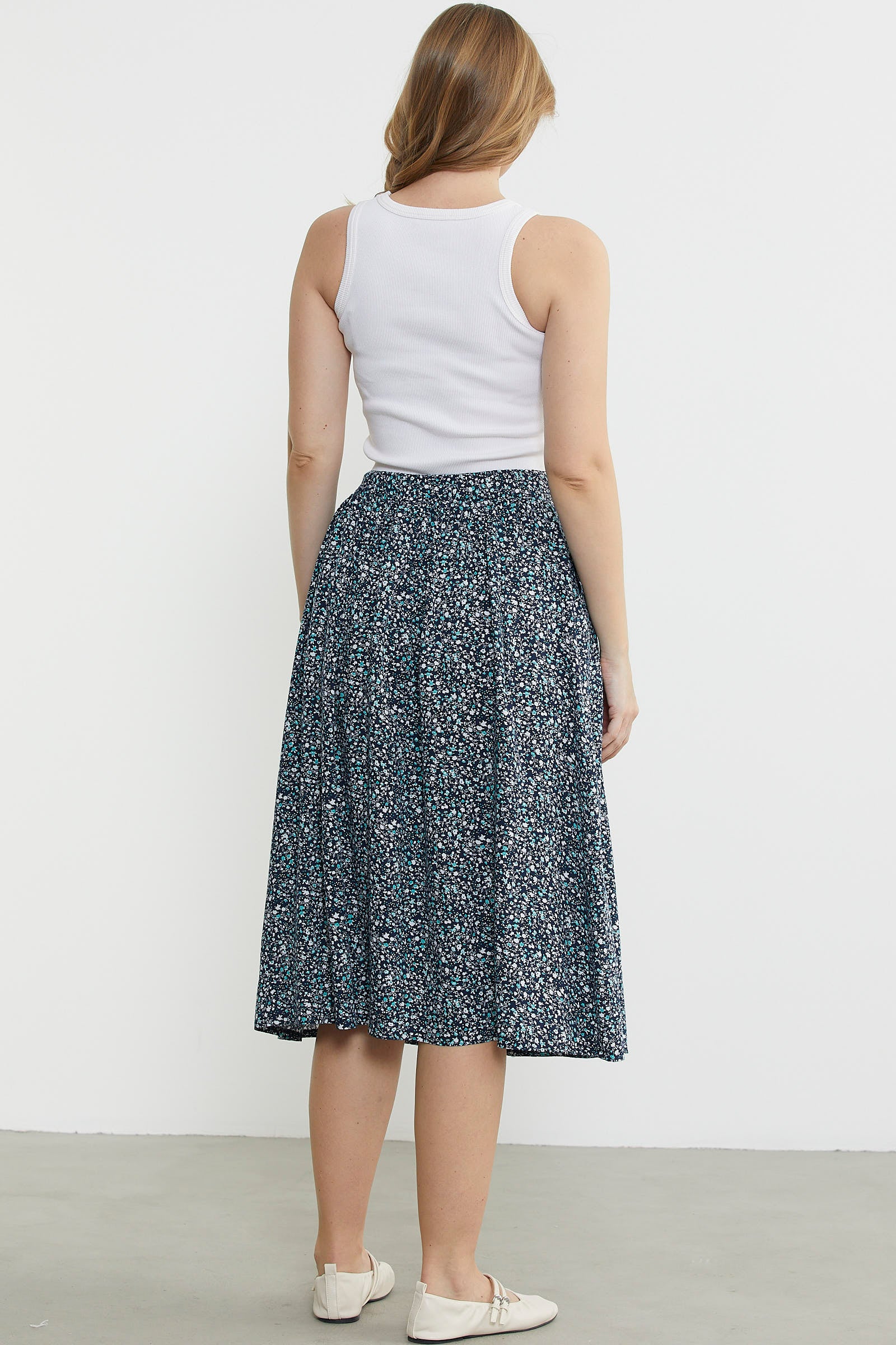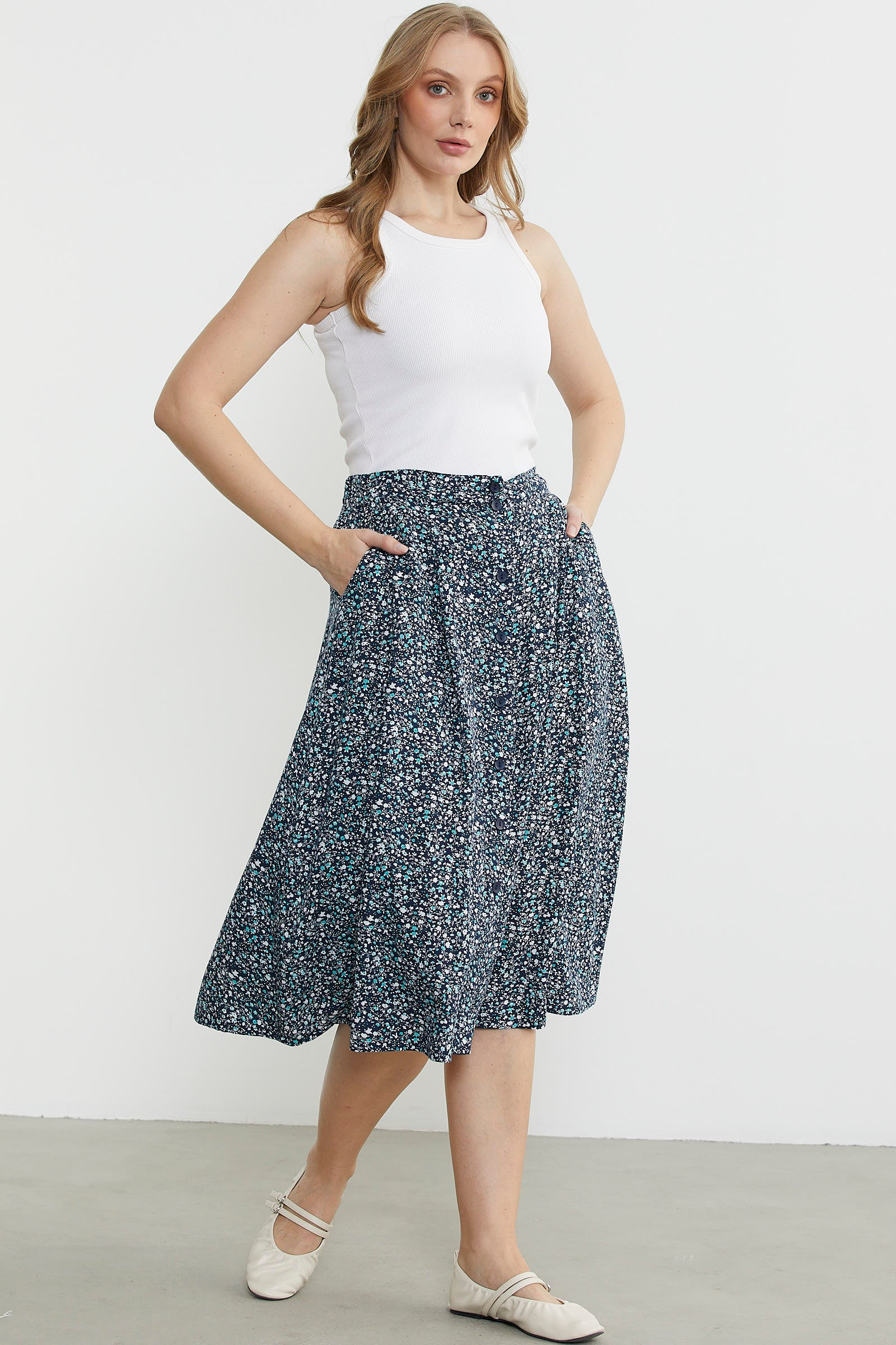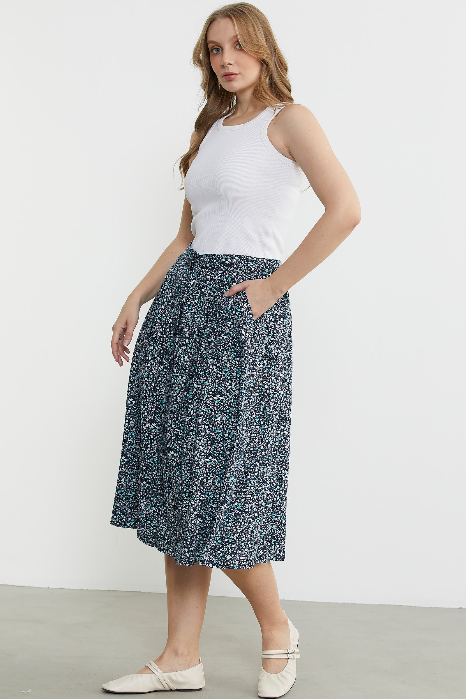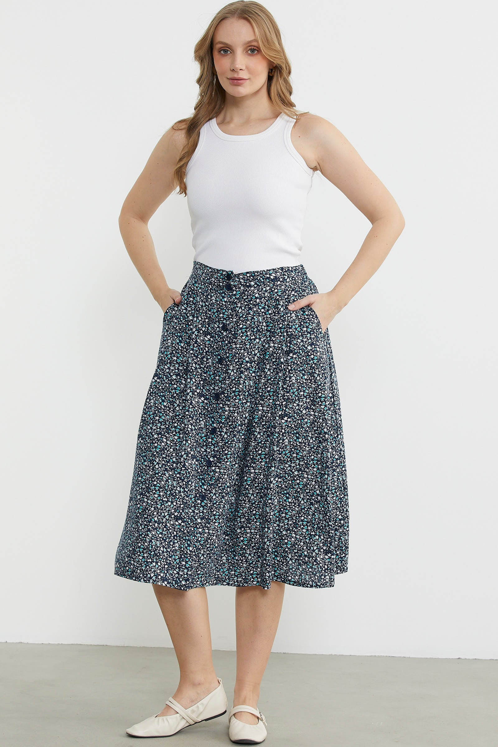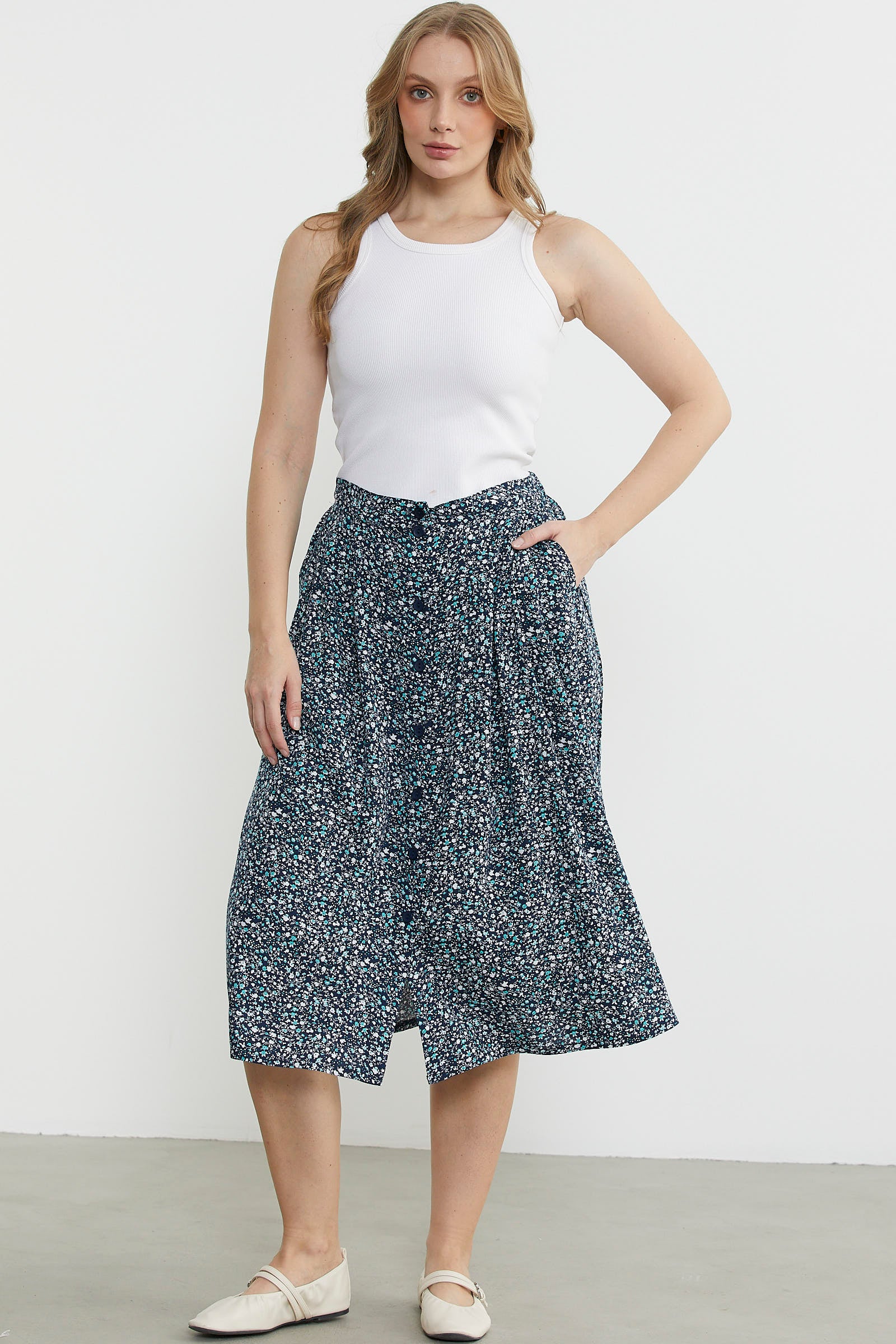Önü tamamen düğmeli, desenli, midi boy etek. Cepli ve geniş kalıptır.