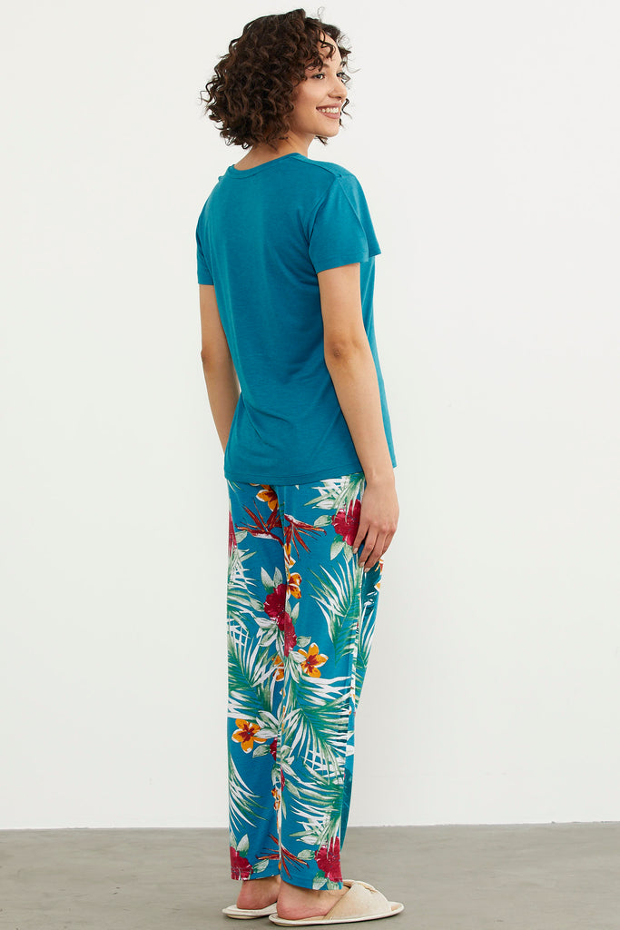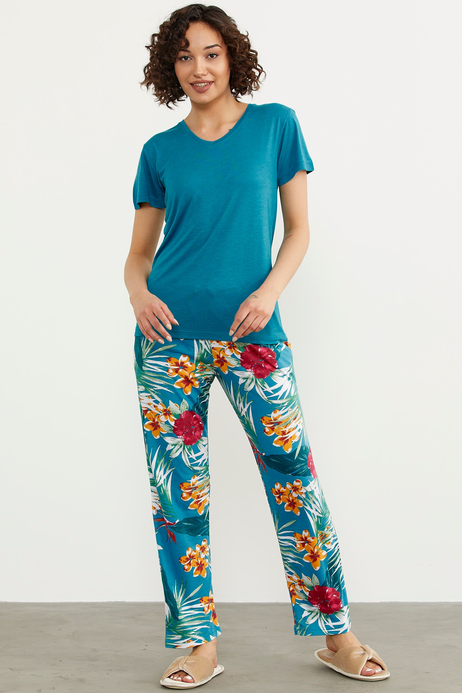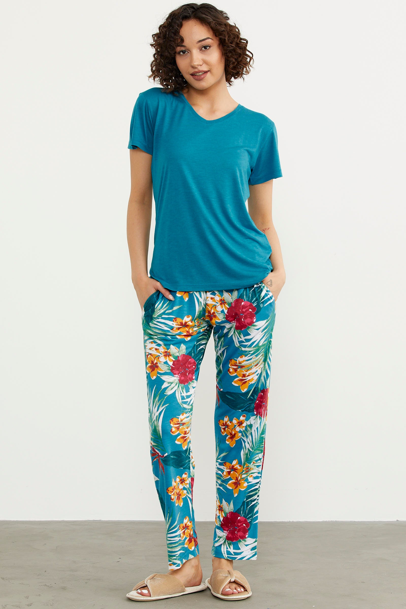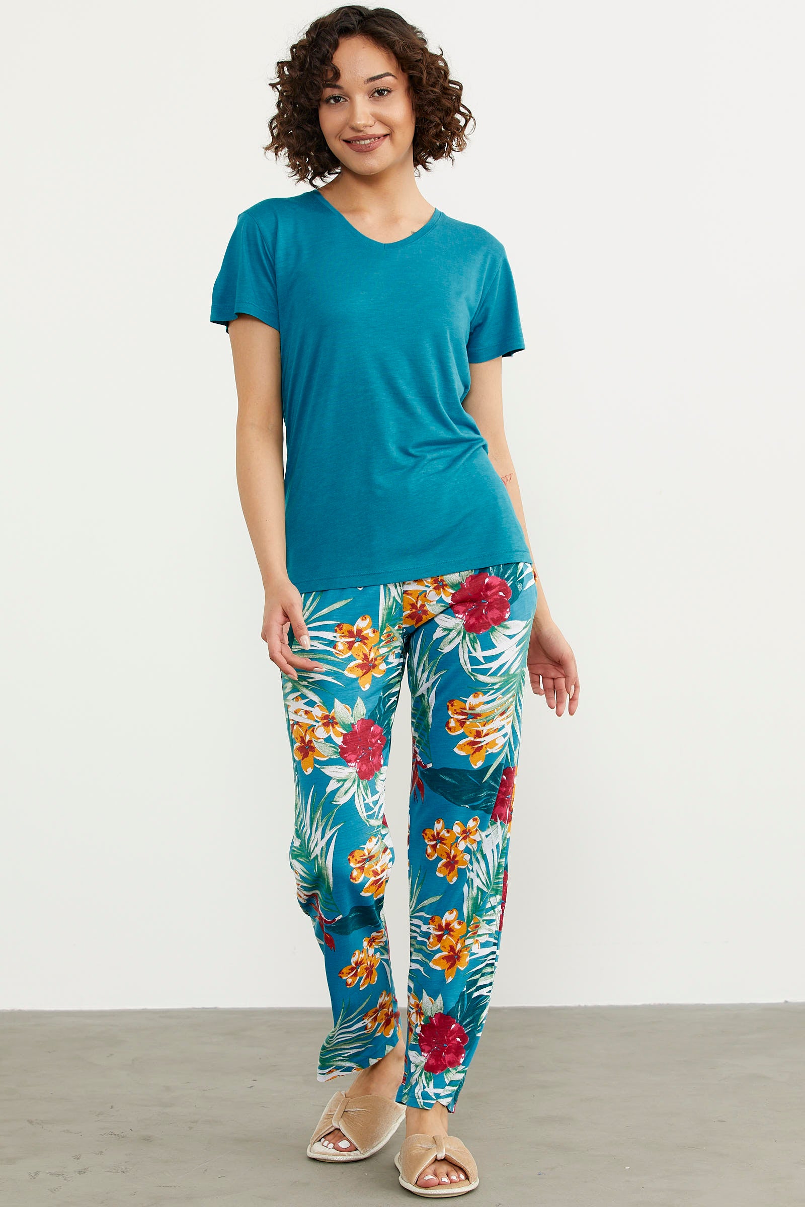 Üstü V yaka, düz ; altı çiçek desenli ikili pijama takımı size hareket özgürlüğü sunarken rengiyle canlılık katacaktır. Yaz günlerinde dokusu ve kalıbı sayesinde ferah hissedeceksiniz.