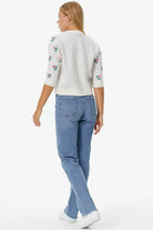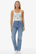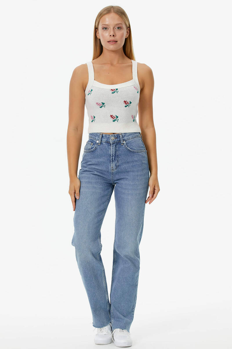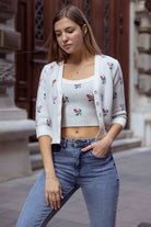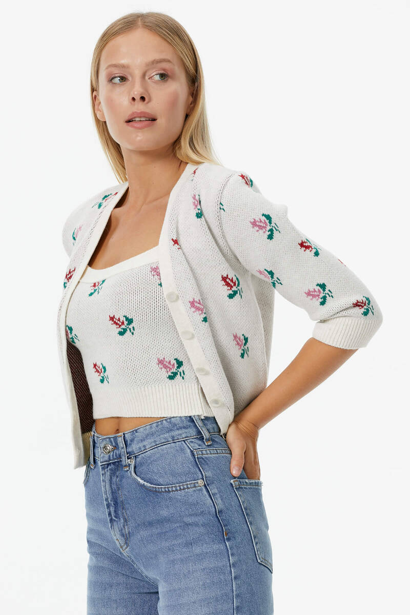 V yaka, truvakar kollu, düğme kapamalı hırka ve kare yaka, askılı croptan oluşan çiçek desenli formu ile ön plana çıkan triko takım ile siz de etkileyici görünümler yaratın.