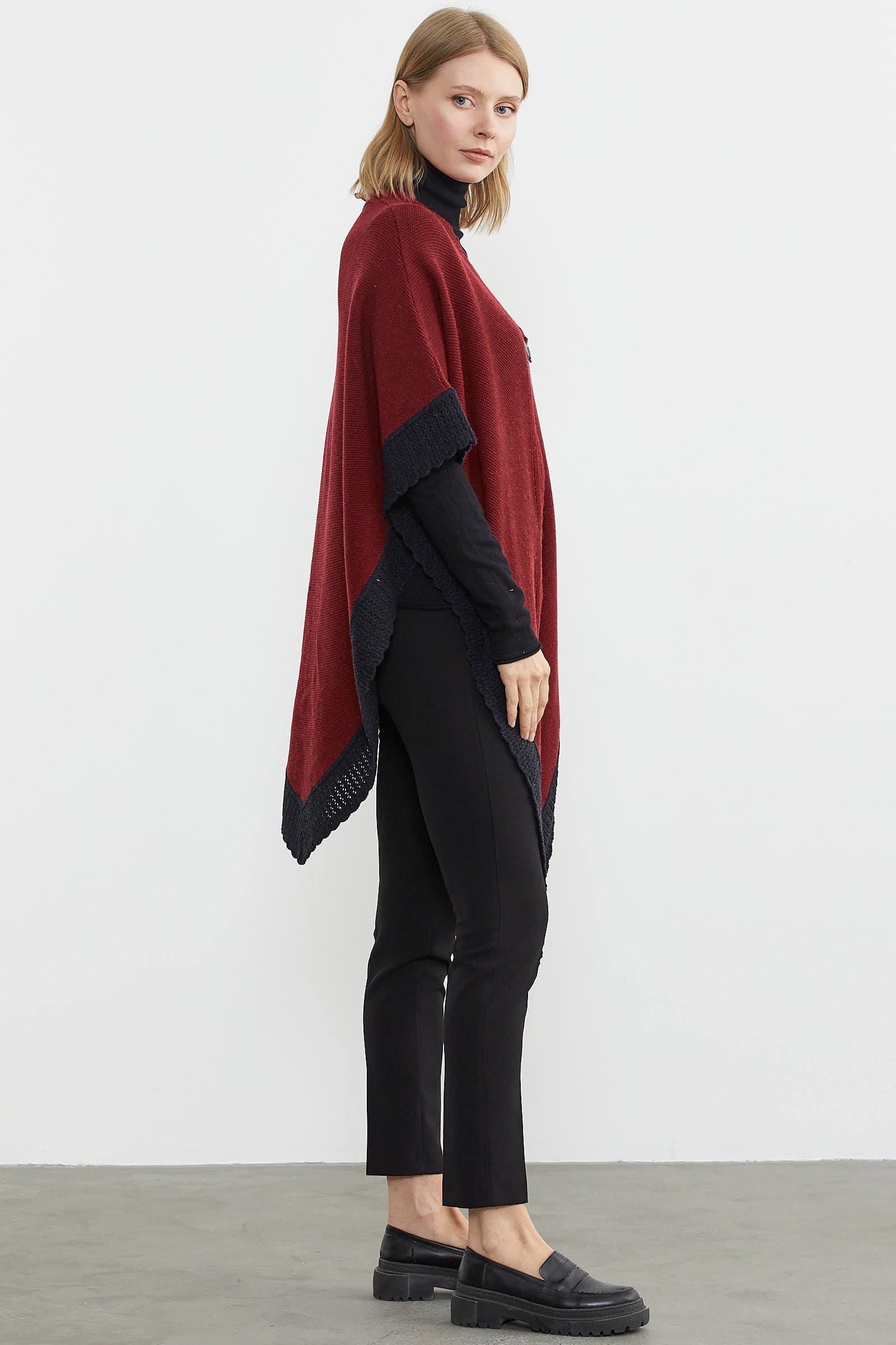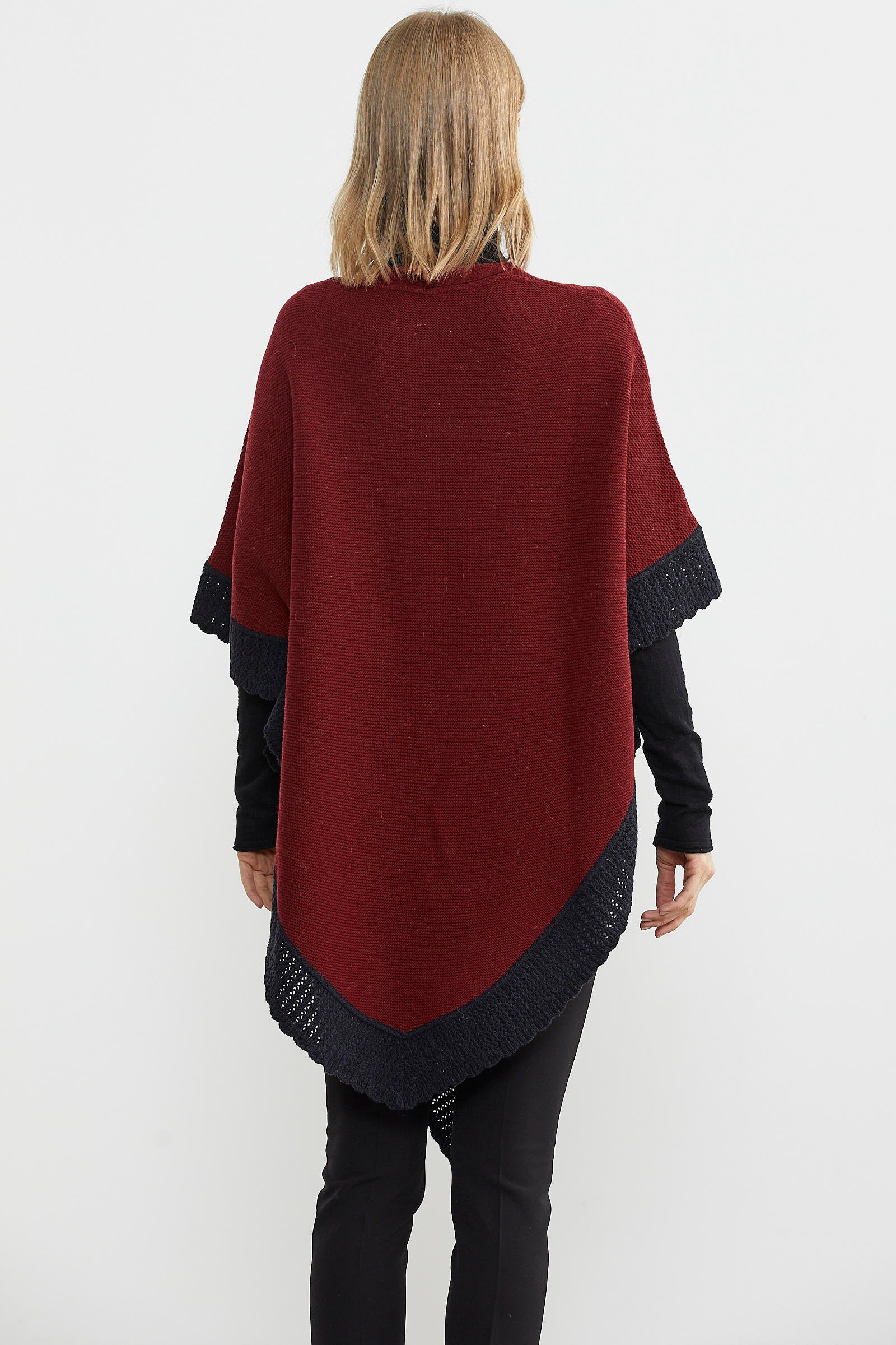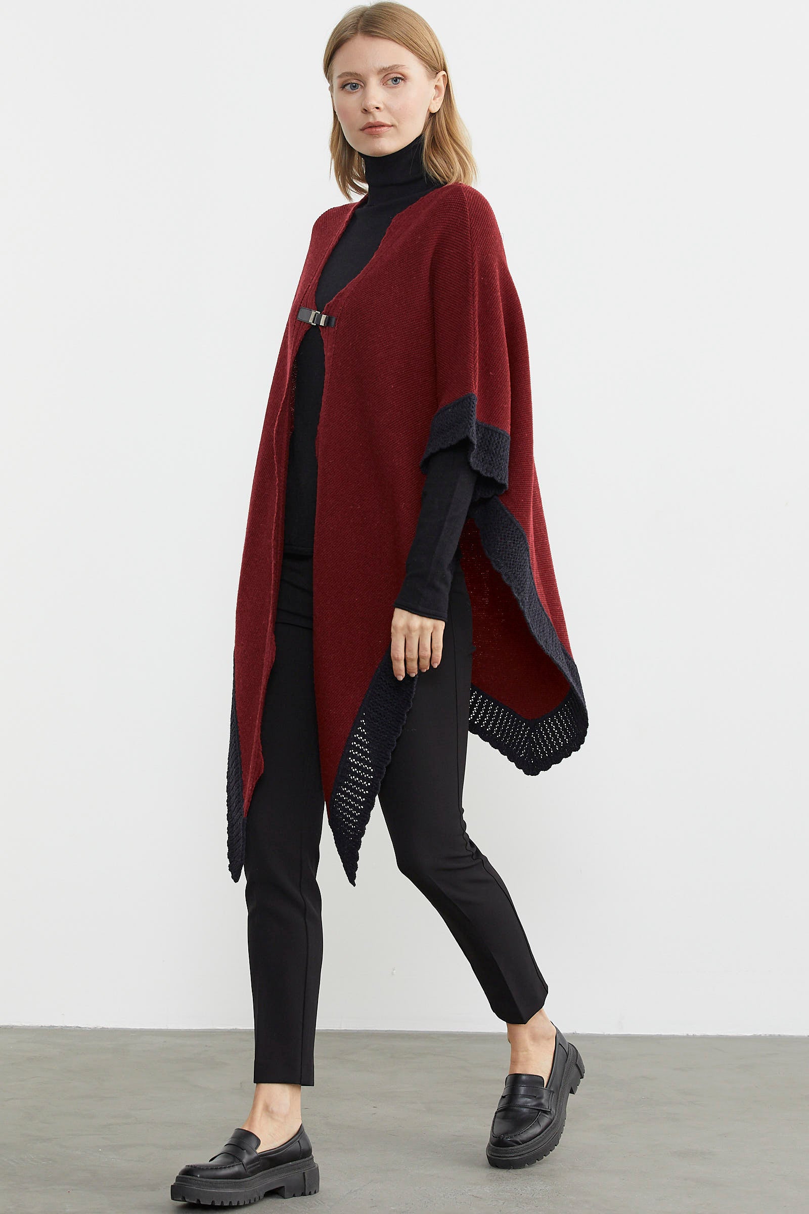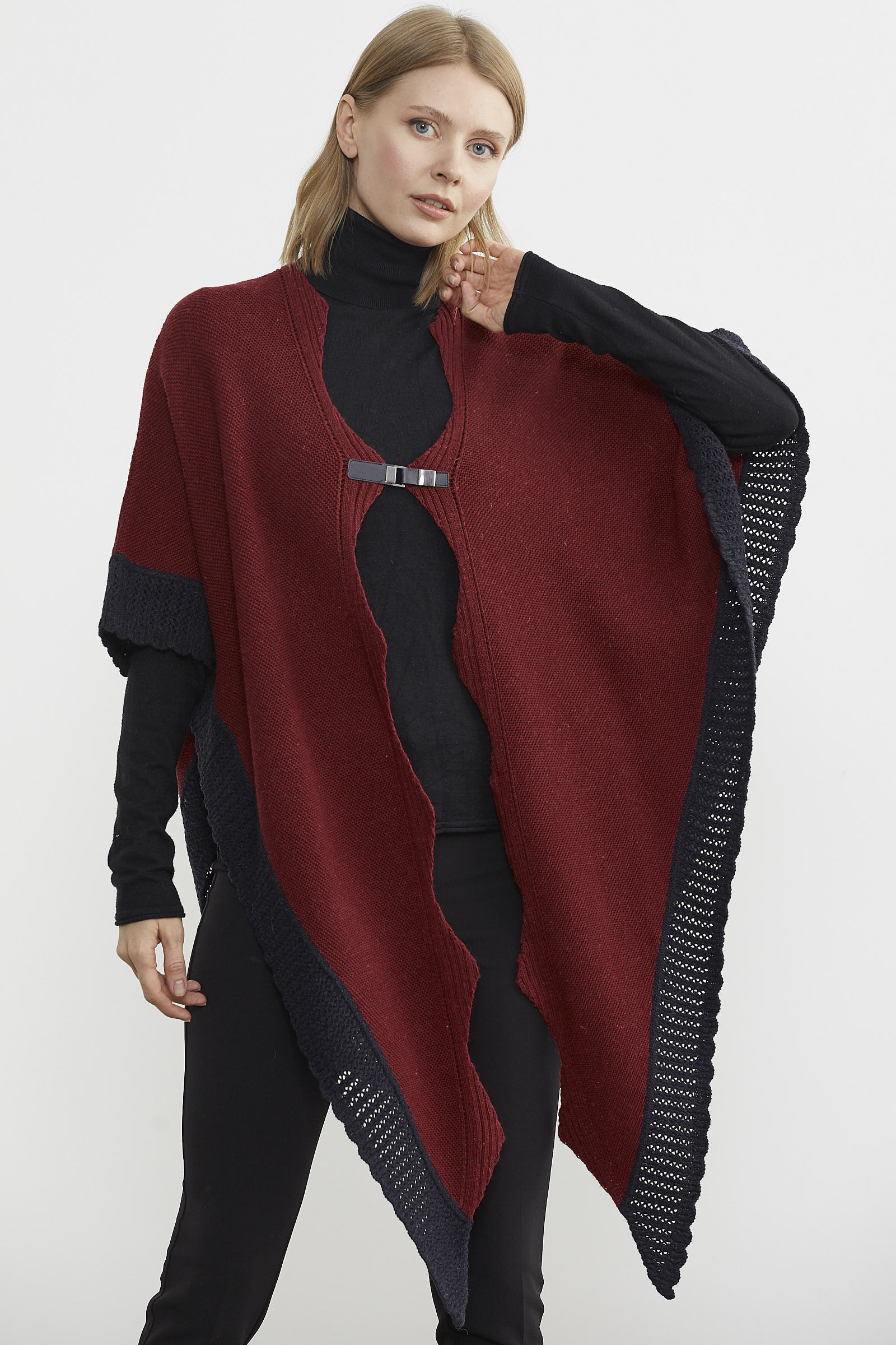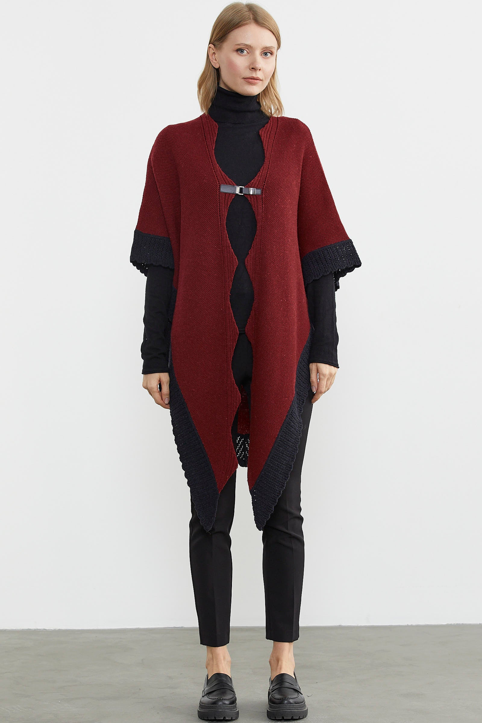 Çift Renk Aksesuarlı Triko Panço - Bordo