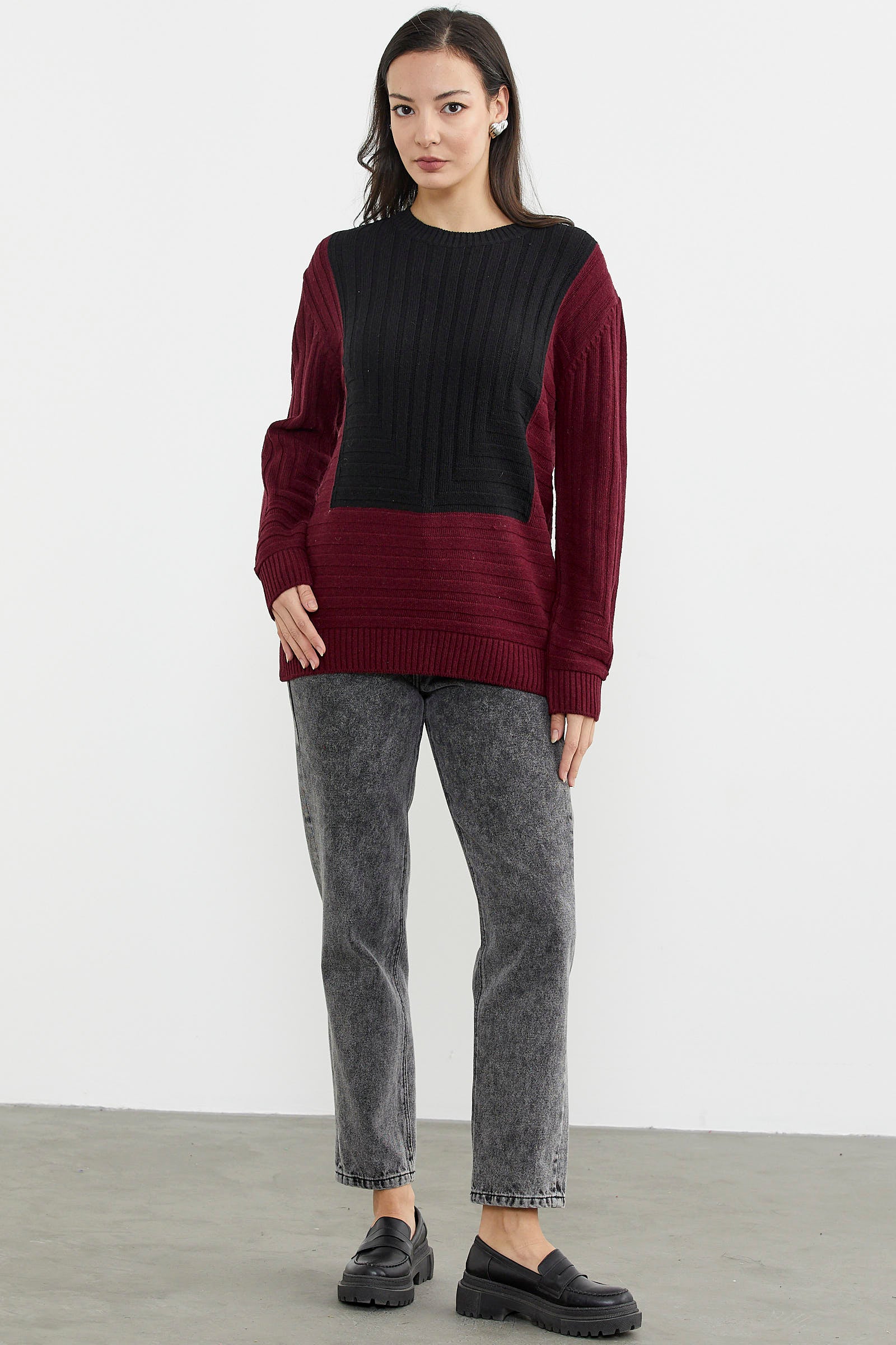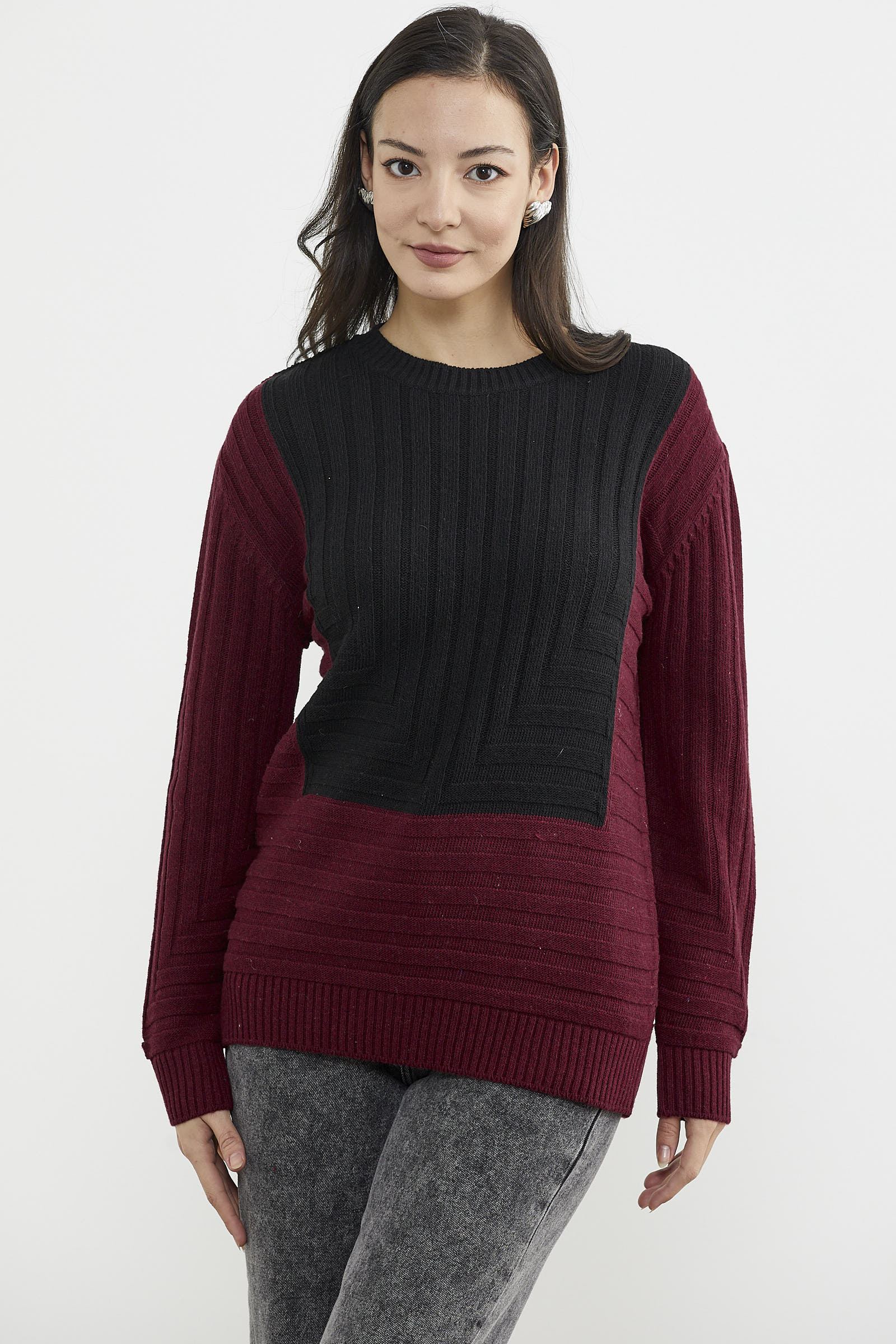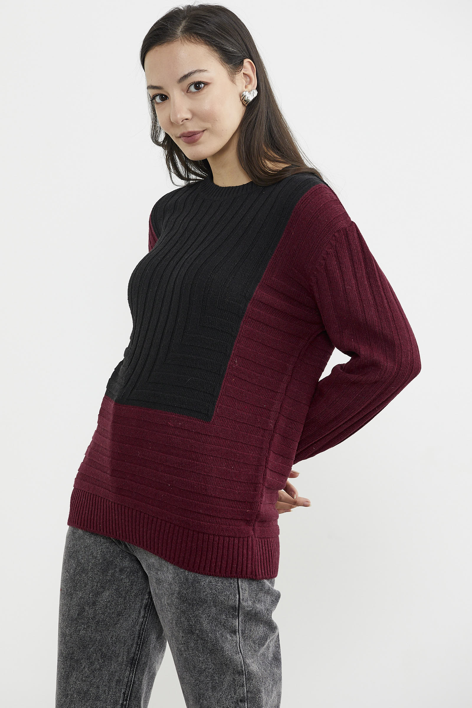 Çift Renk Kalın Fitilli Triko Kazak - Bordo - Siyah
