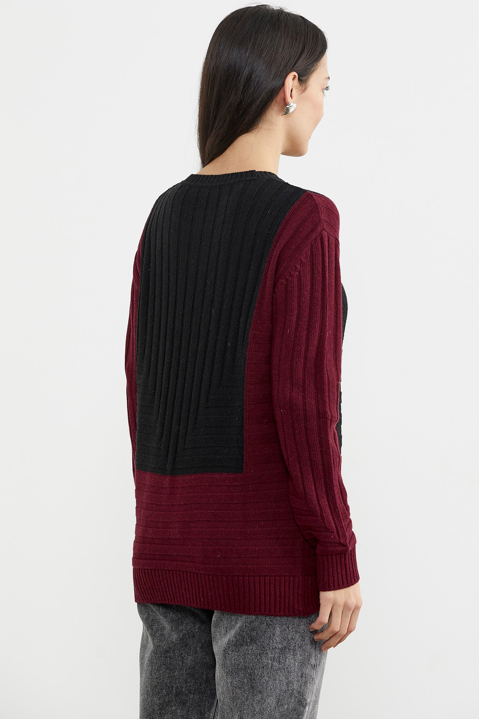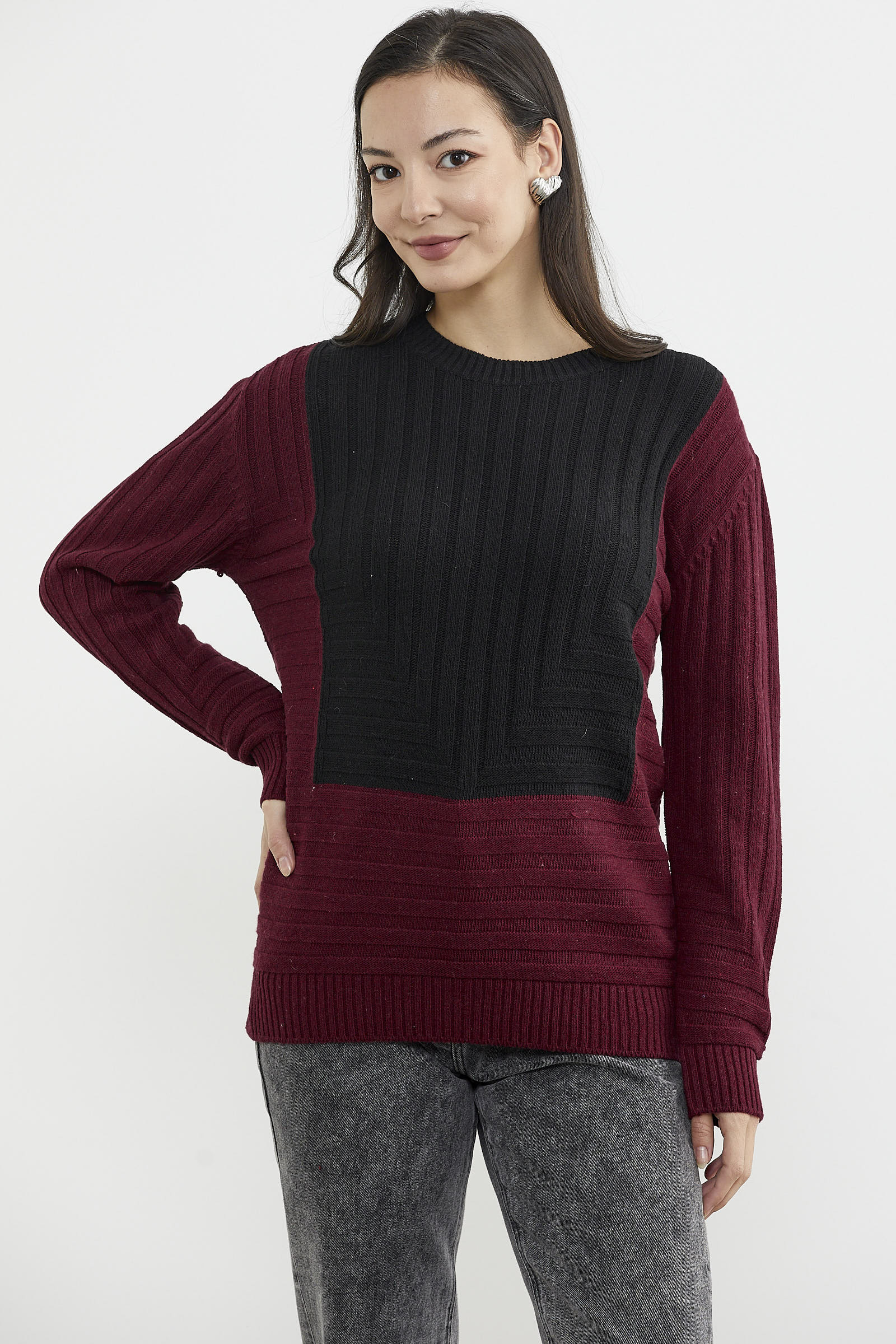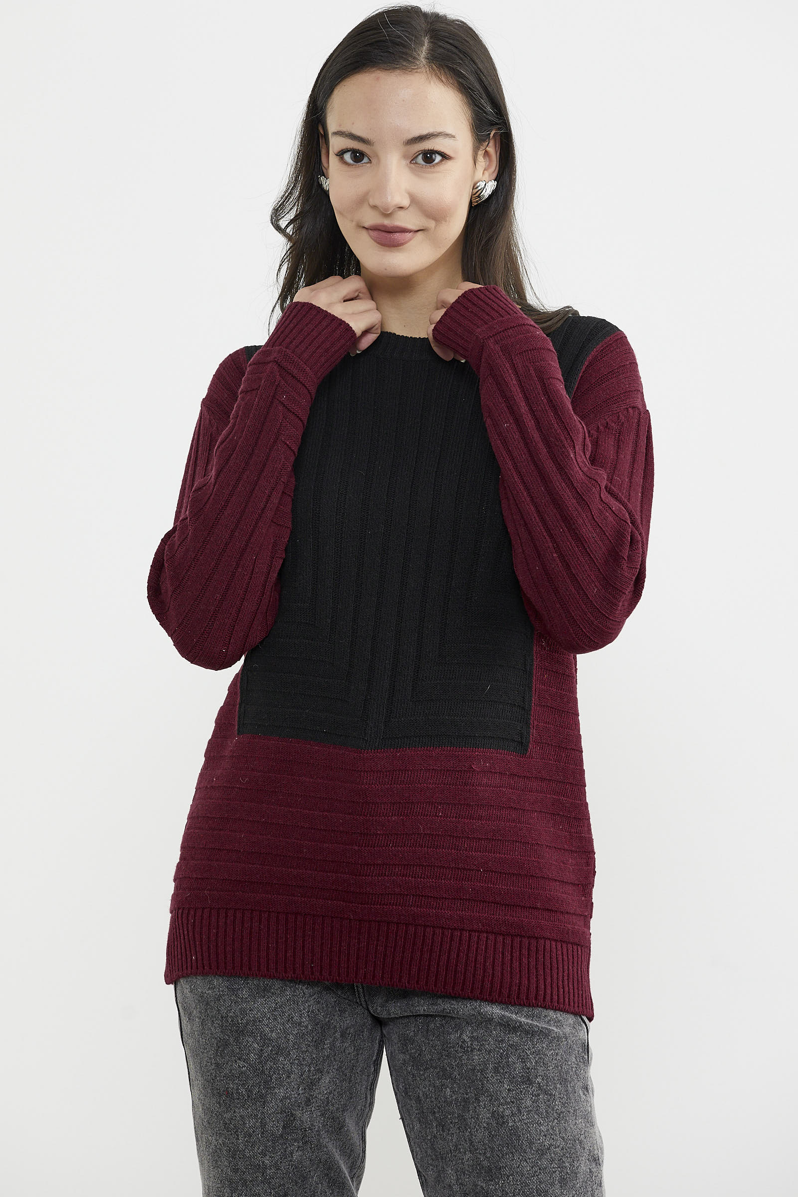 Çift Renk Kalın Fitilli Triko Kazak - Bordo - Siyah