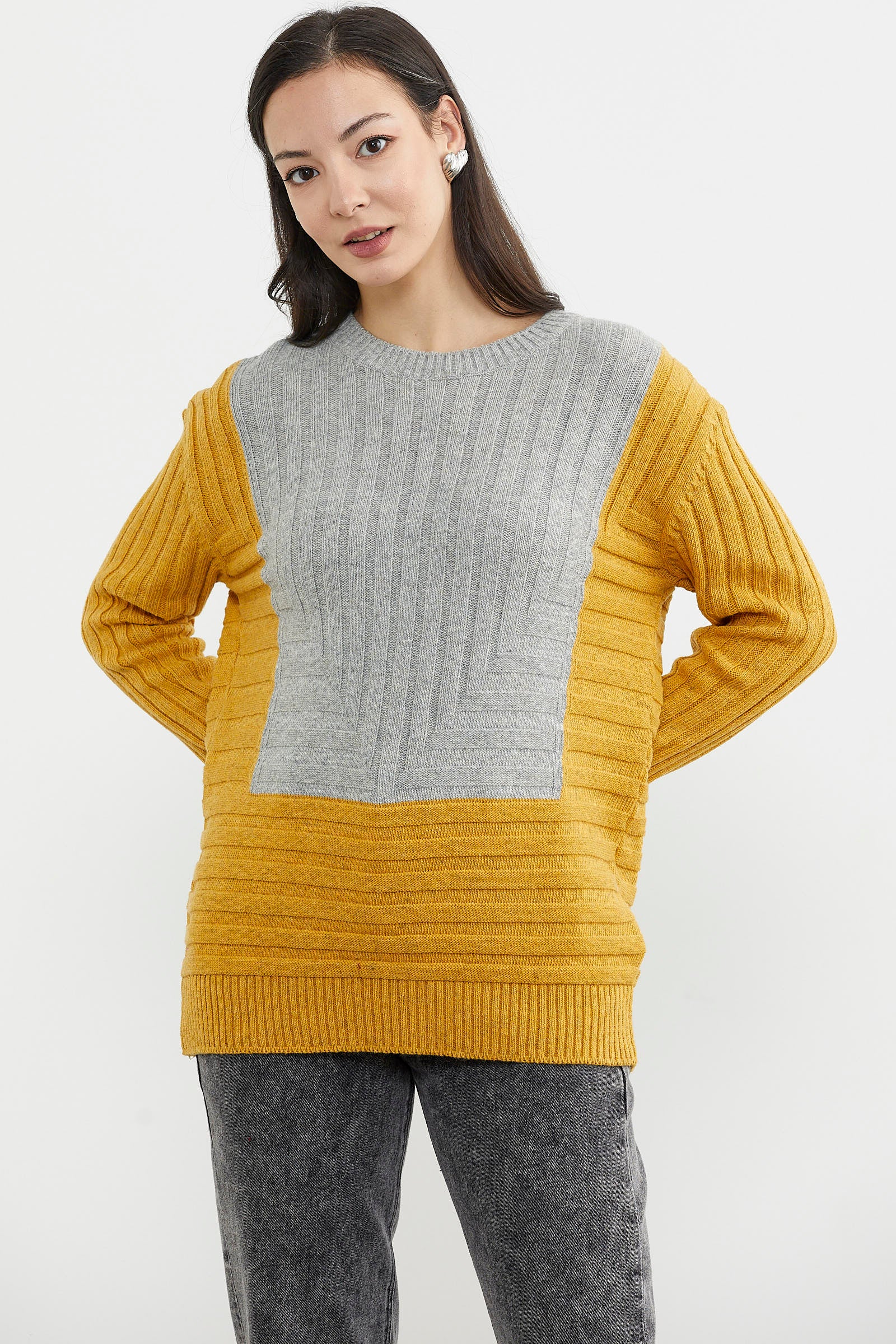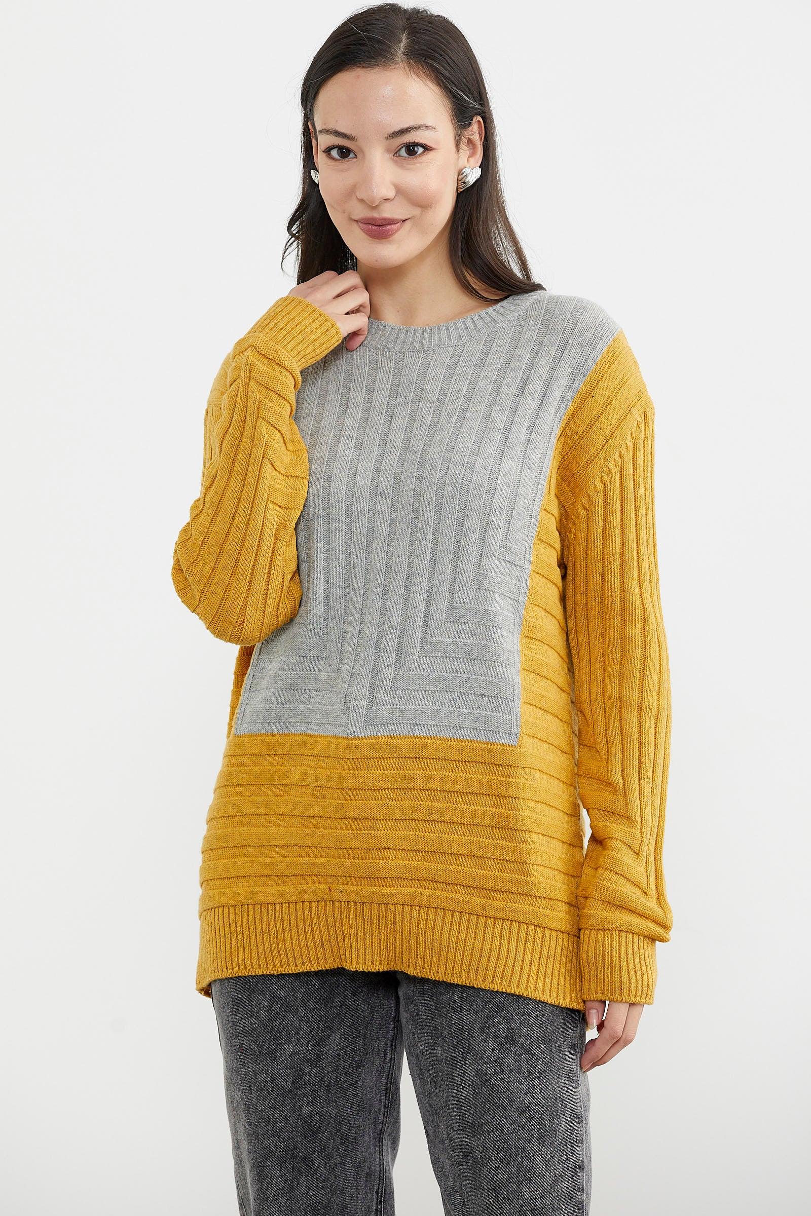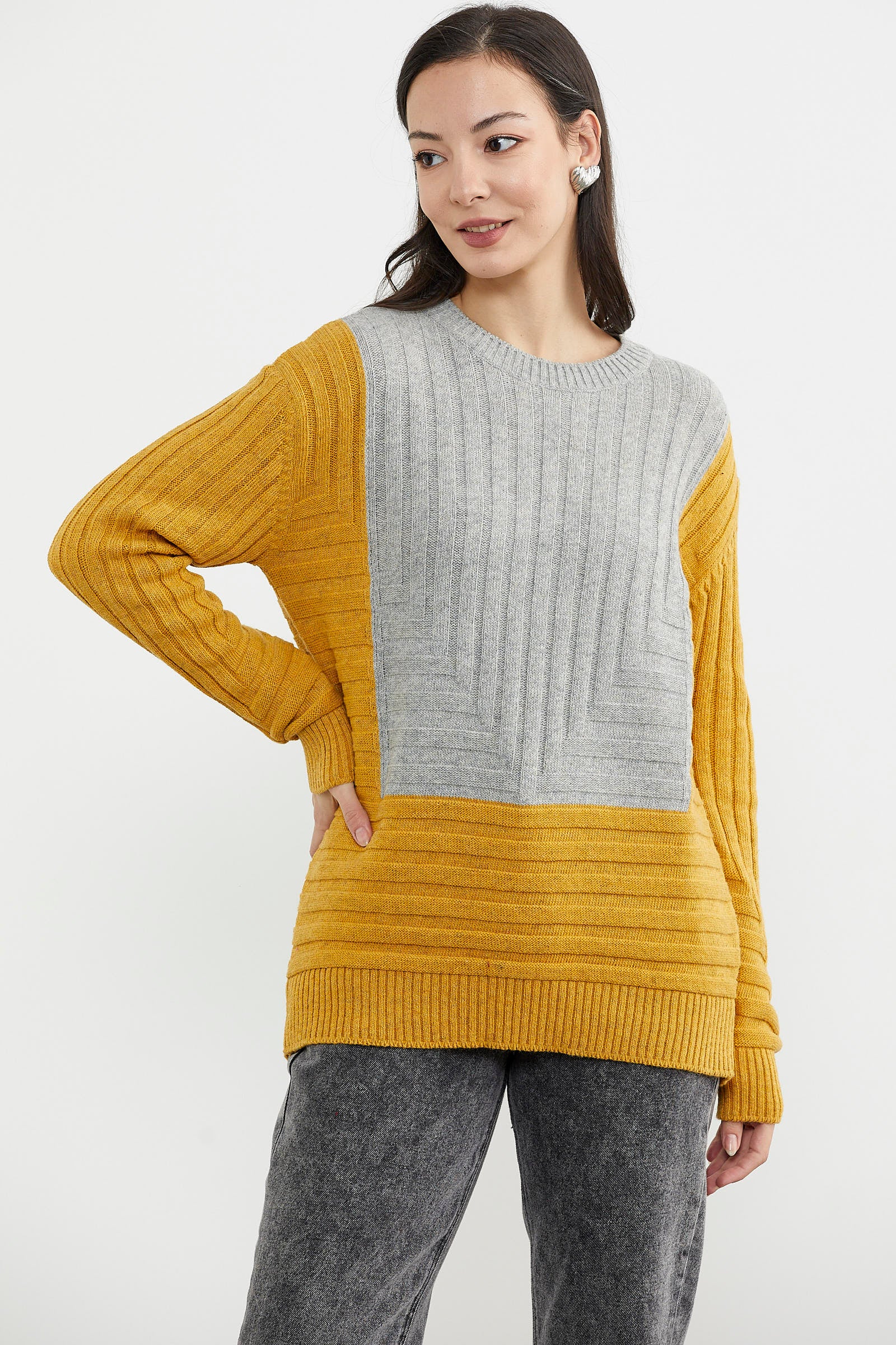 Çift Renk Kalın Fitilli Triko Kazak - Güneş - Gri