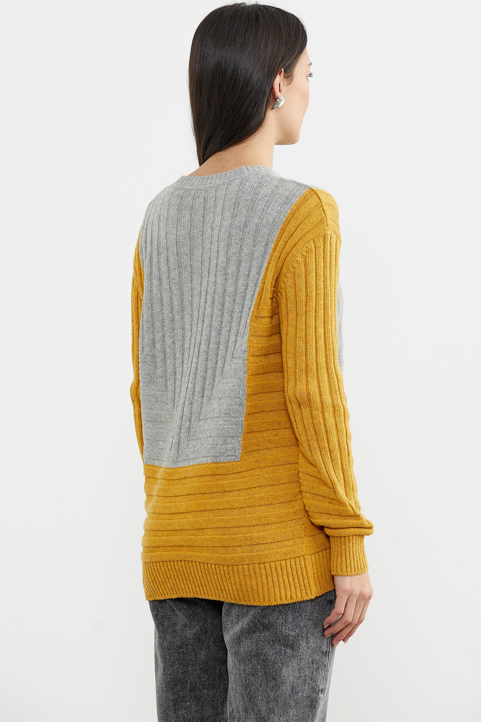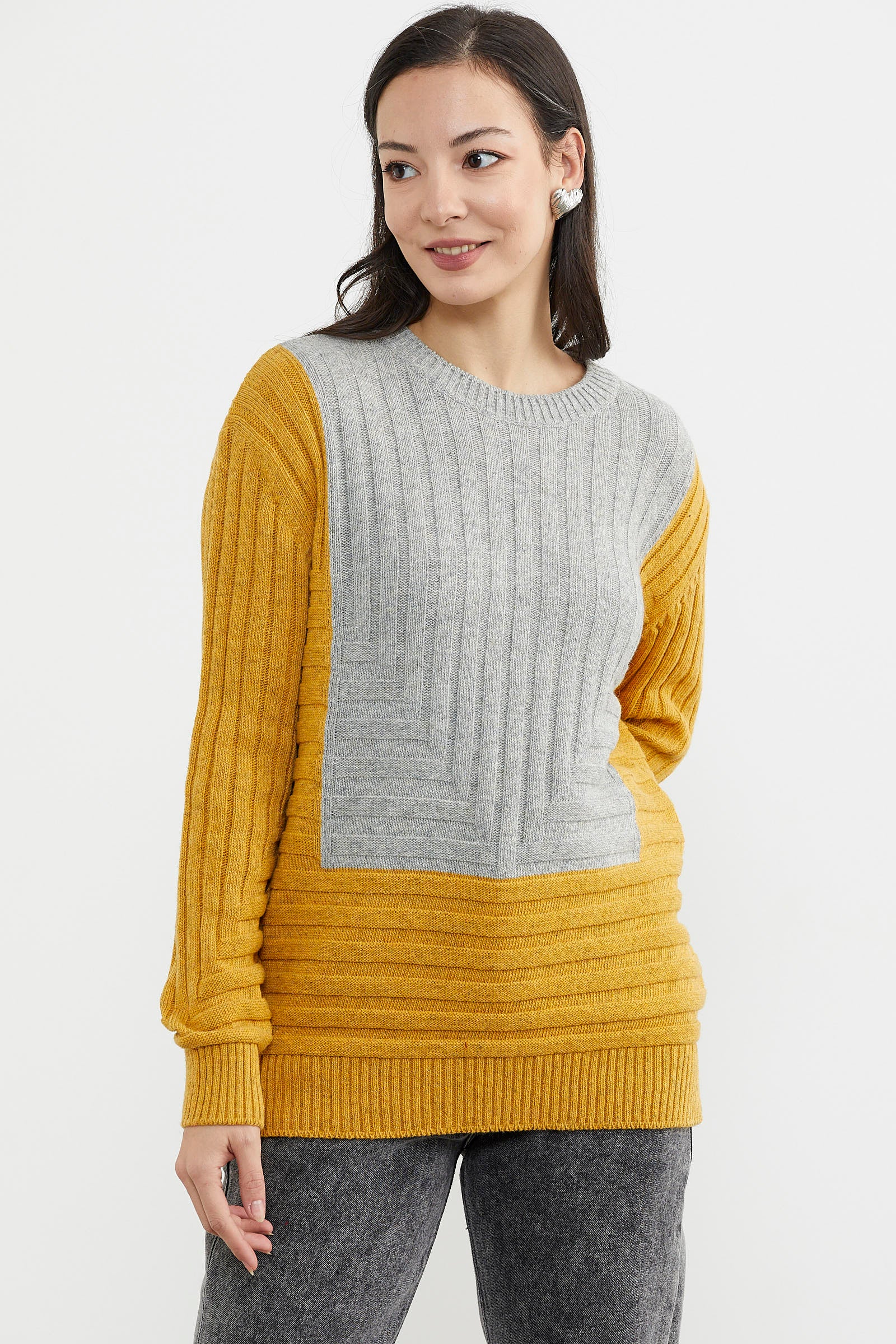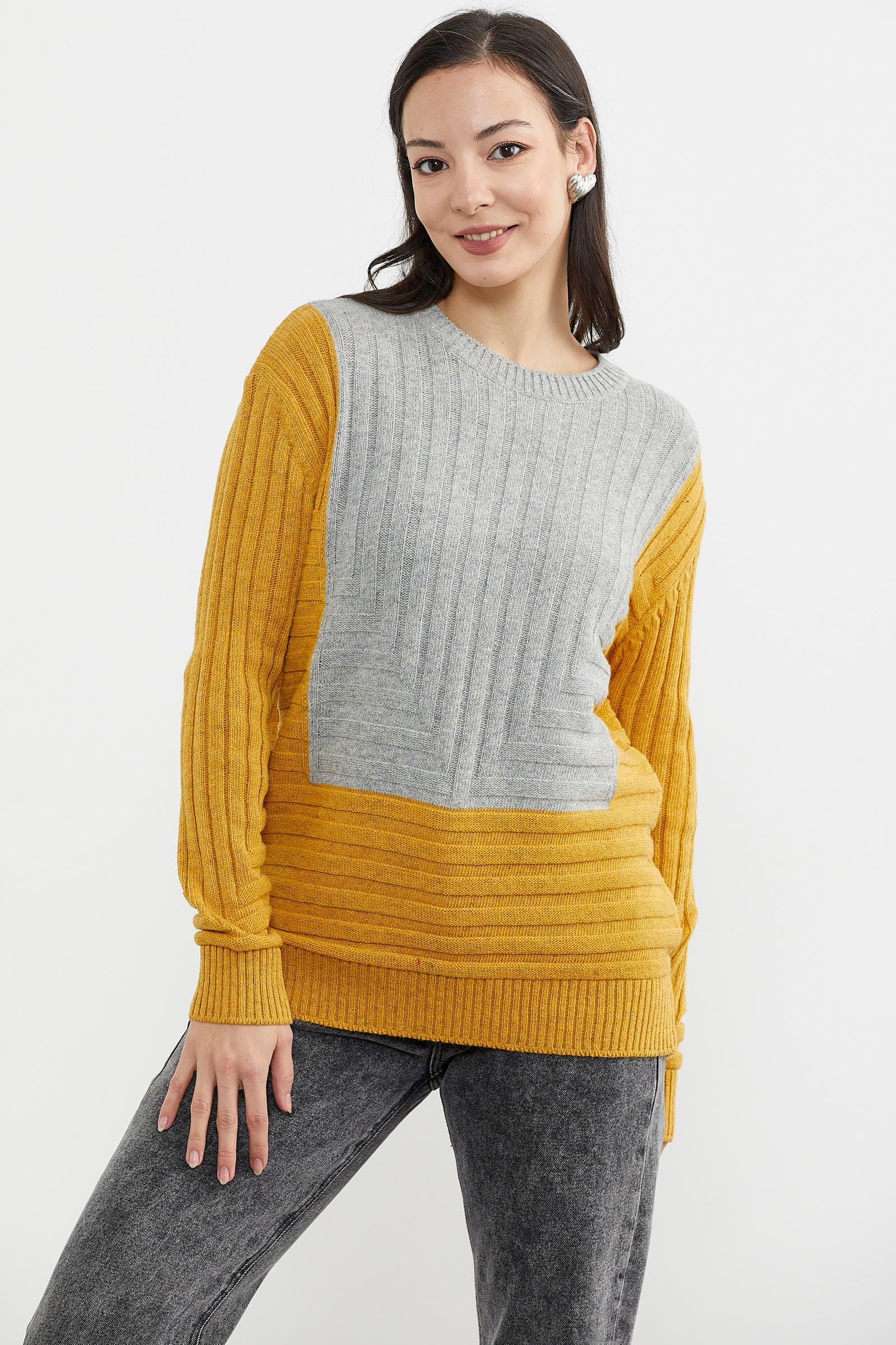 Çift Renk Kalın Fitilli Triko Kazak - Güneş - Gri