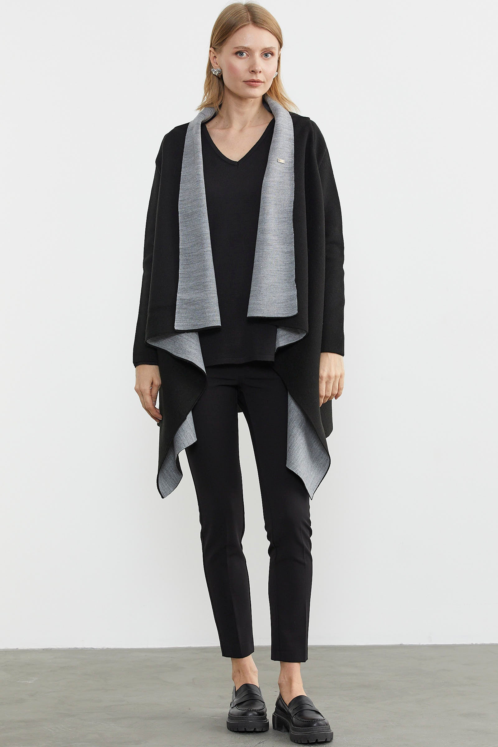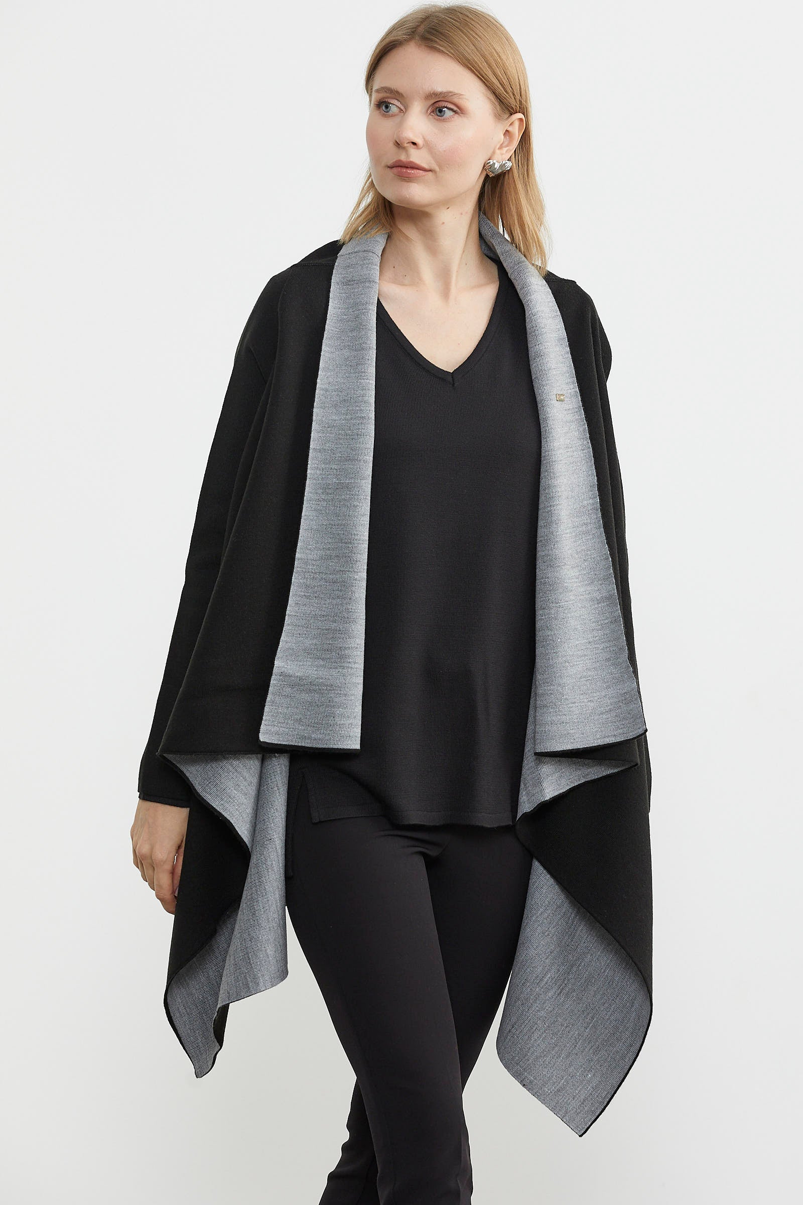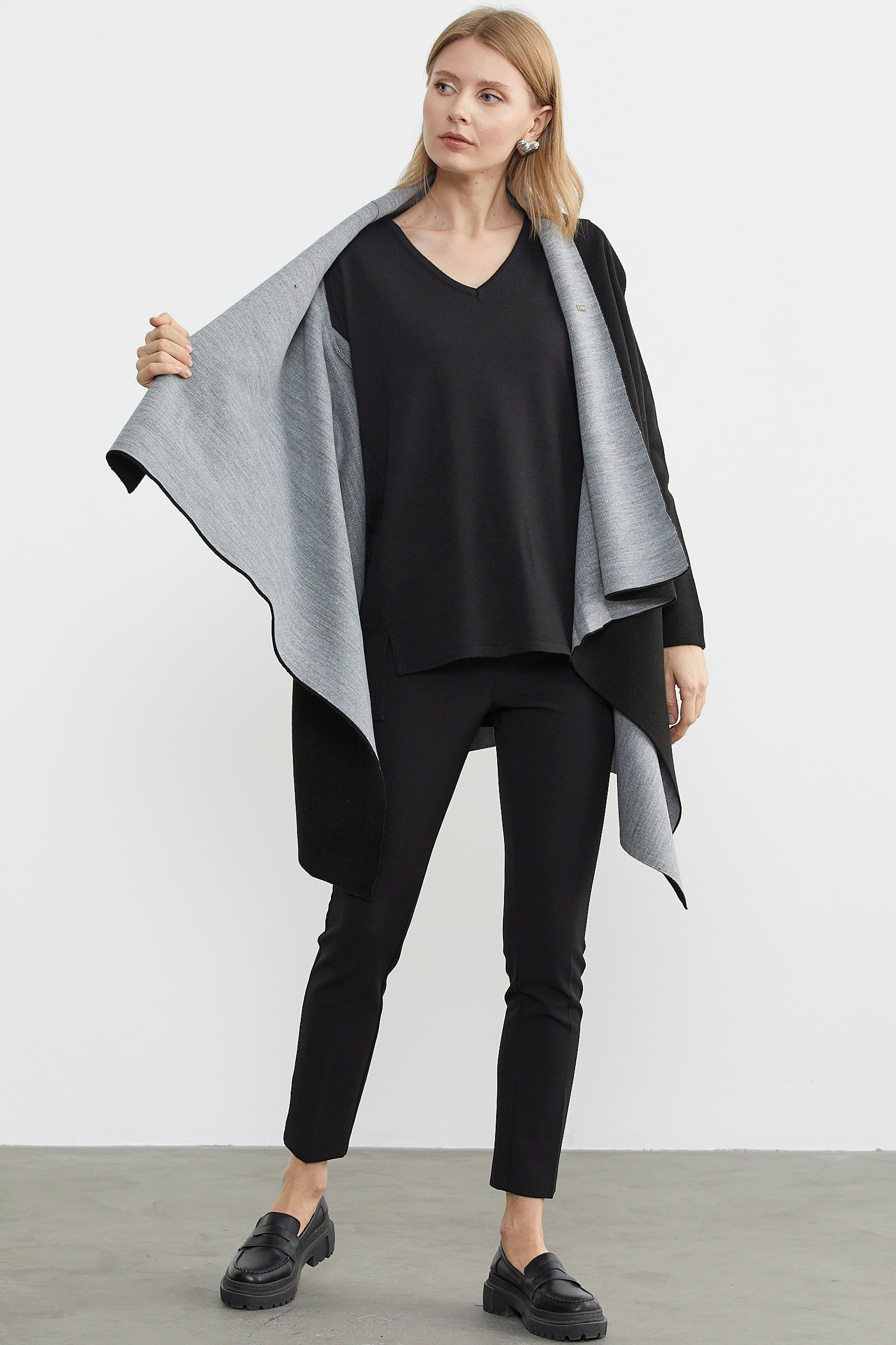Çift Renk Uzun Triko Panço - Siyah - Gri