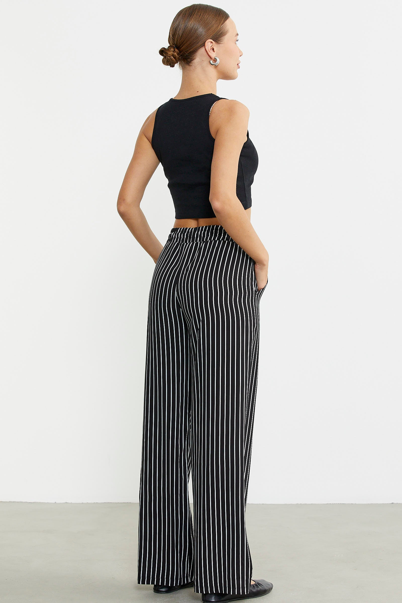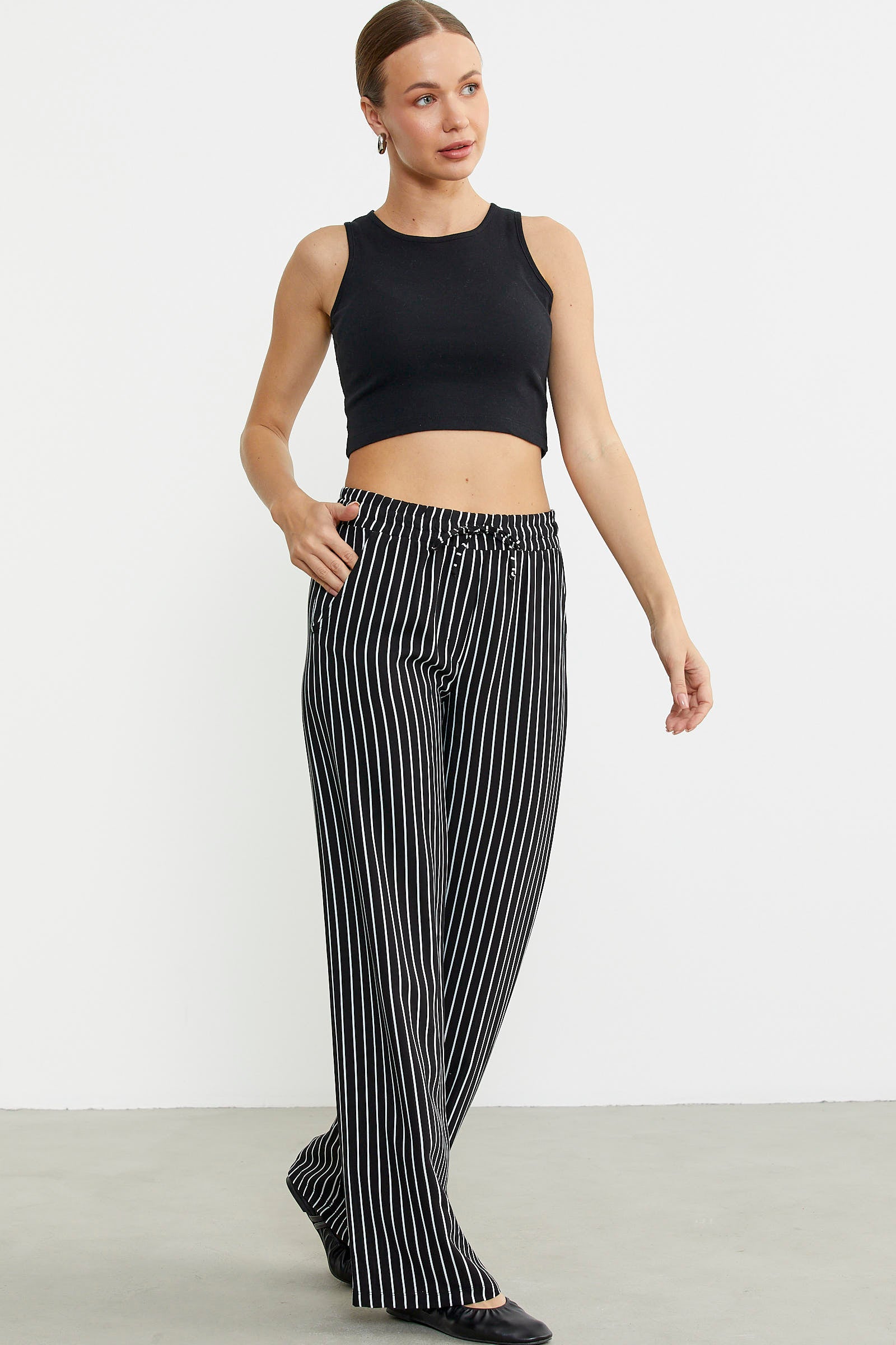 Çizgili Bol Kesim Viskon Pantolon - Siyah