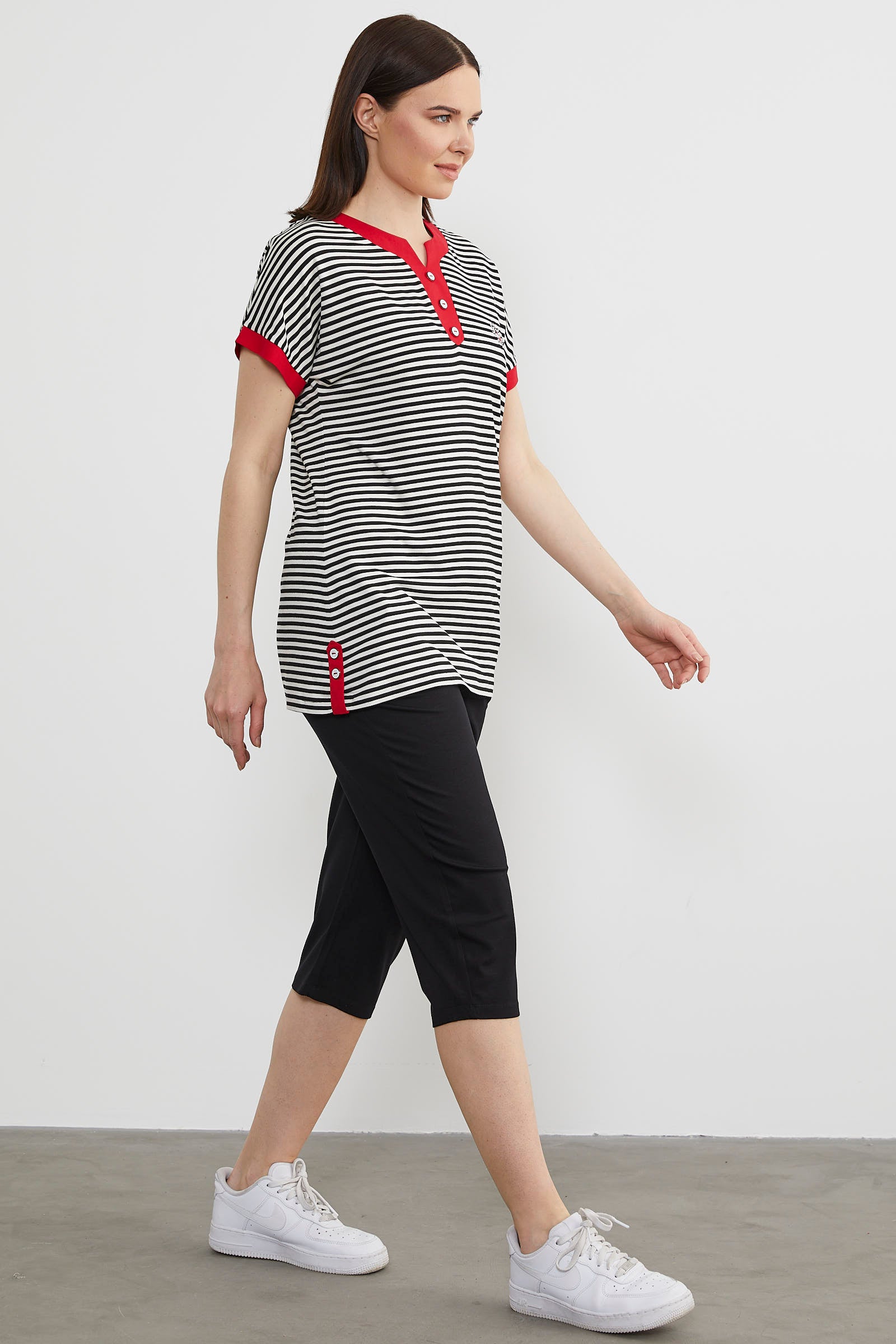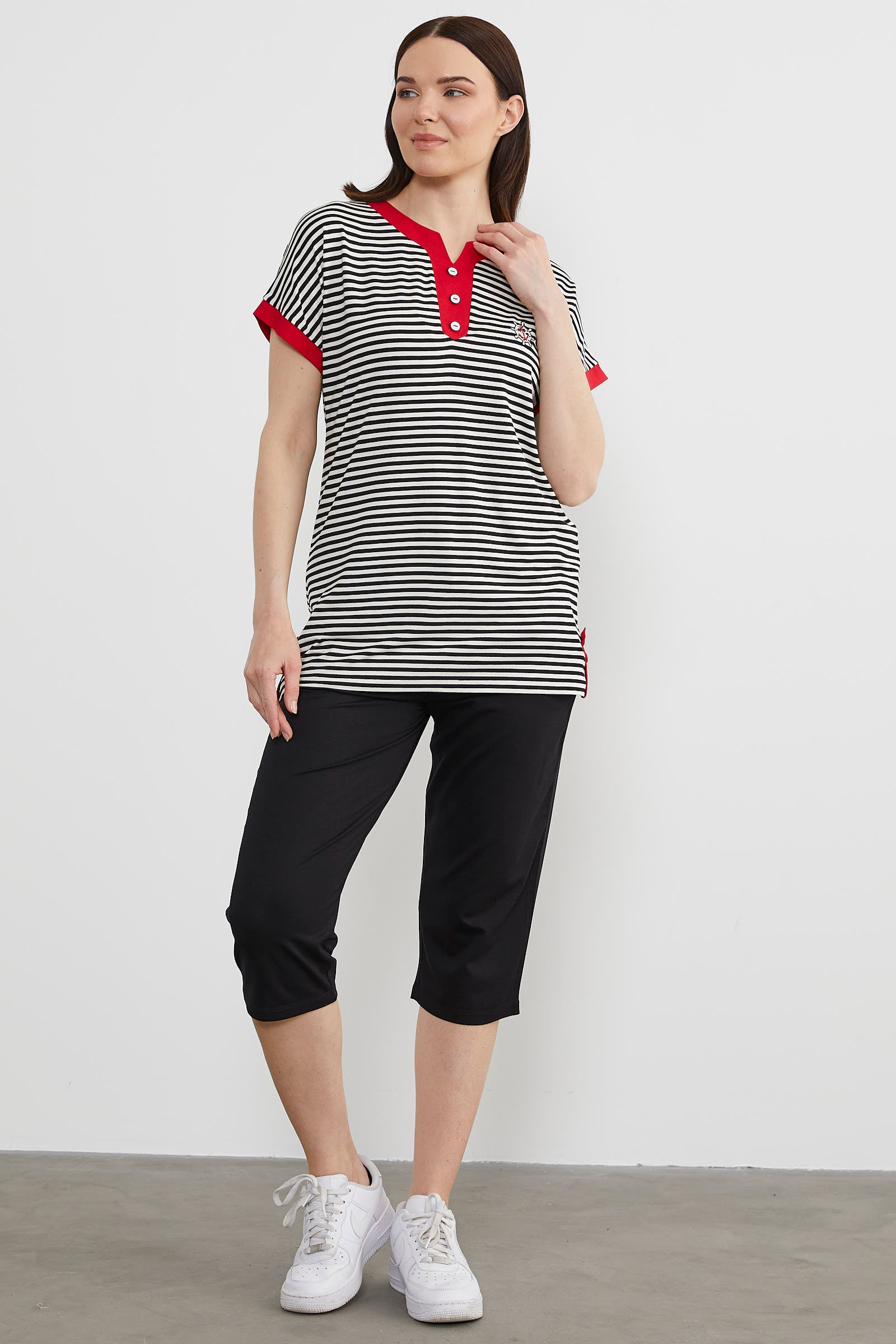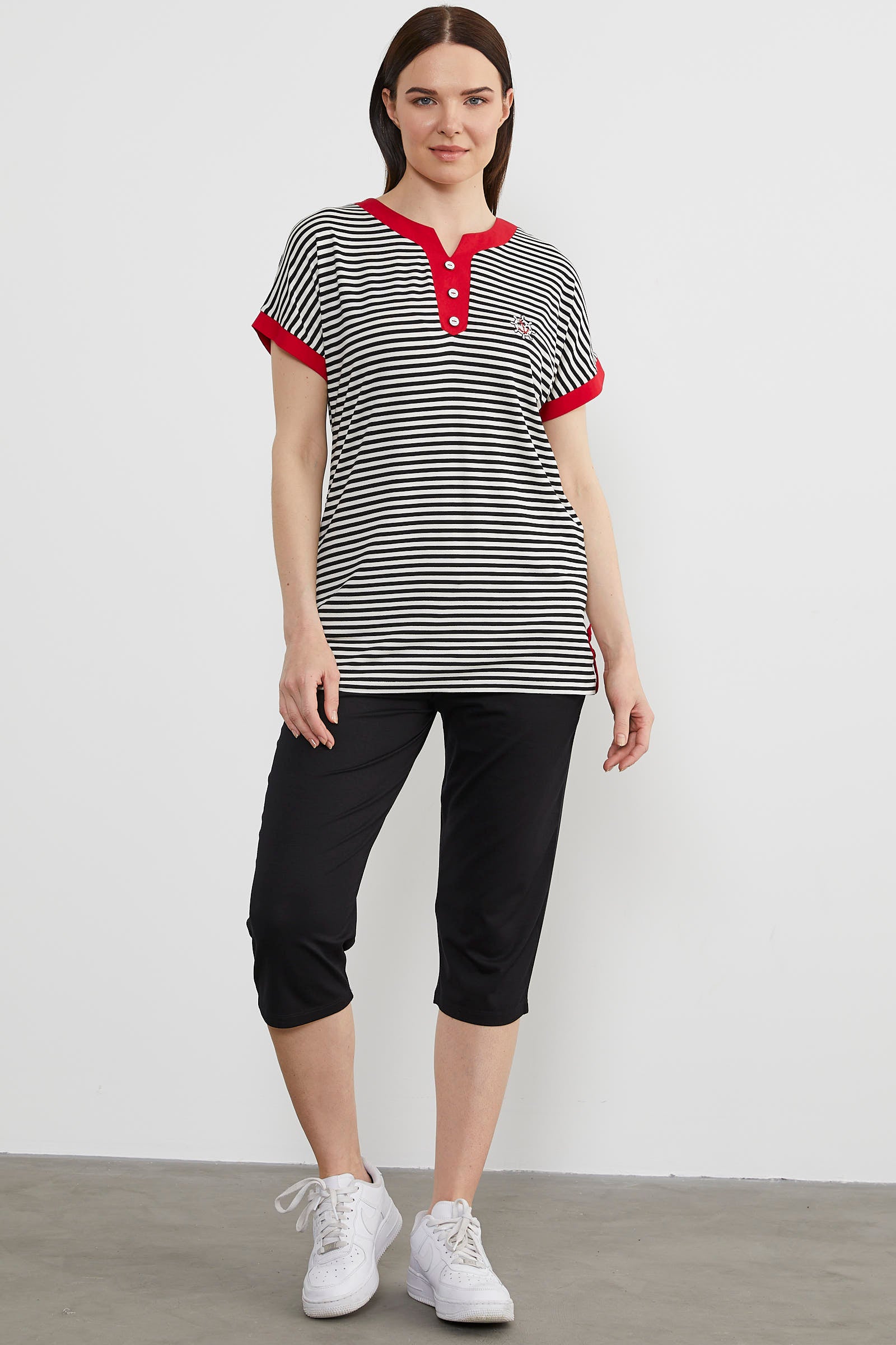 Yakası düğmeli, minimal baskılı, çizgili tişört ve beli lastikli, cepli kapri takım ile sportif ve rahat bir şıklık yakalayabilirsiniz.
