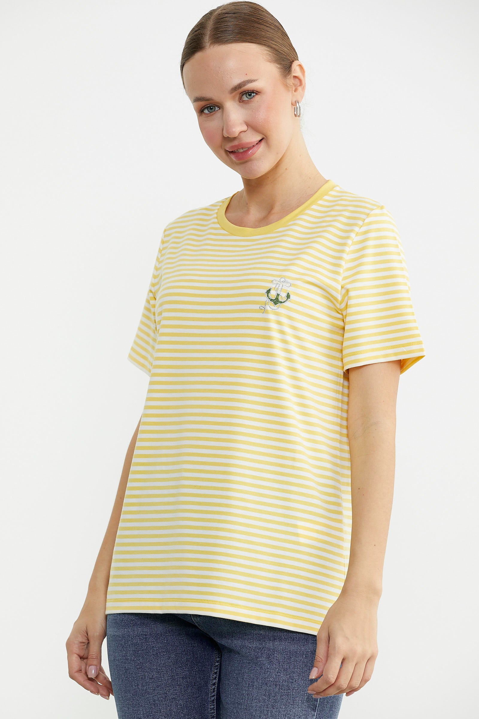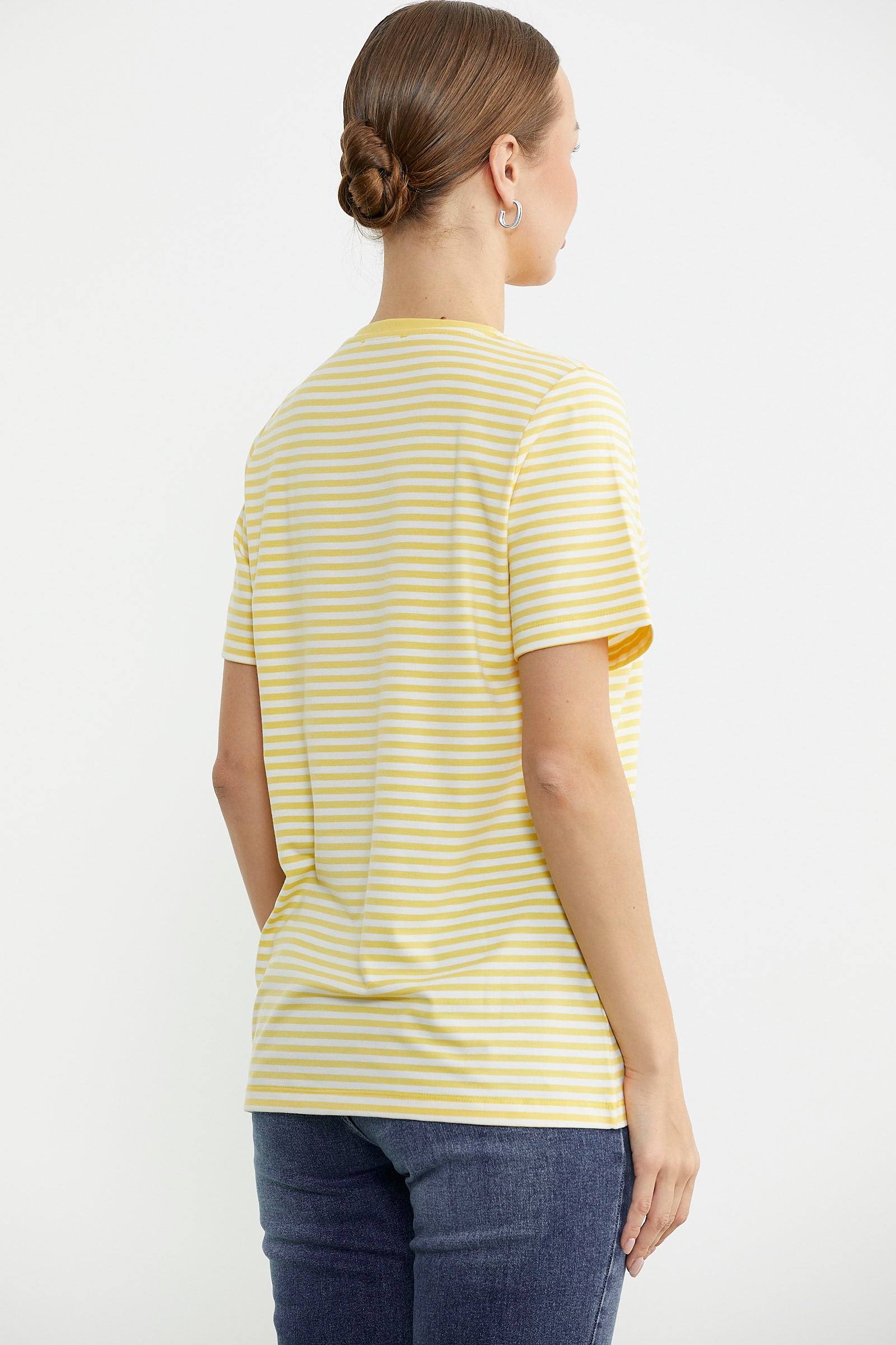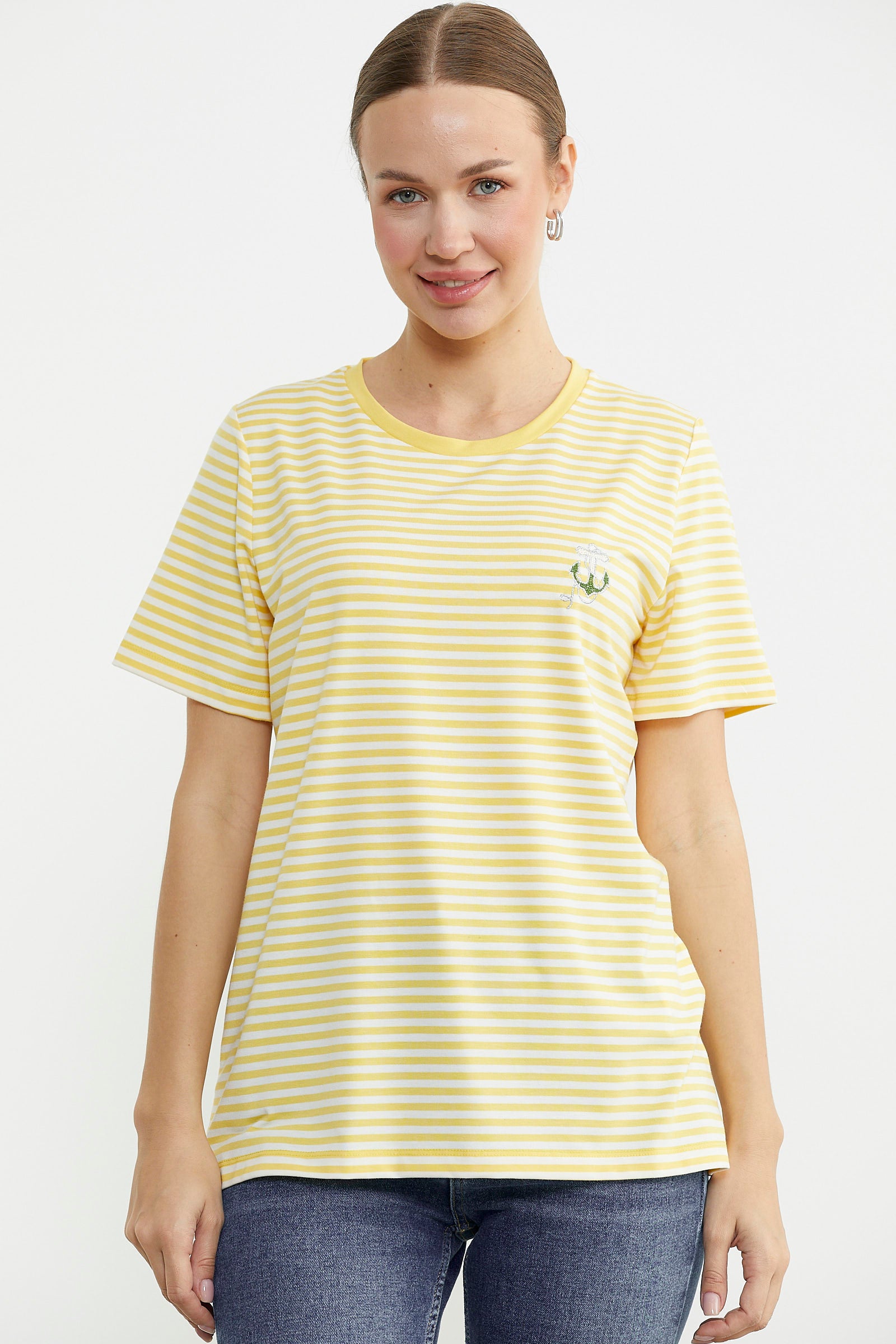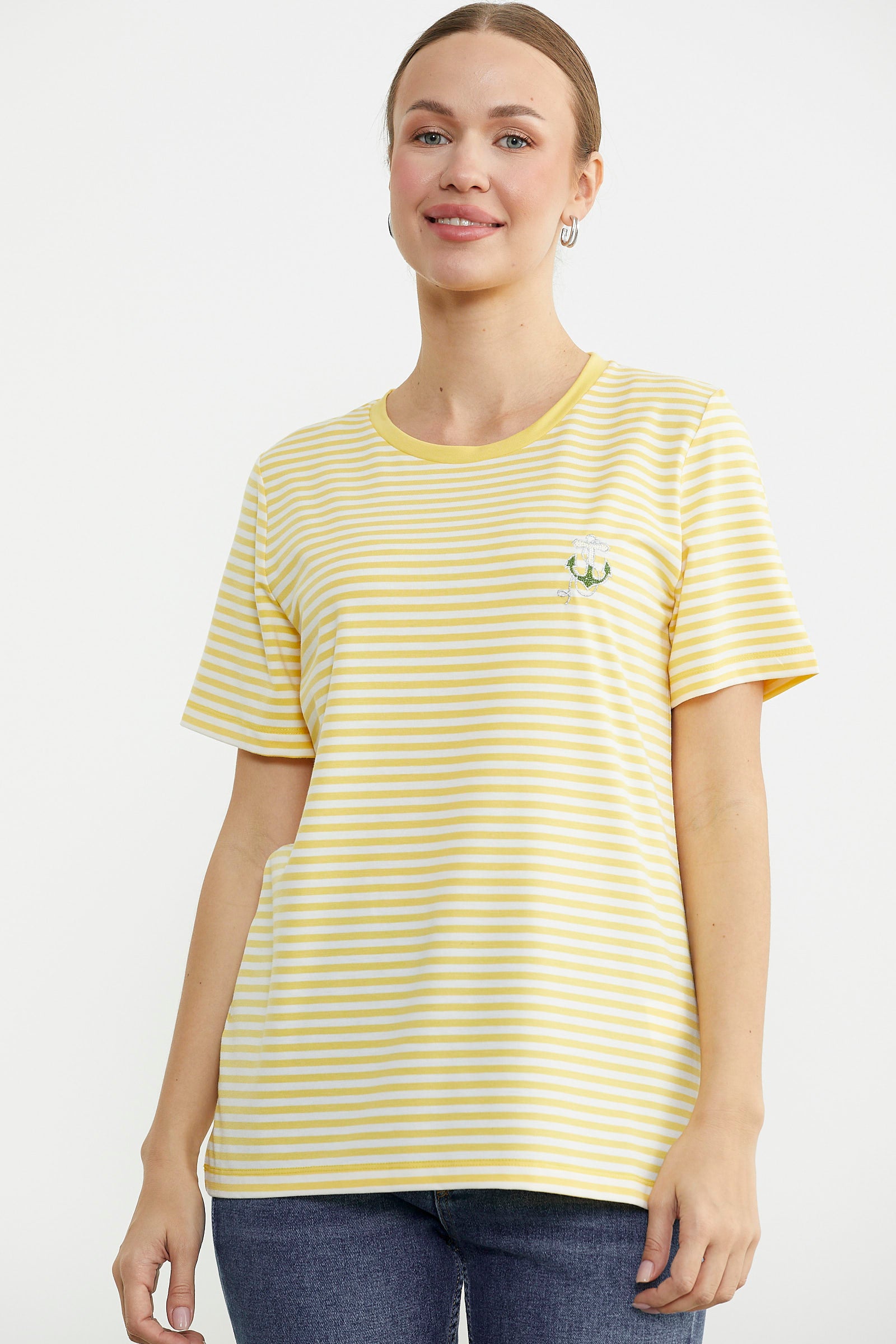 Çizgili Nakış Detaylı Penye Tişört - Sarı