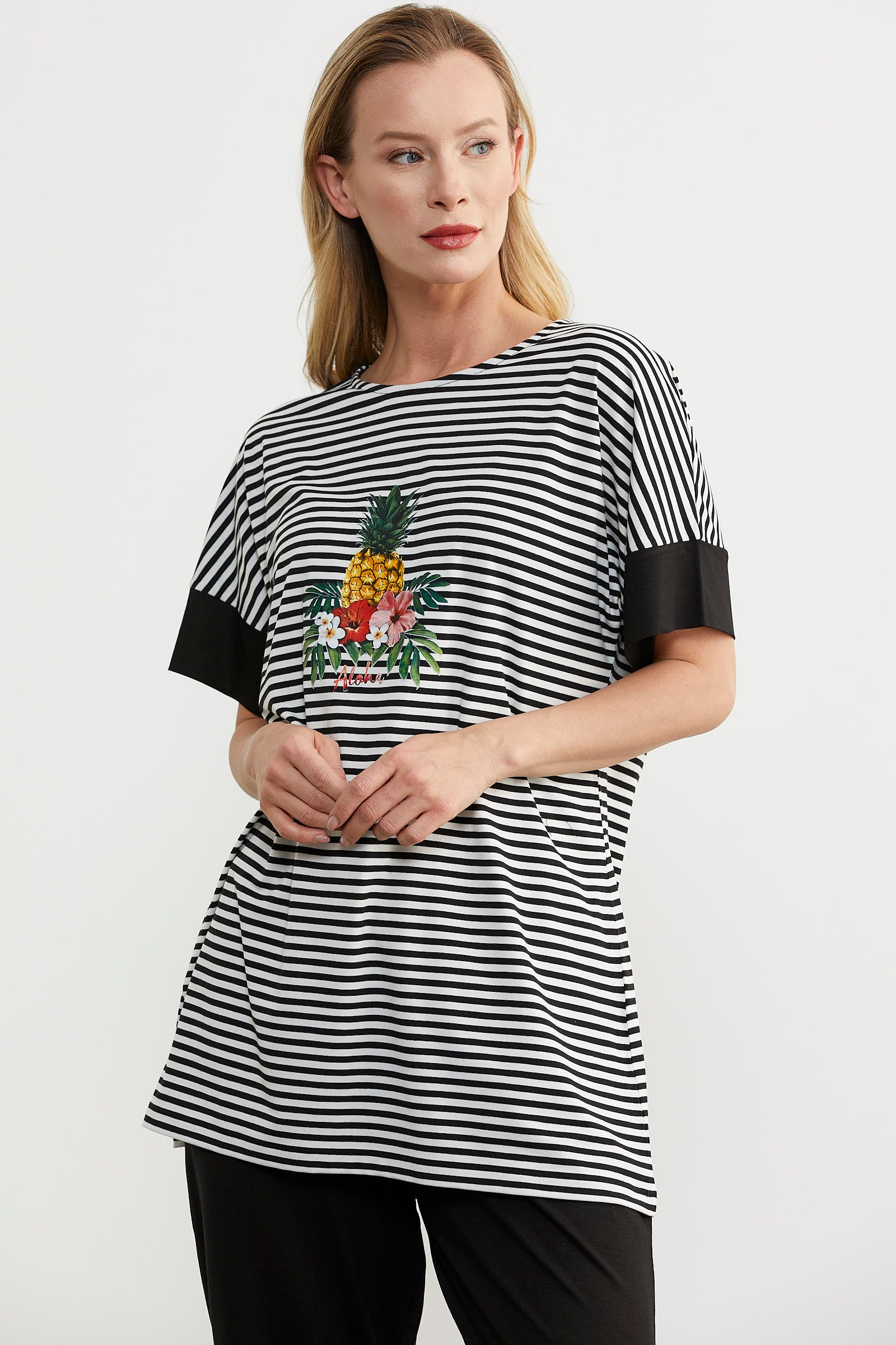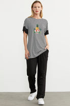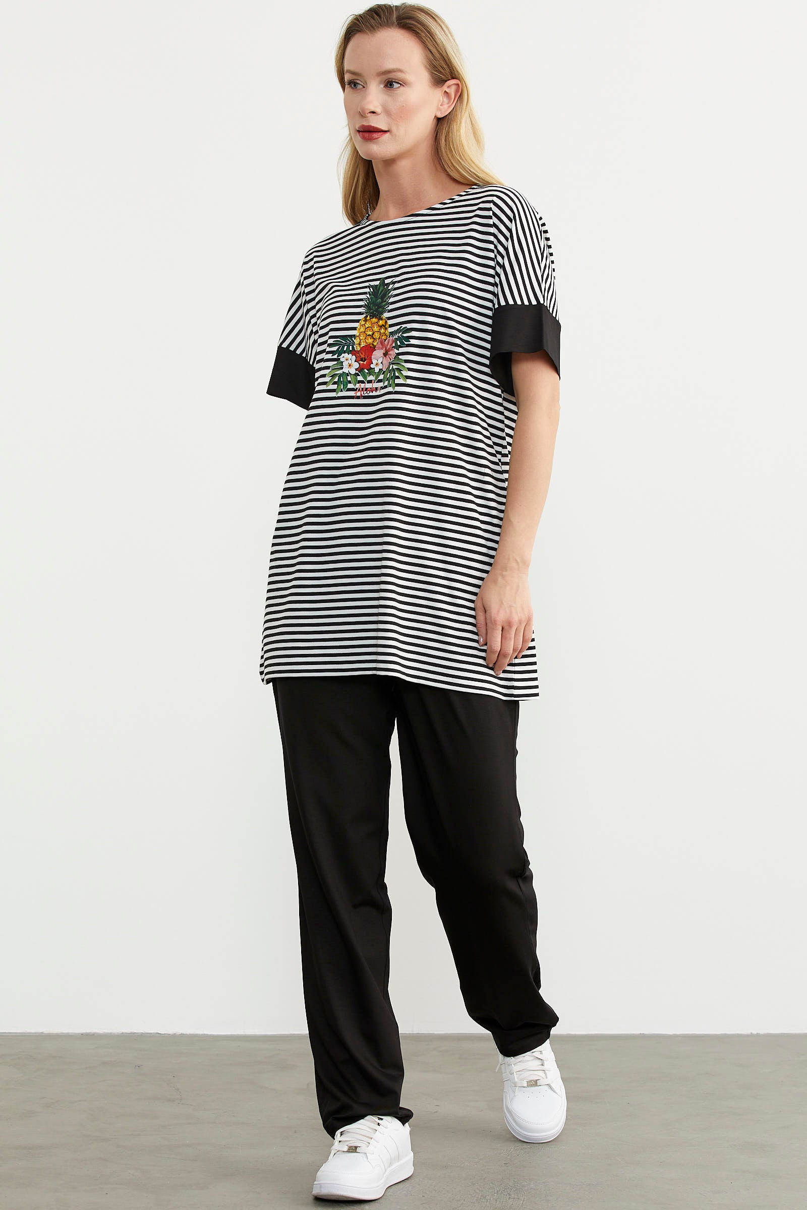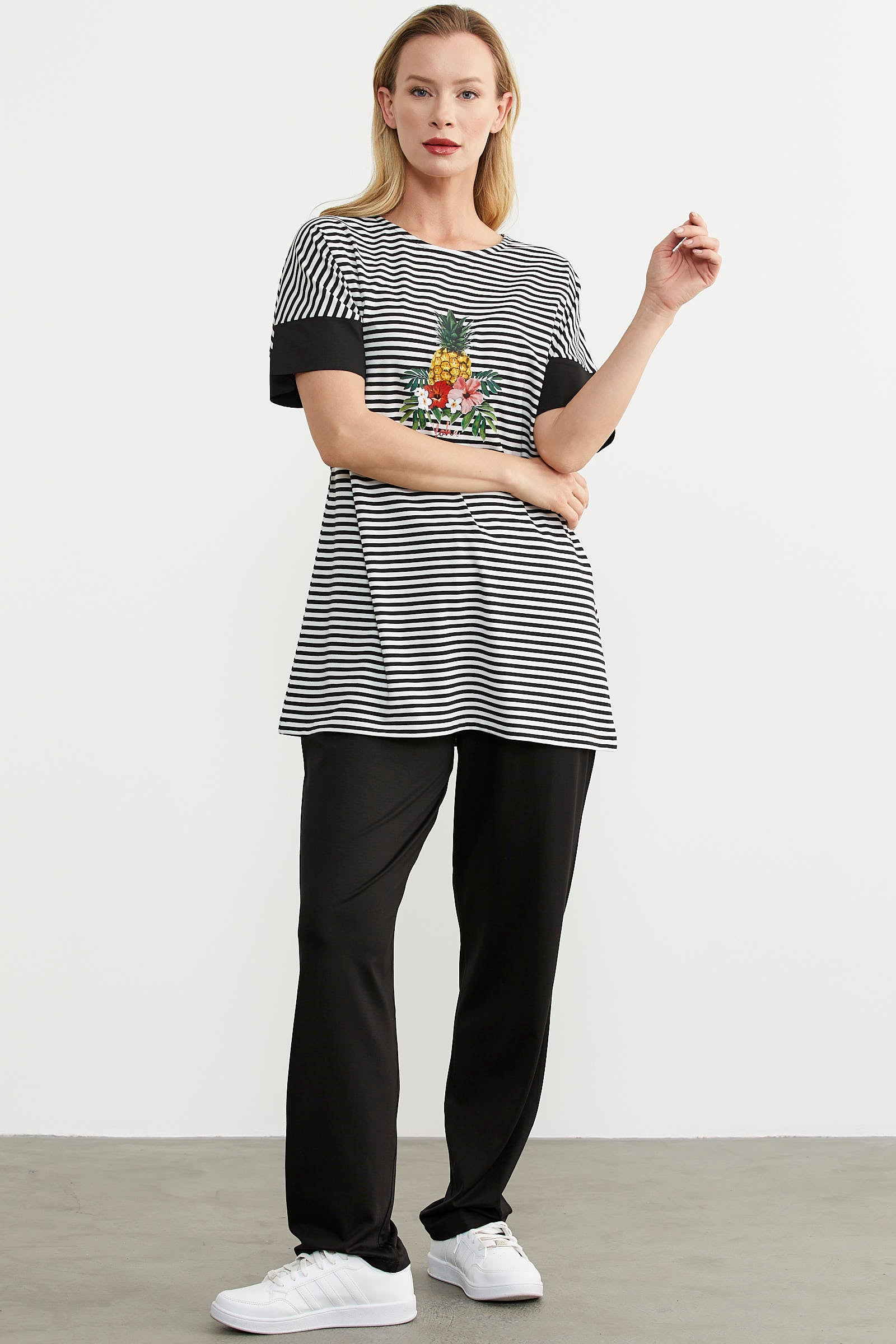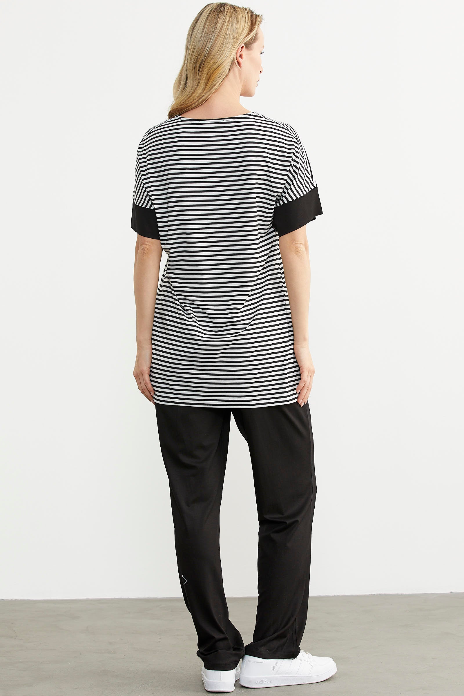 Çizgili Rahat Kalıp Tunik Penye Takım - Siyah