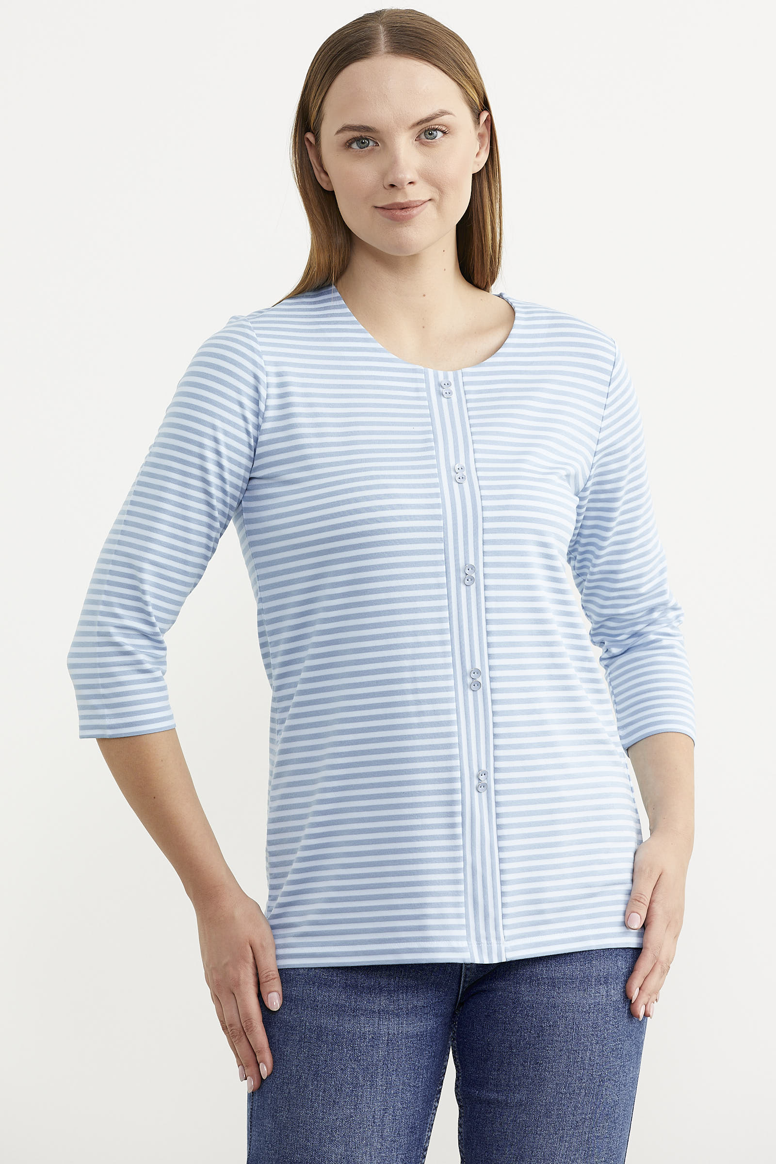 Sıfır yaka düğme detaylı uzun kol modelimiz çizgili kumaşla yeniden yorumlandı. Rahat kalıp olarak üretilmiştir.