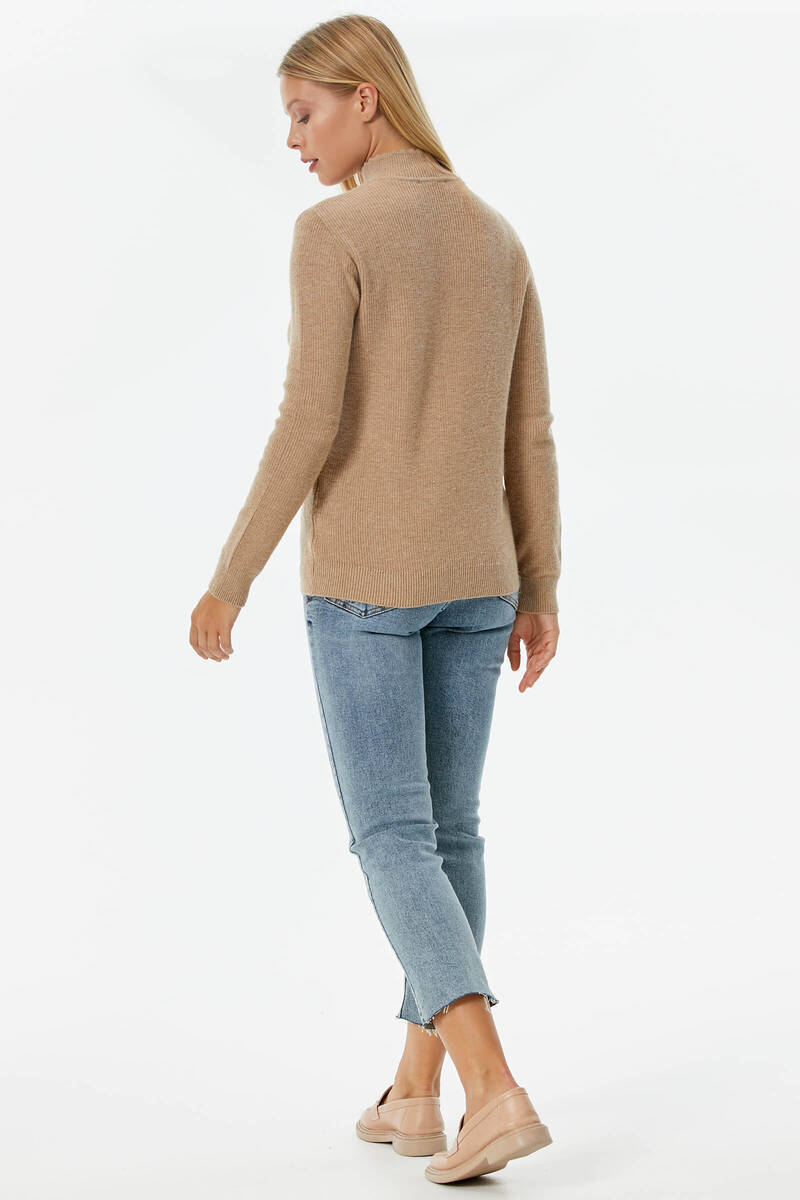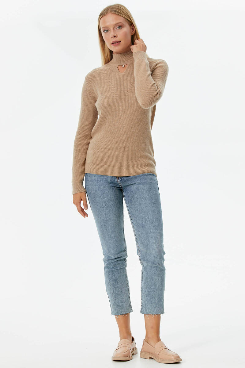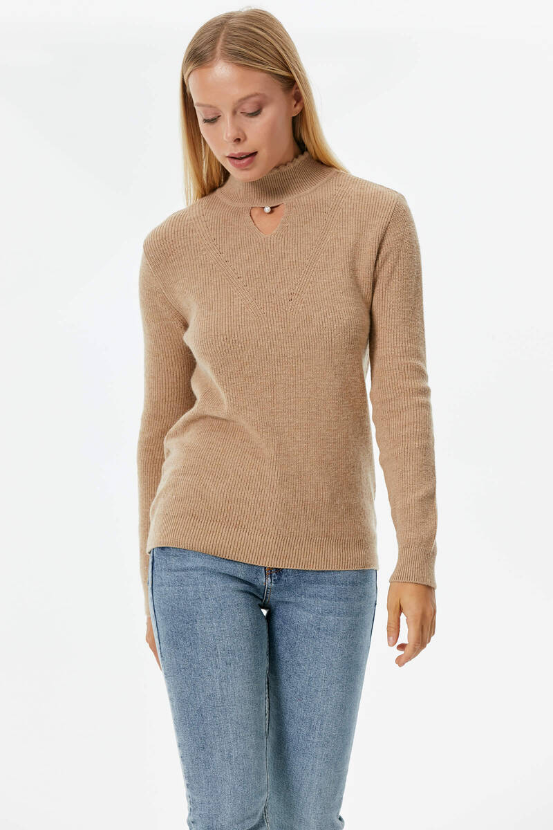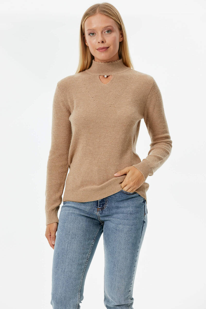Damla Yaka İnci Detaylı Triko Kazak - Kamel