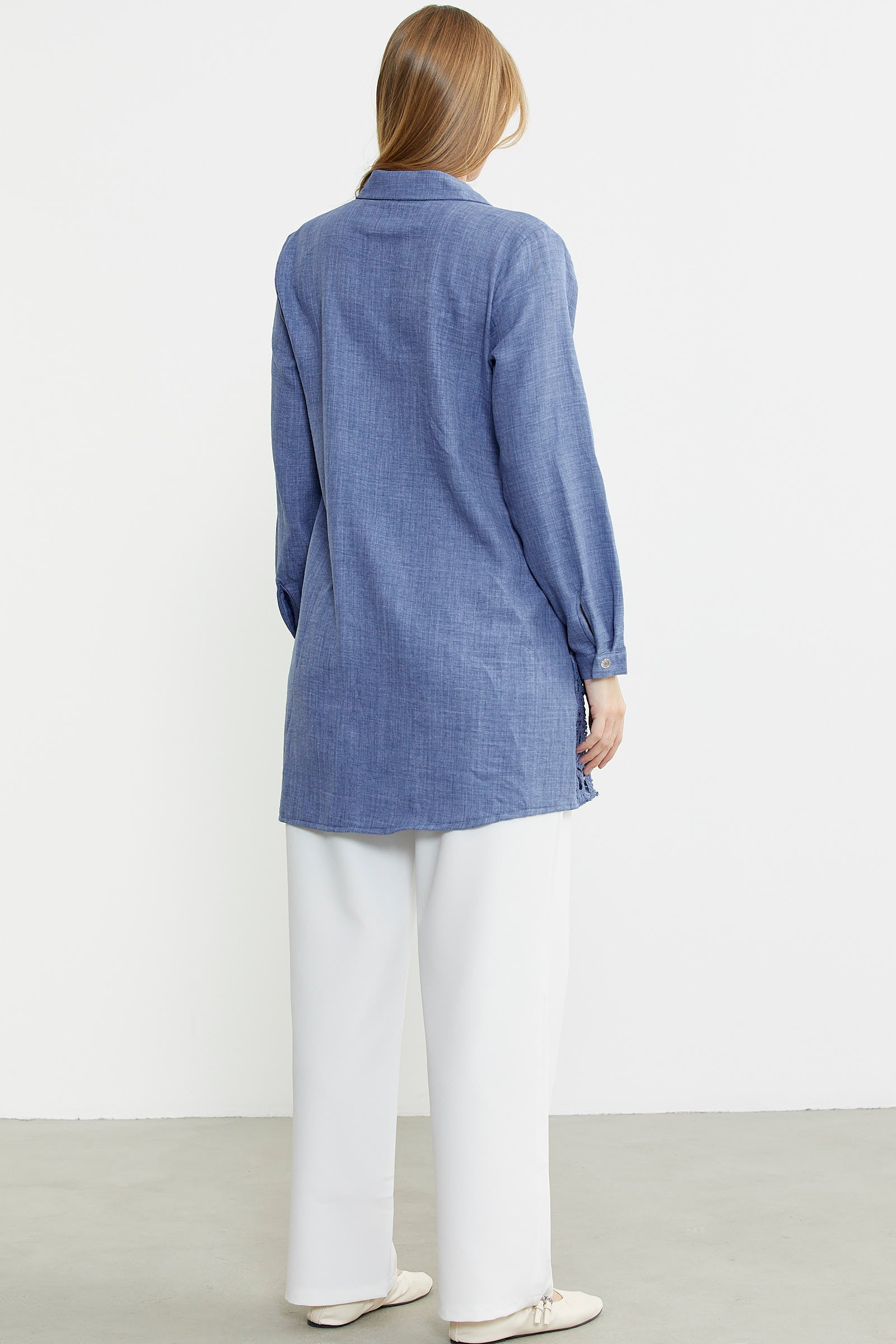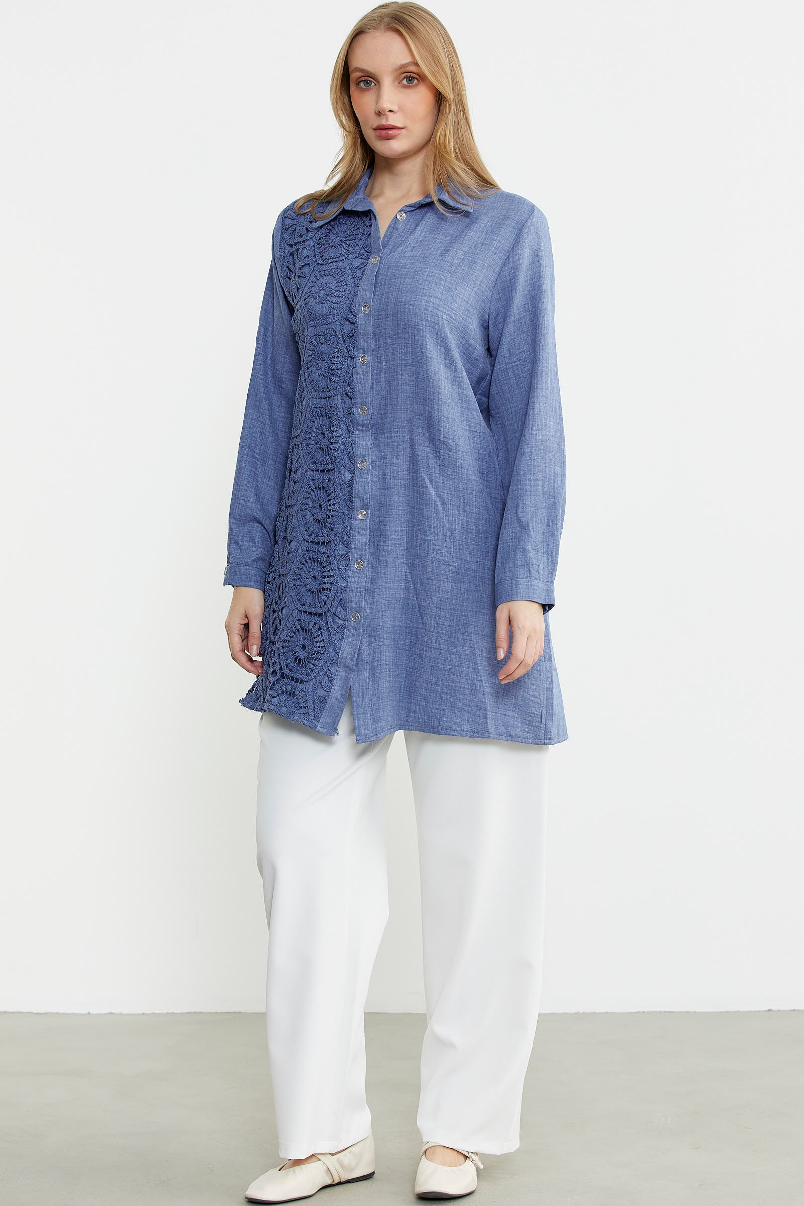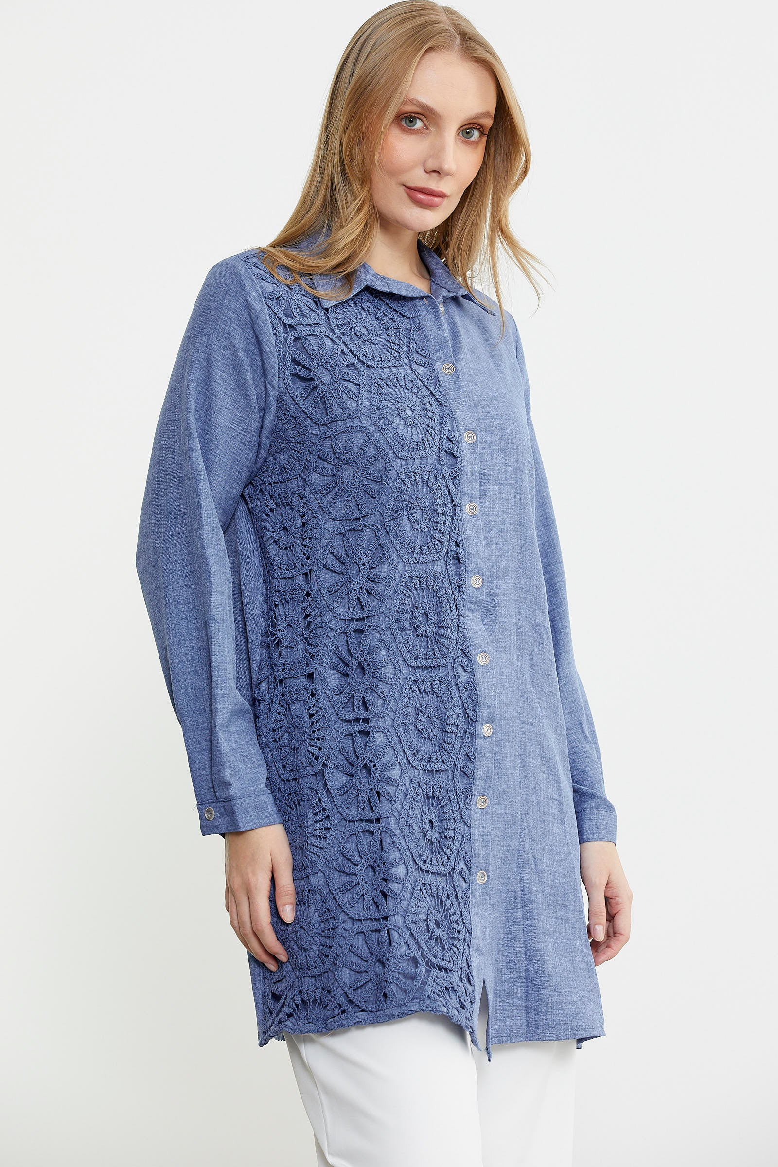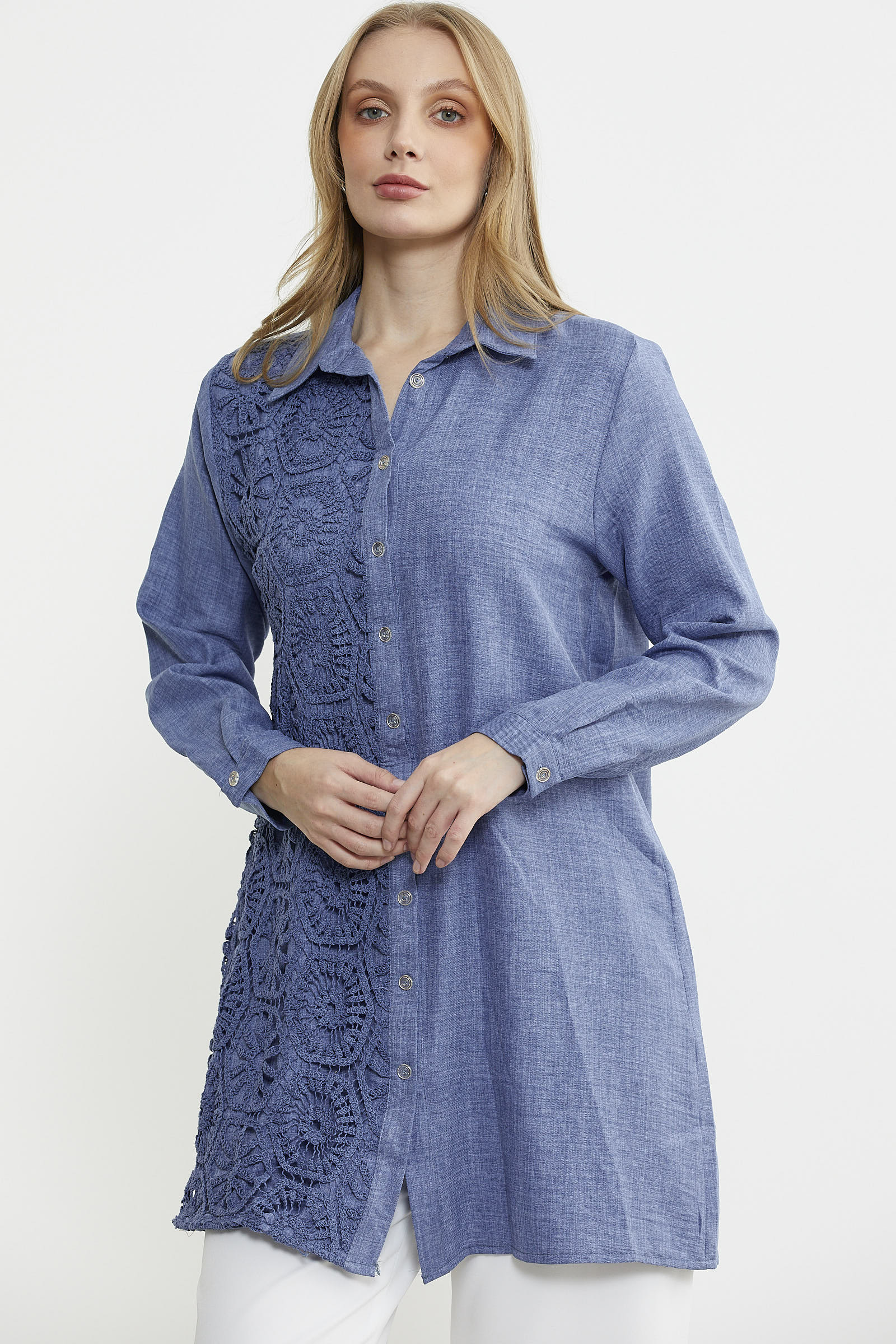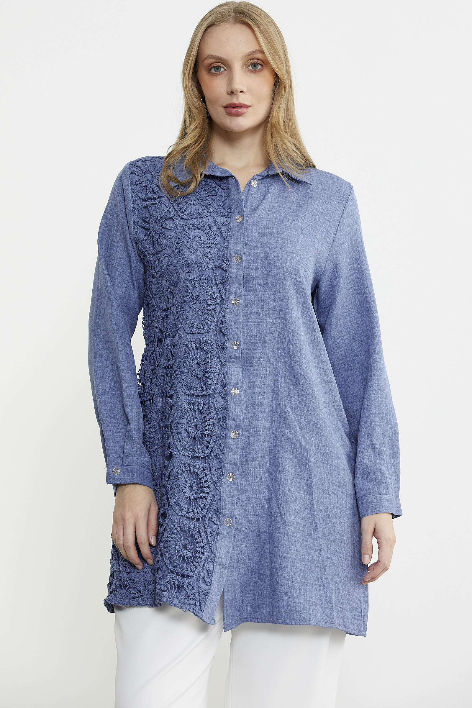 Ön tek parçası üzerine kullanılan renge renk dantel detayı ile hareketlendirilen gömlek, tunik boy ve rahat kalıp olarak üretilmiştir.