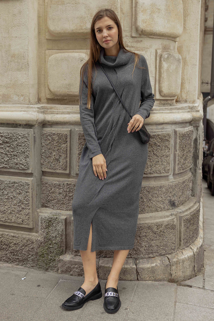 Degaje Yaka Önü Saç Örgülü Triko Elbise - Koyu Gri