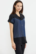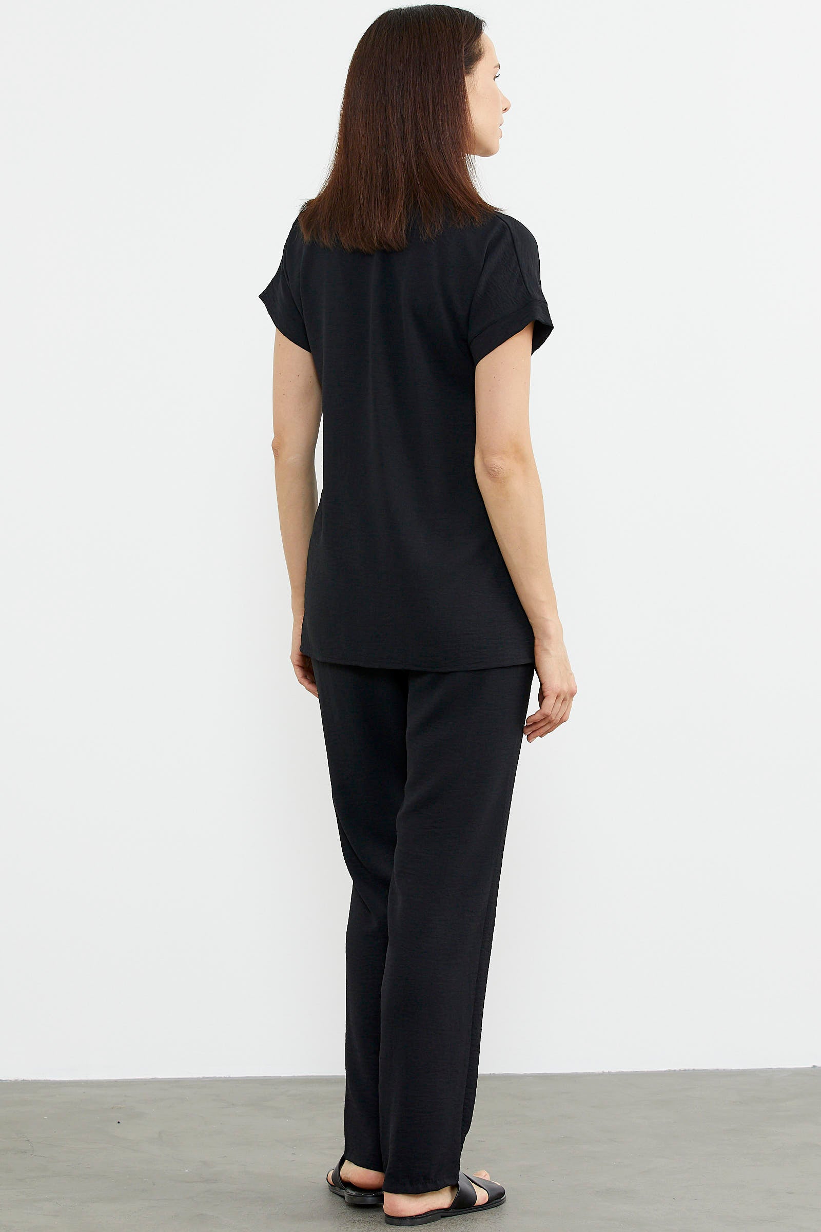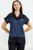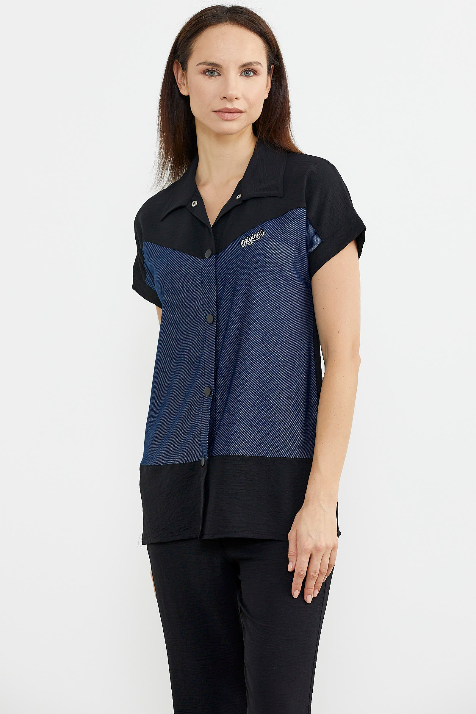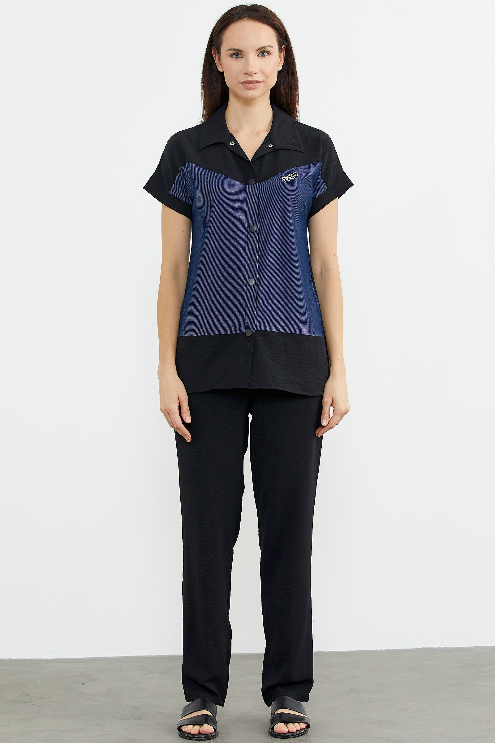 Yakalı, düşük kısa kol krep takımı kot görünümlü kumaşla hareketlendirdik.Krep dökümlü pantolonla takım yapılmıştır.
