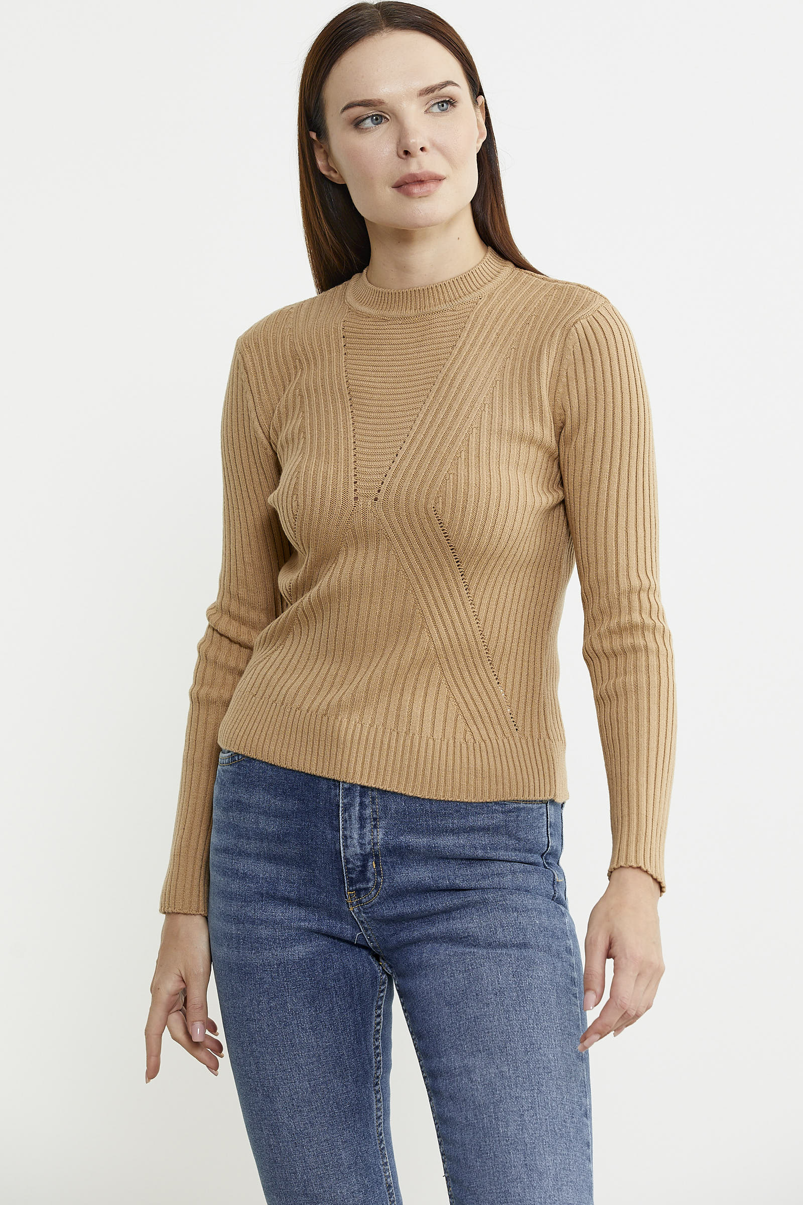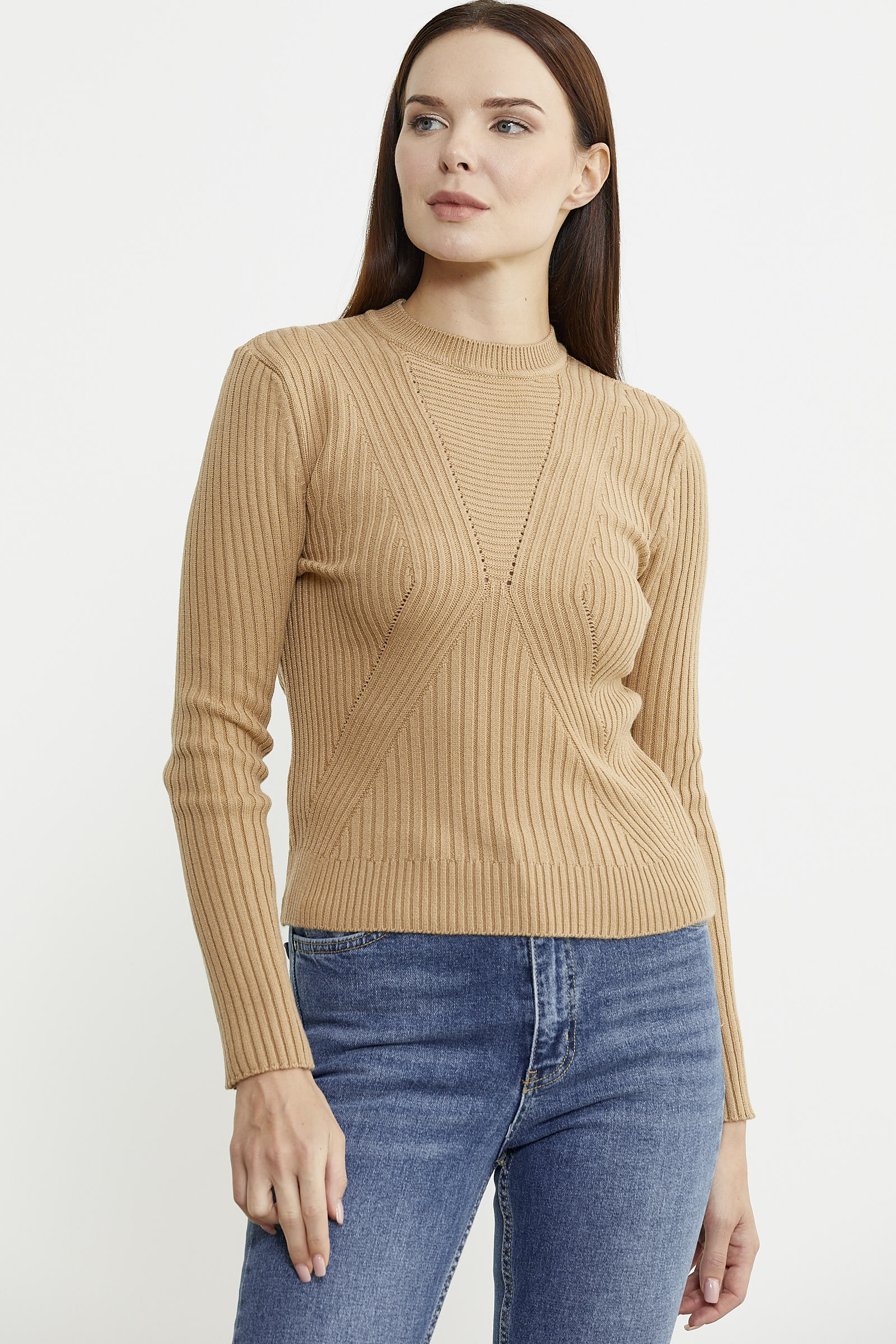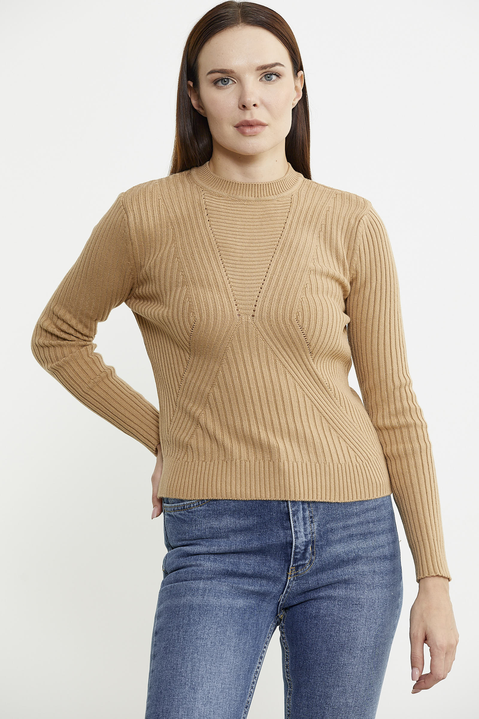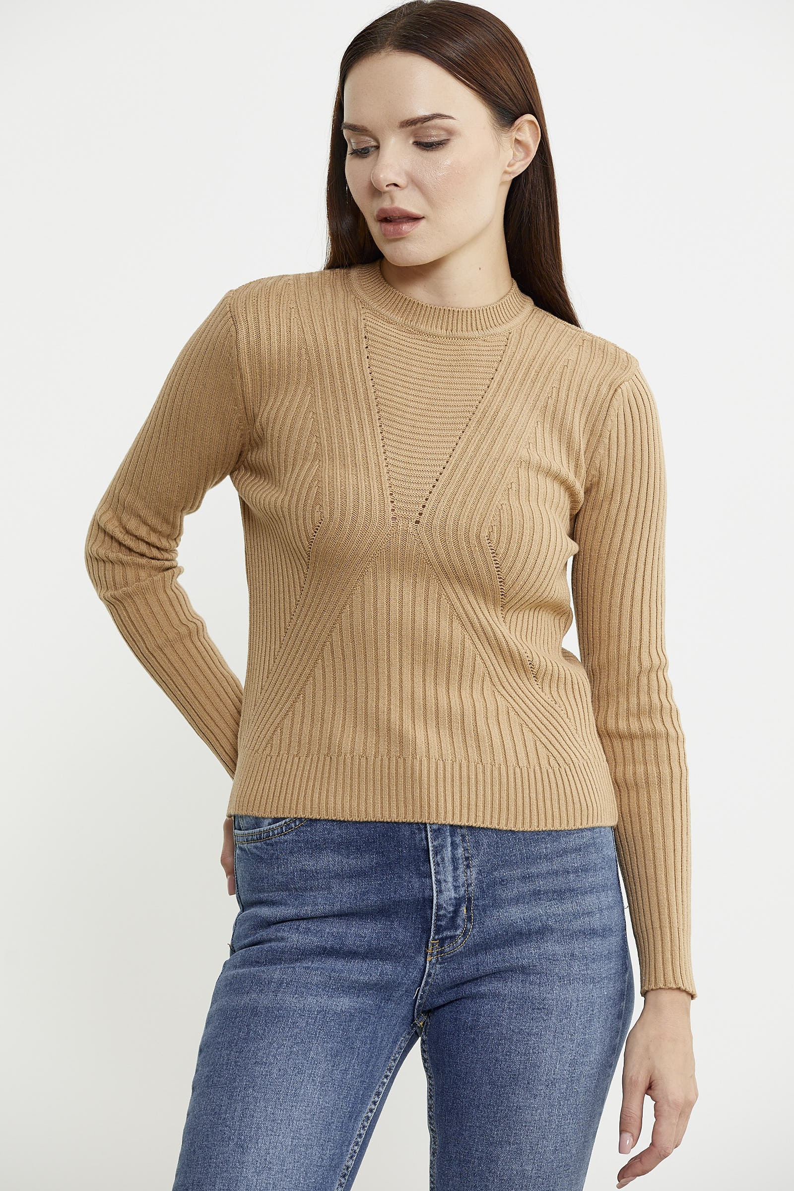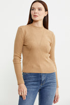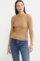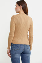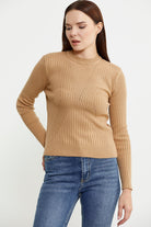 Derbili Sıfır Yaka Triko Kazak - Kamel