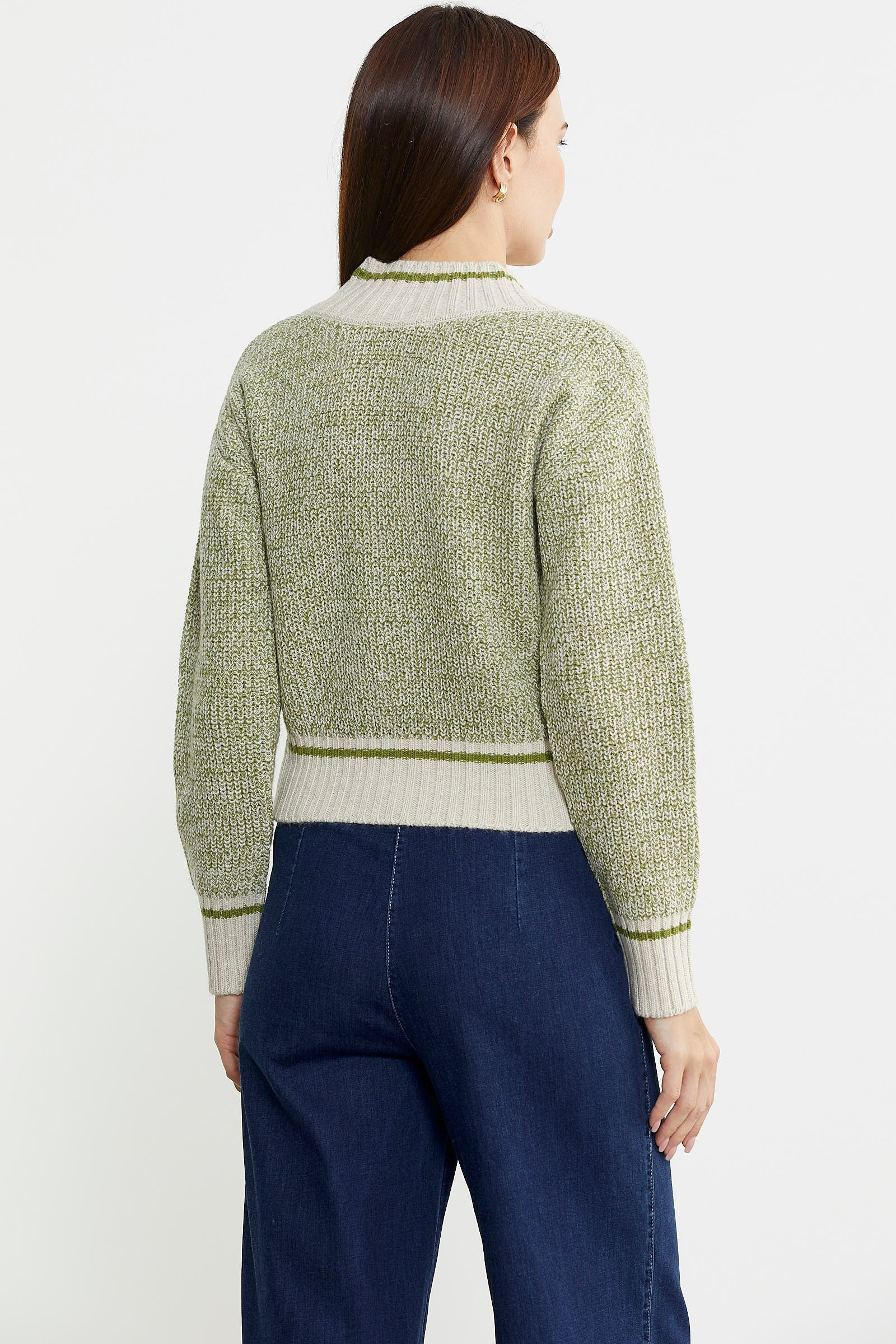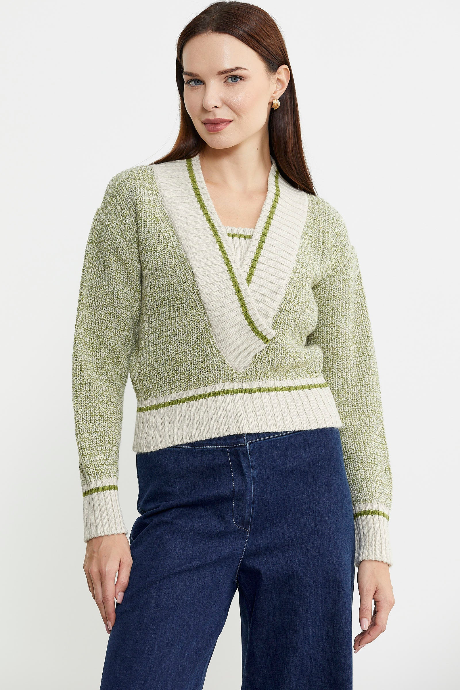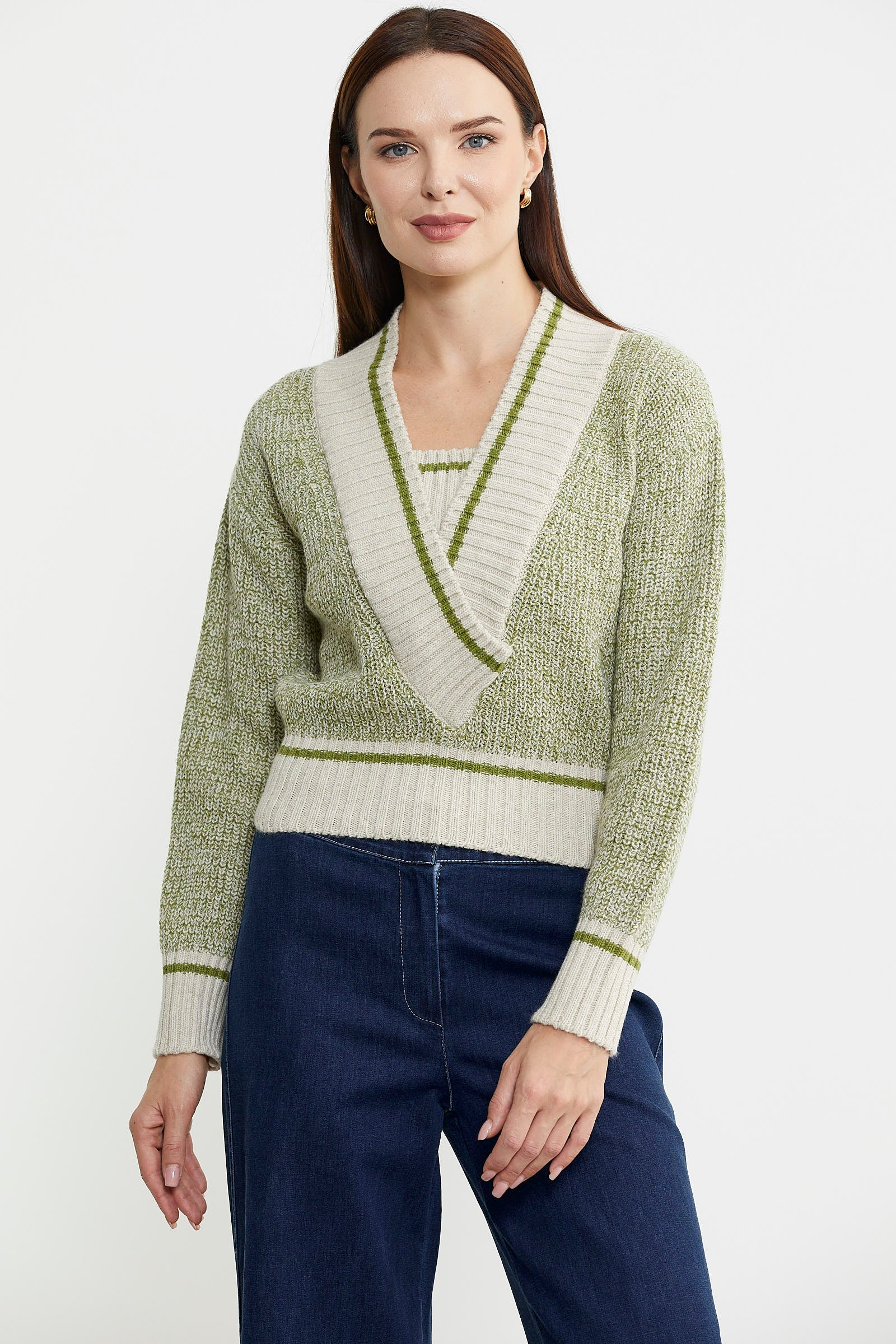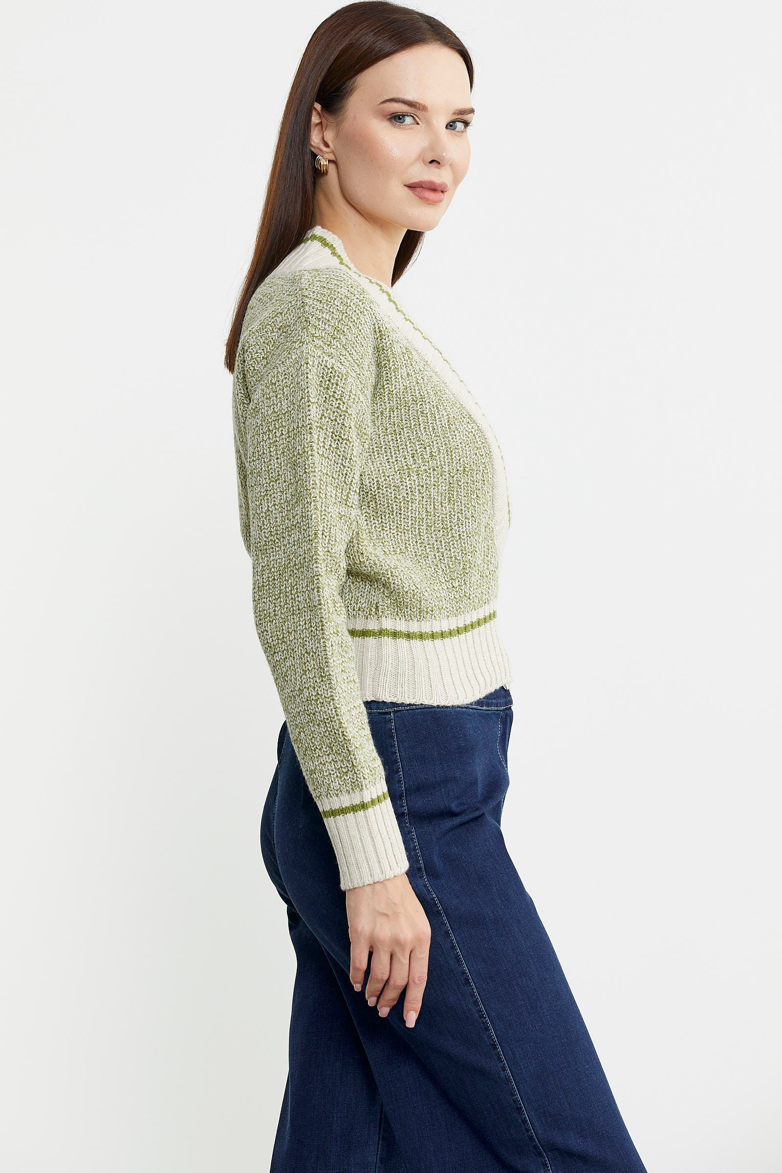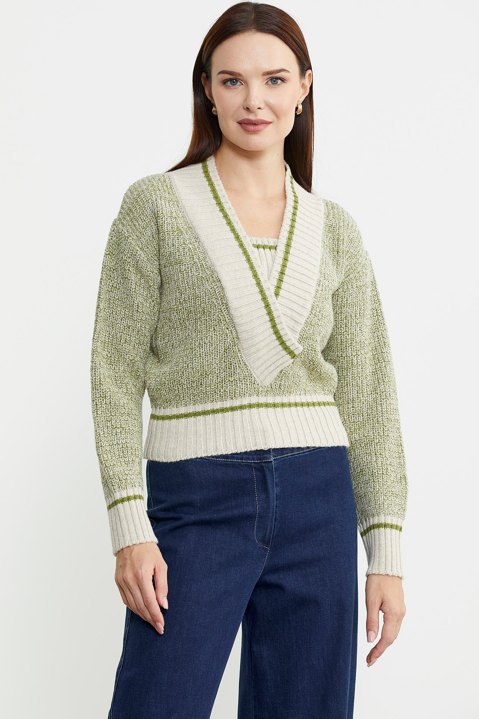 Derin V yaka formuna dahil edilen parçayla birlikte tüm bedende bütünlük sağlanmıştır. Yüksek oranda yün içermektedir.