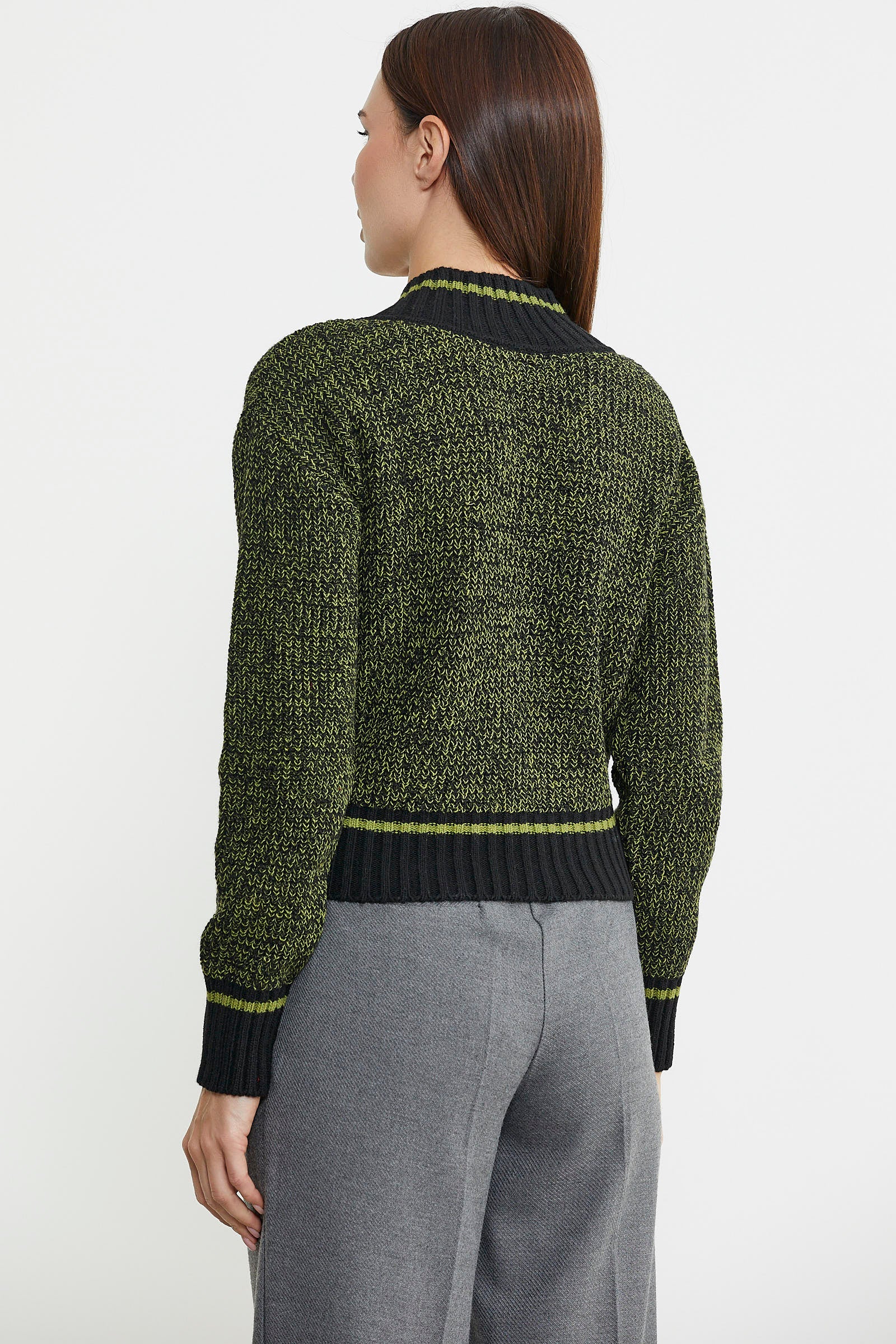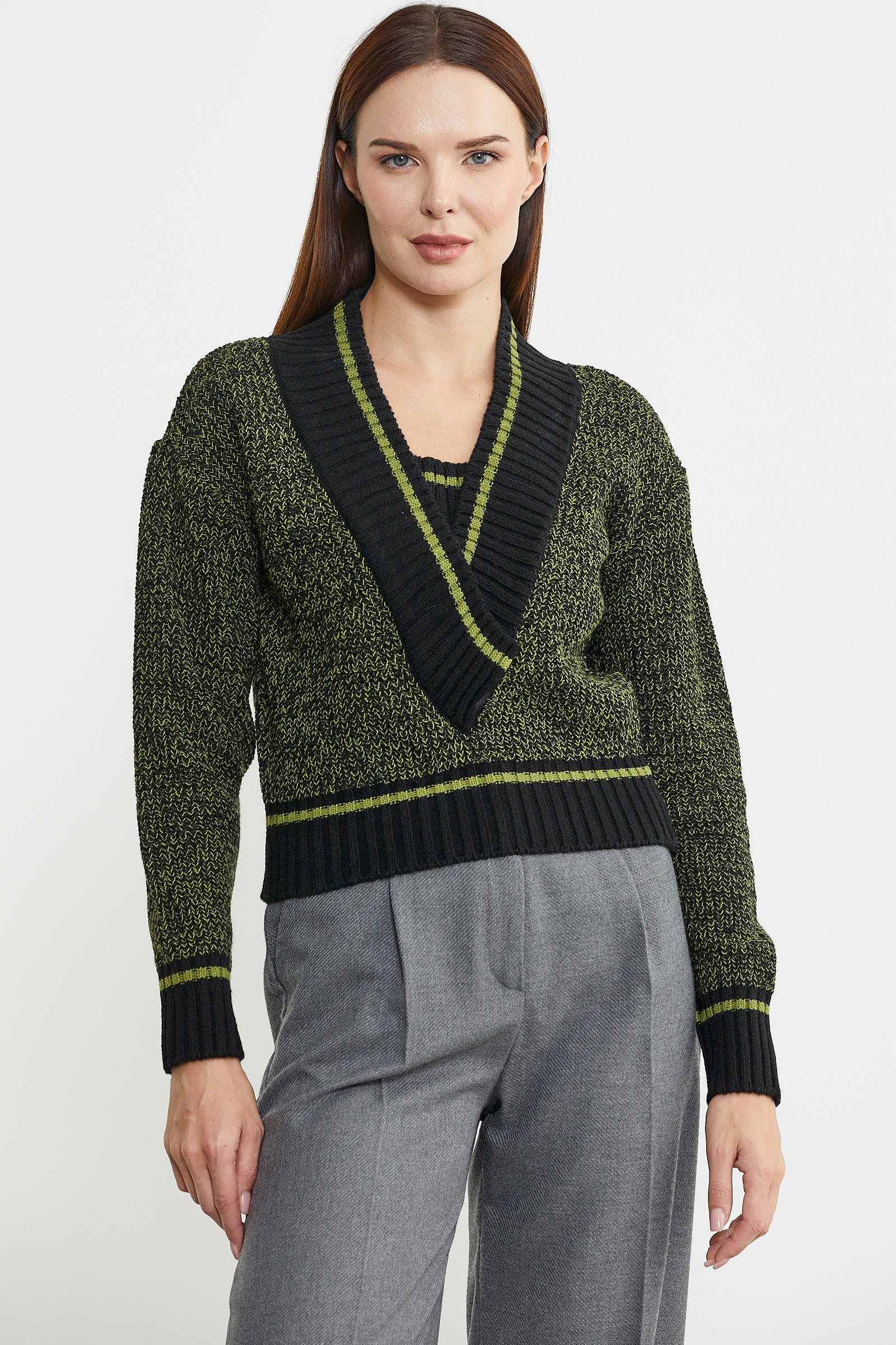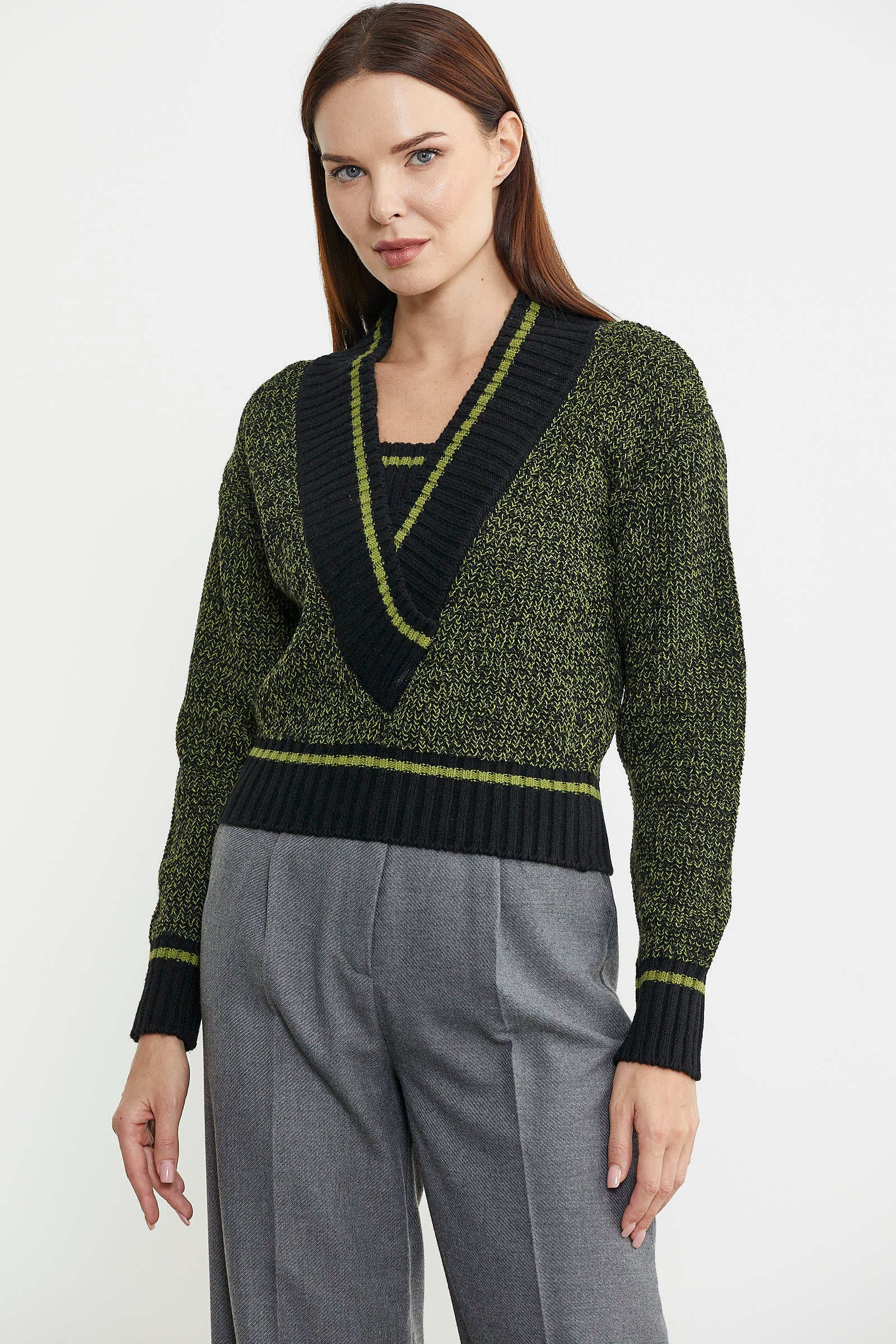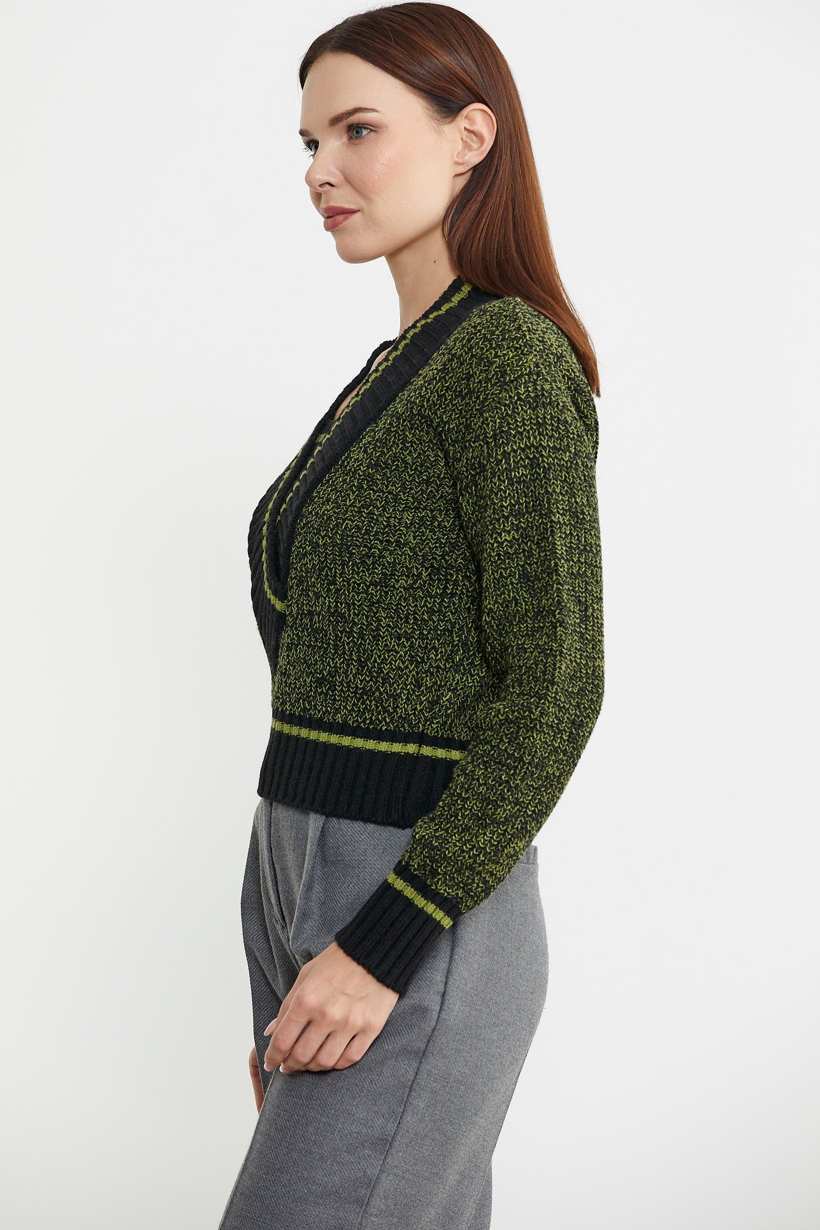Derin V yaka formuna dahil edilen parçayla birlikte tüm bedende bütünlük sağlanmıştır. Yüksek oranda yün içermektedir.